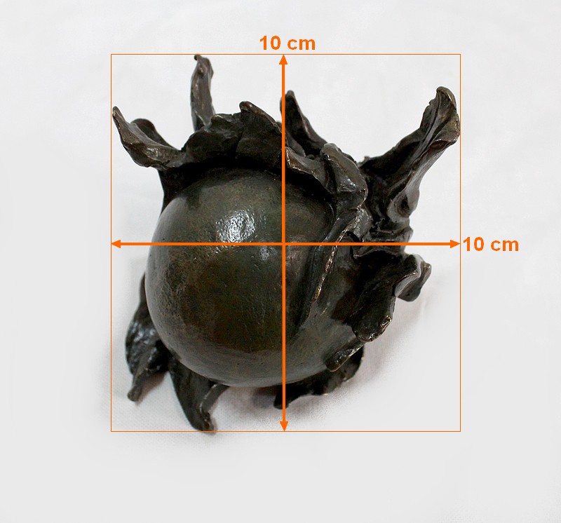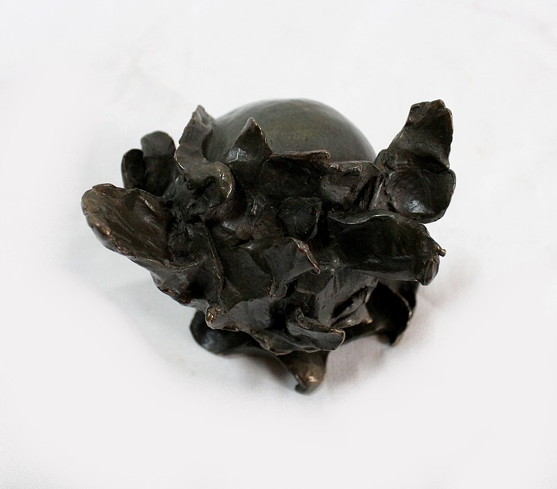 L’artiste représente ici une sphère lisse enveloppée de matière. Rappelant un fruit entouré de feuilles, l’œuvre en elle-même reste un mystère captivant.