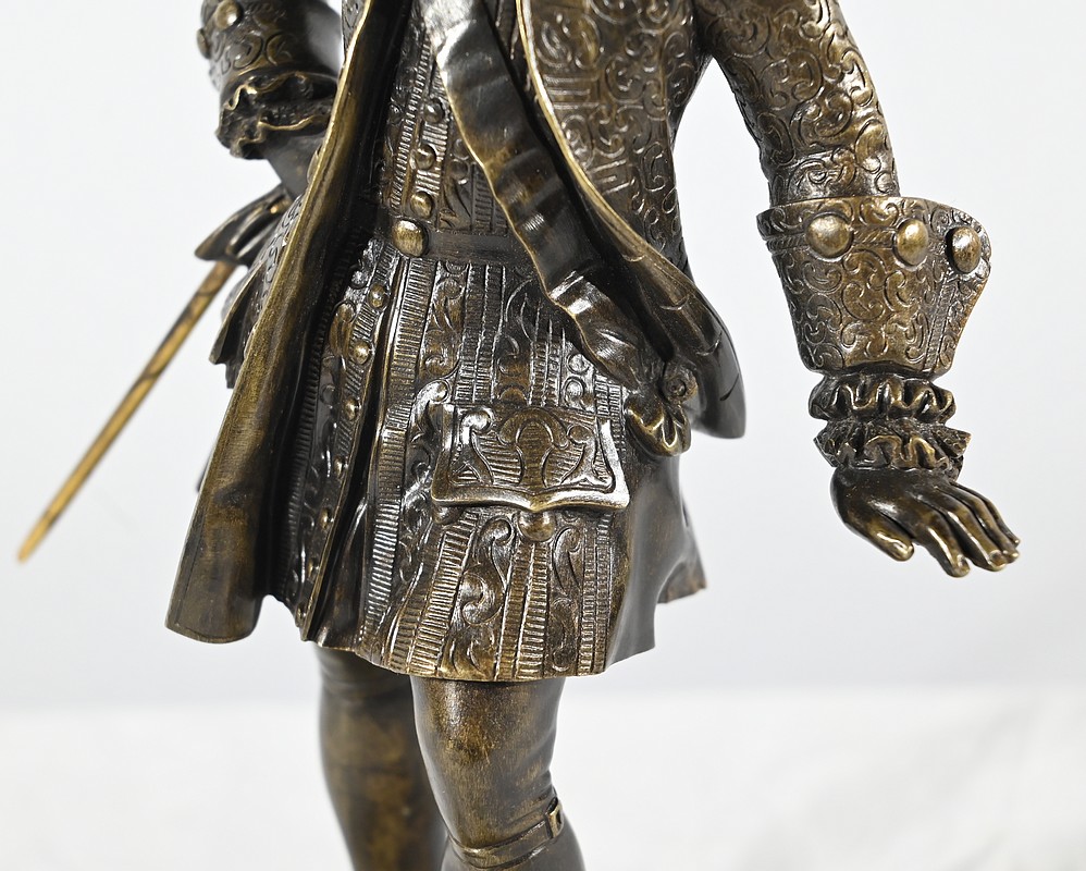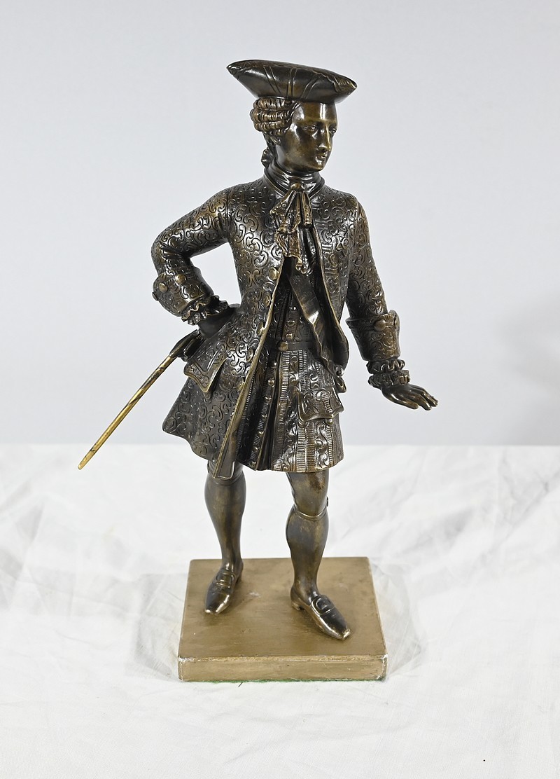 Épreuve en bronze patiné figurant un gentilhomme coiffé d’un tricorne et vêtu d’un costume que l’on imagine chamarré, agrémenté d’ornementations. En effet, sous Louis XV un justaucorps à basques est synonyme de richesse. Ces habits luxueux s’accompagnaient d’un tricorne élégant.