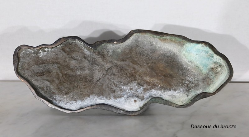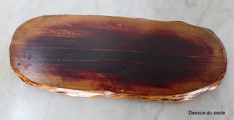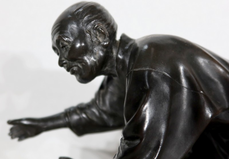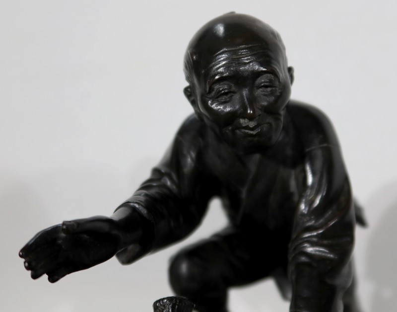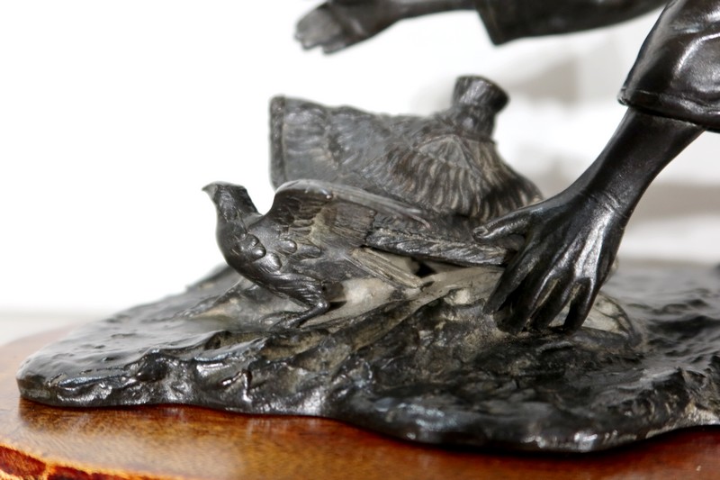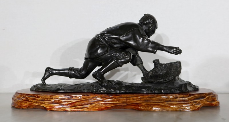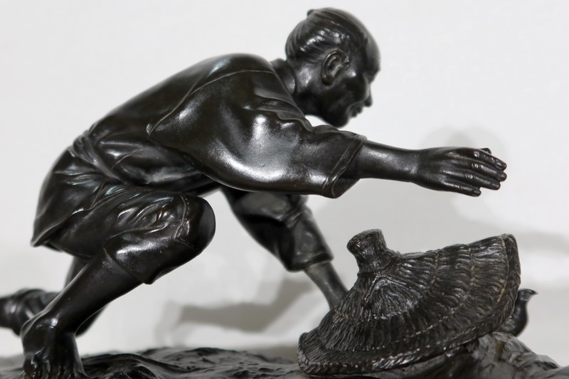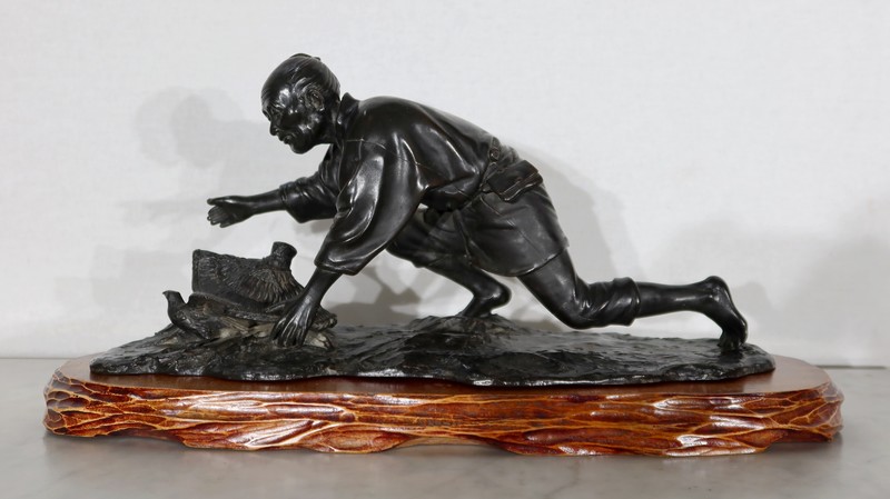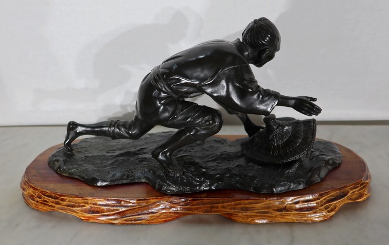 Charmant Bronze à patine brun foncé, représentant un paysan essayant de capturer un oiseau avec l’aide de son chapeau. L’homme aux traits asiatiques est en position accroupie, une jambe tendue vers l’arrière, comme s’il s’étirait soudainement afin de piéger le volatile. L’homme arbore le visage satisfait du chasseur sur le point de saisir sa proie. L’artiste a apposé son cachet sur la terrasse, en idéogramme. Ce bronze repose sur un socle en Acajou dit « Bois de Satin », joliment façonné.