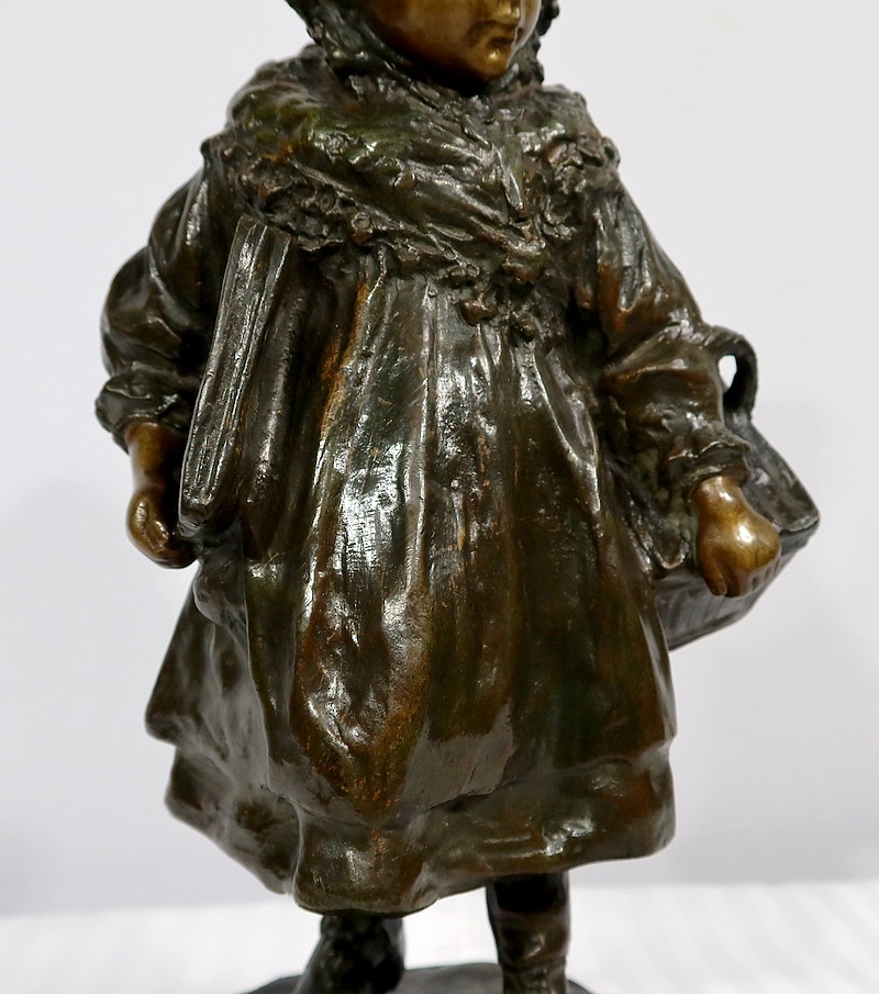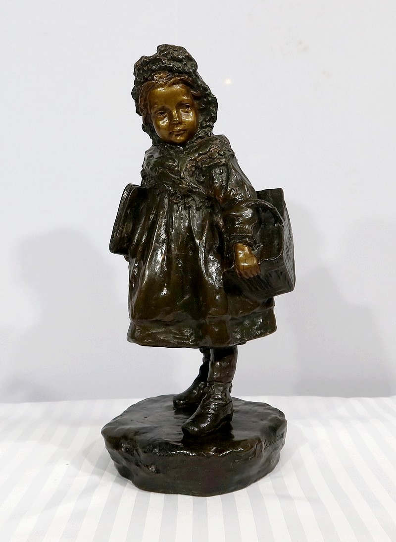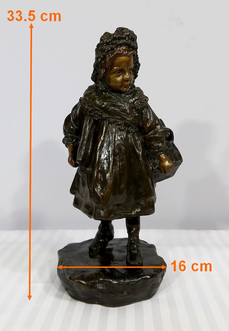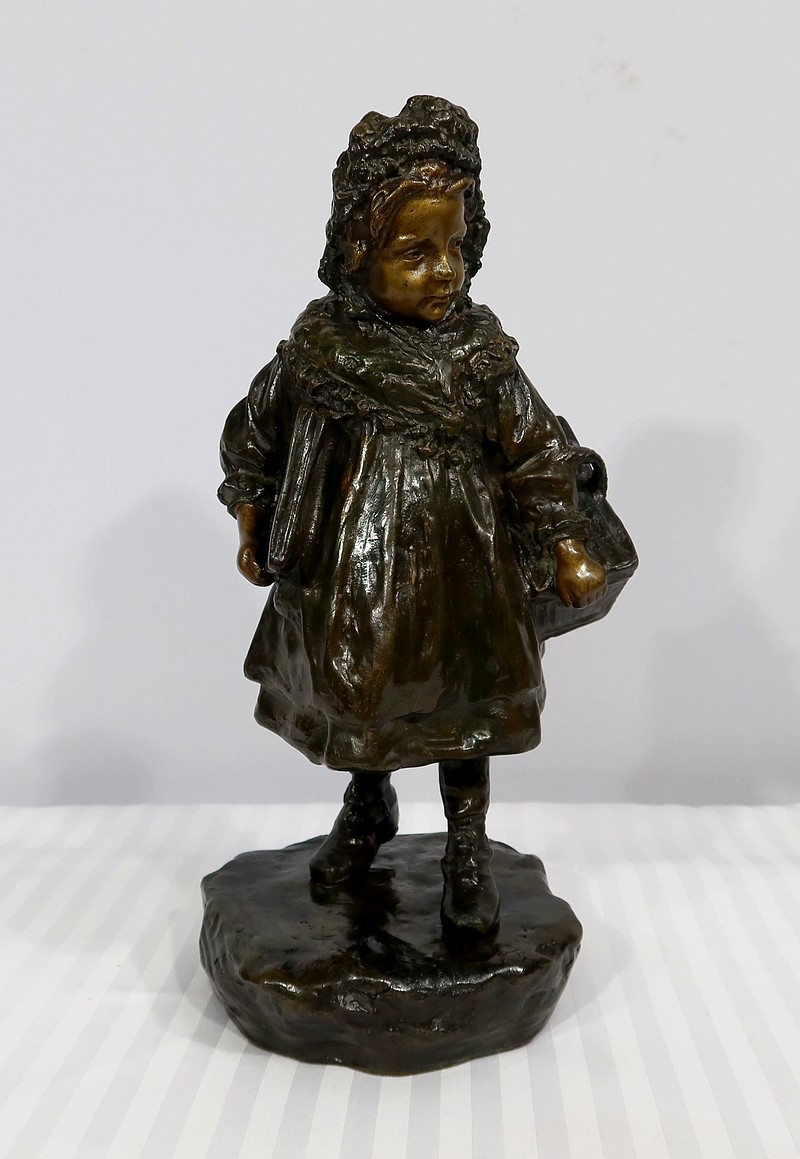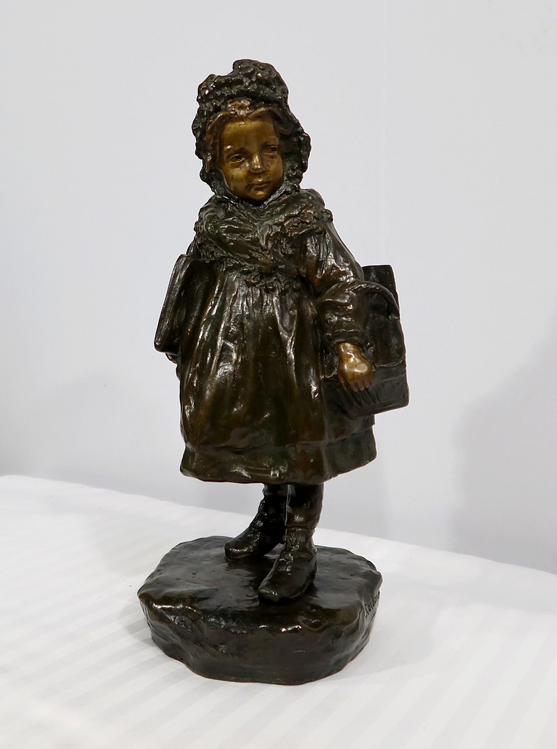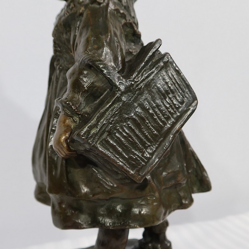 Cette œuvre figure une jeune enfant portant un panier repas et un livre. Sa petite taille les font paraître grands.