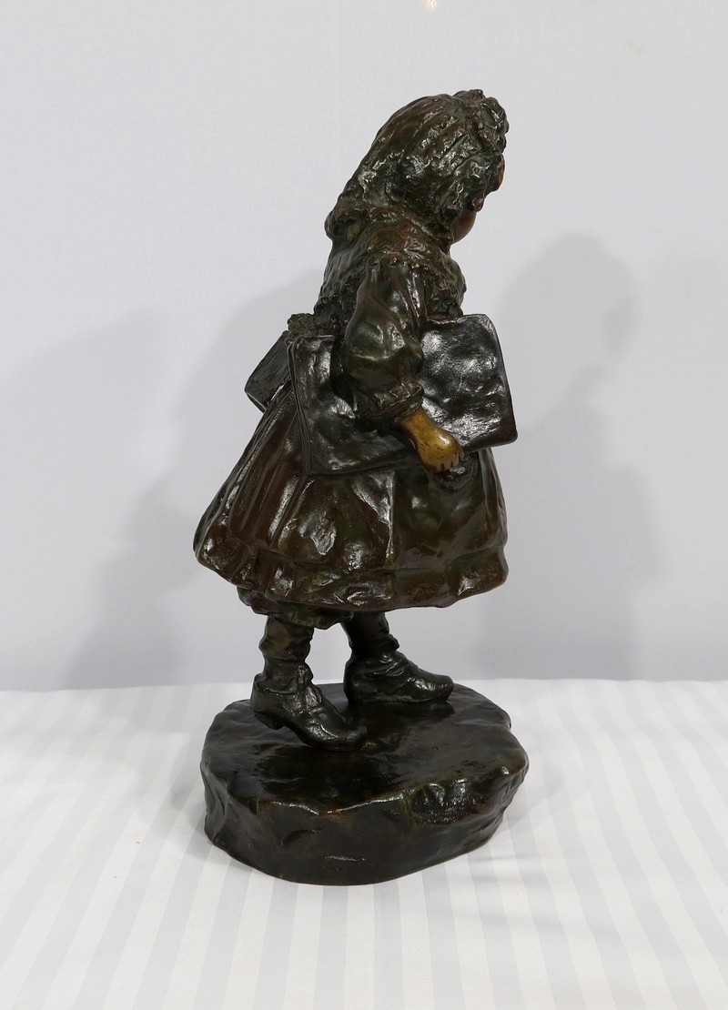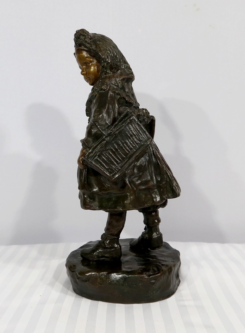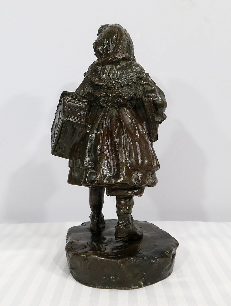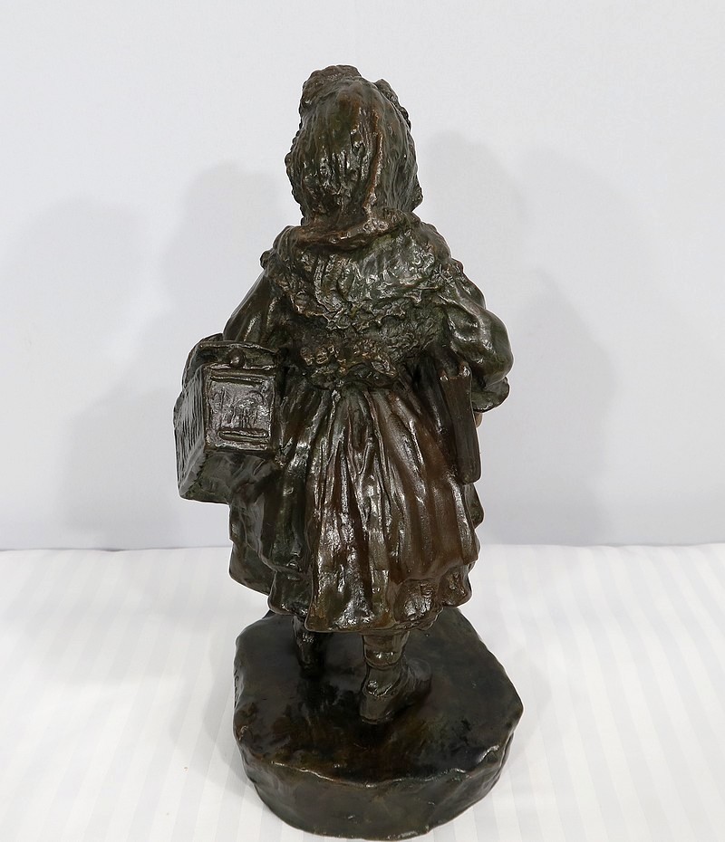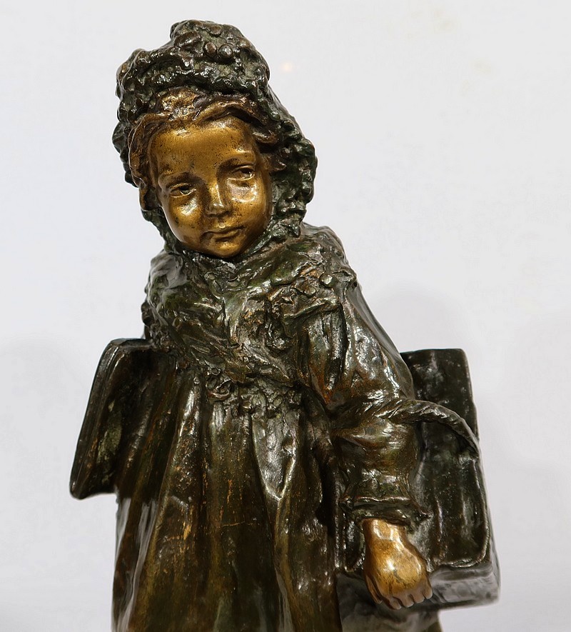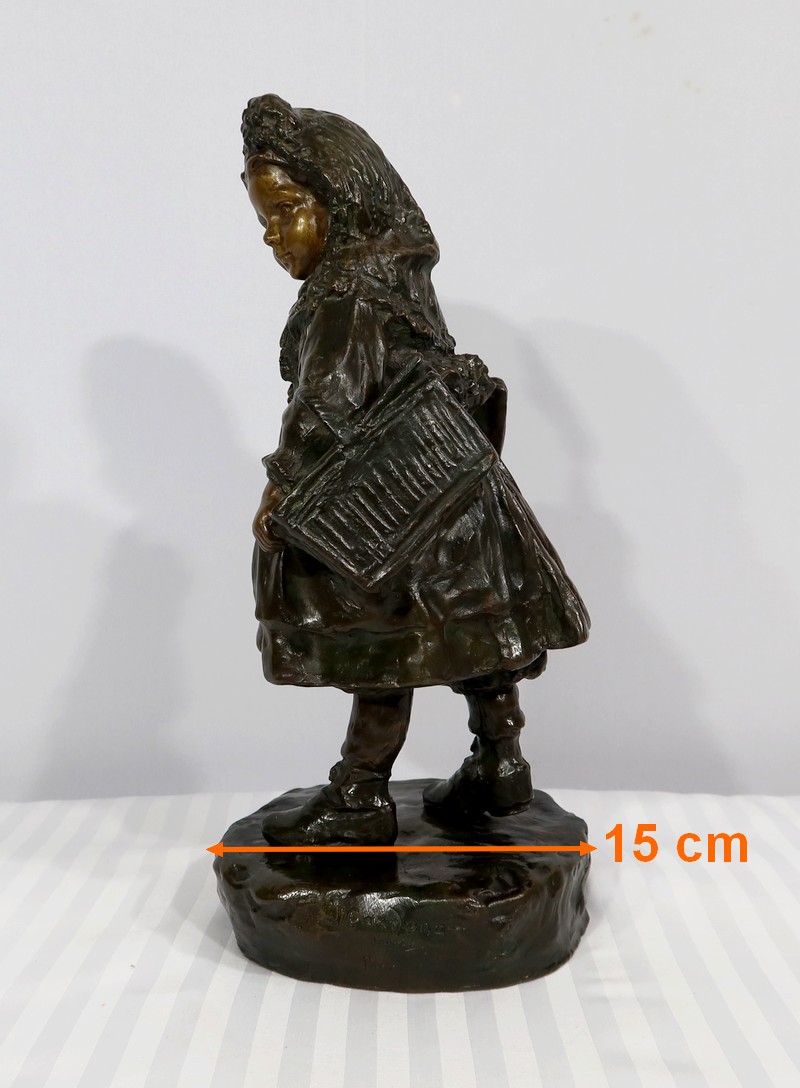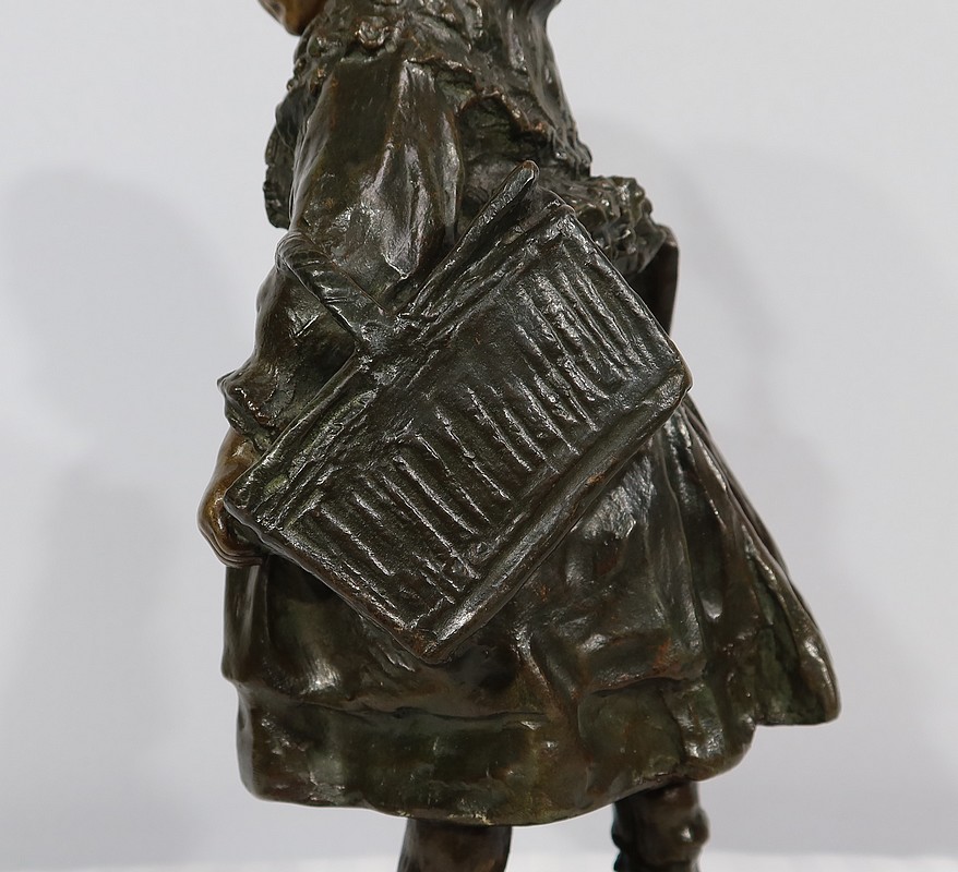 Cette œuvre figure une jeune enfant portant un panier repas et un livre. Sa petite taille les font paraître grands.