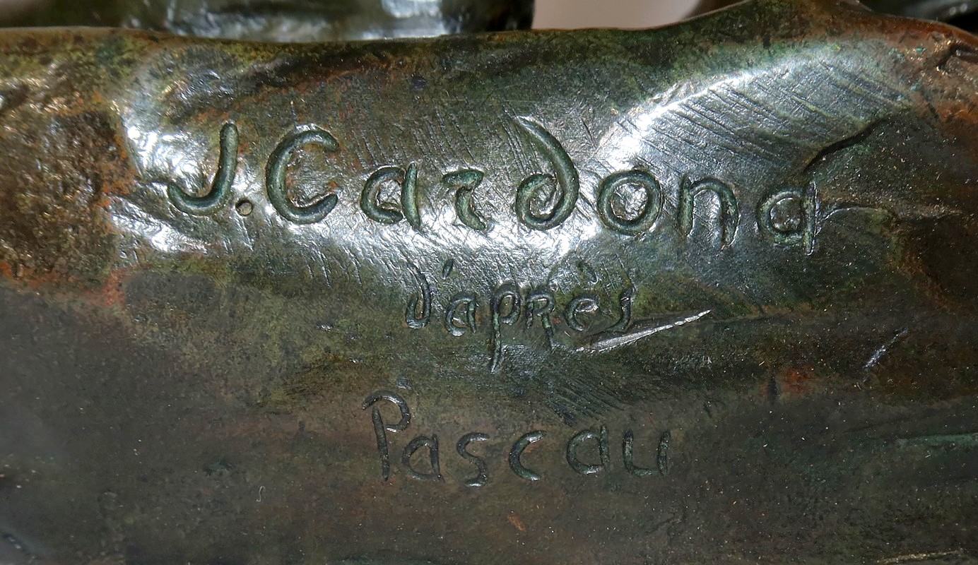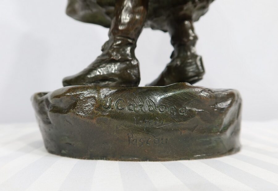 Épreuve en bronze à patine multicolore (médaille, brune et verte) signée José Cardona (1878-1922) sculpteur espagnol vivant à Paris durant la Belle Époque. Il obtient une mention honorable au Salon des Artistes Français de 1906.