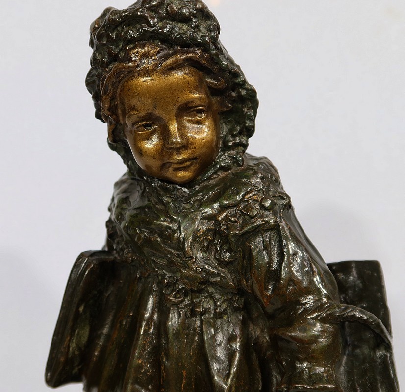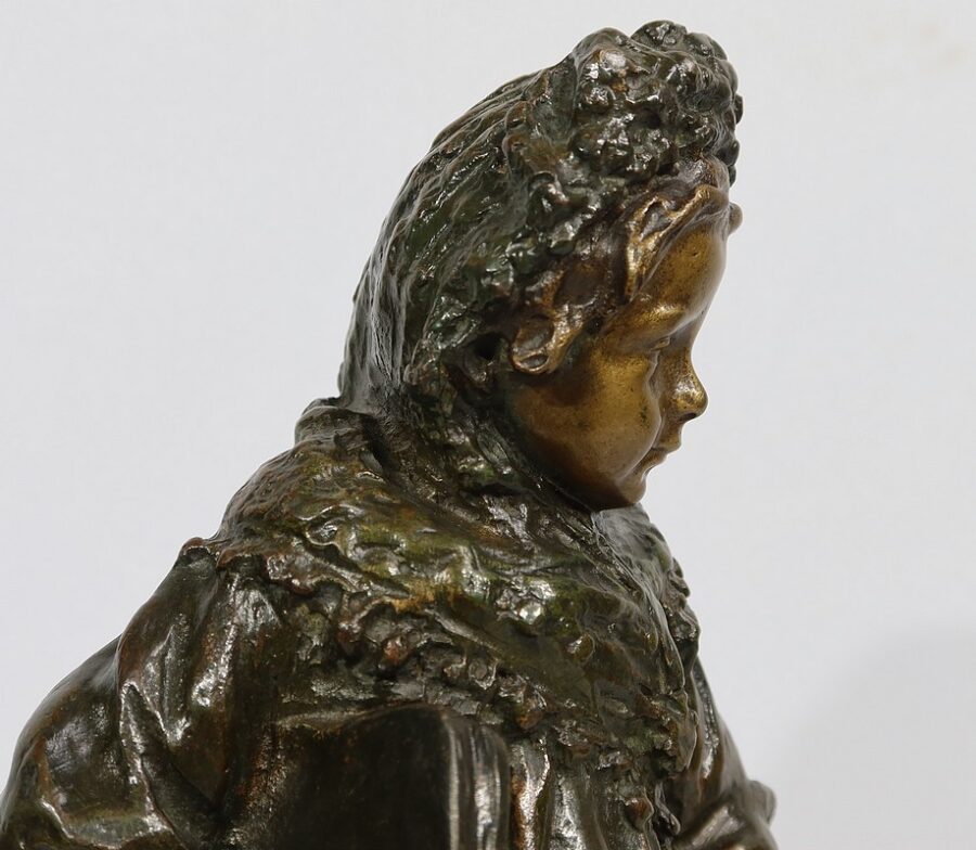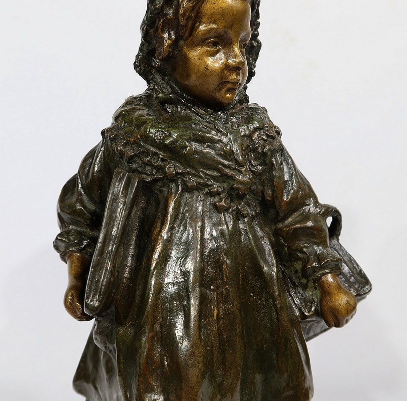 Son visage mis en valeur par sa belle patine médaille, l’enfant esquisse un sourire. Elle tourne sa tête et ses yeux vers la gauche dans une moue adorable.