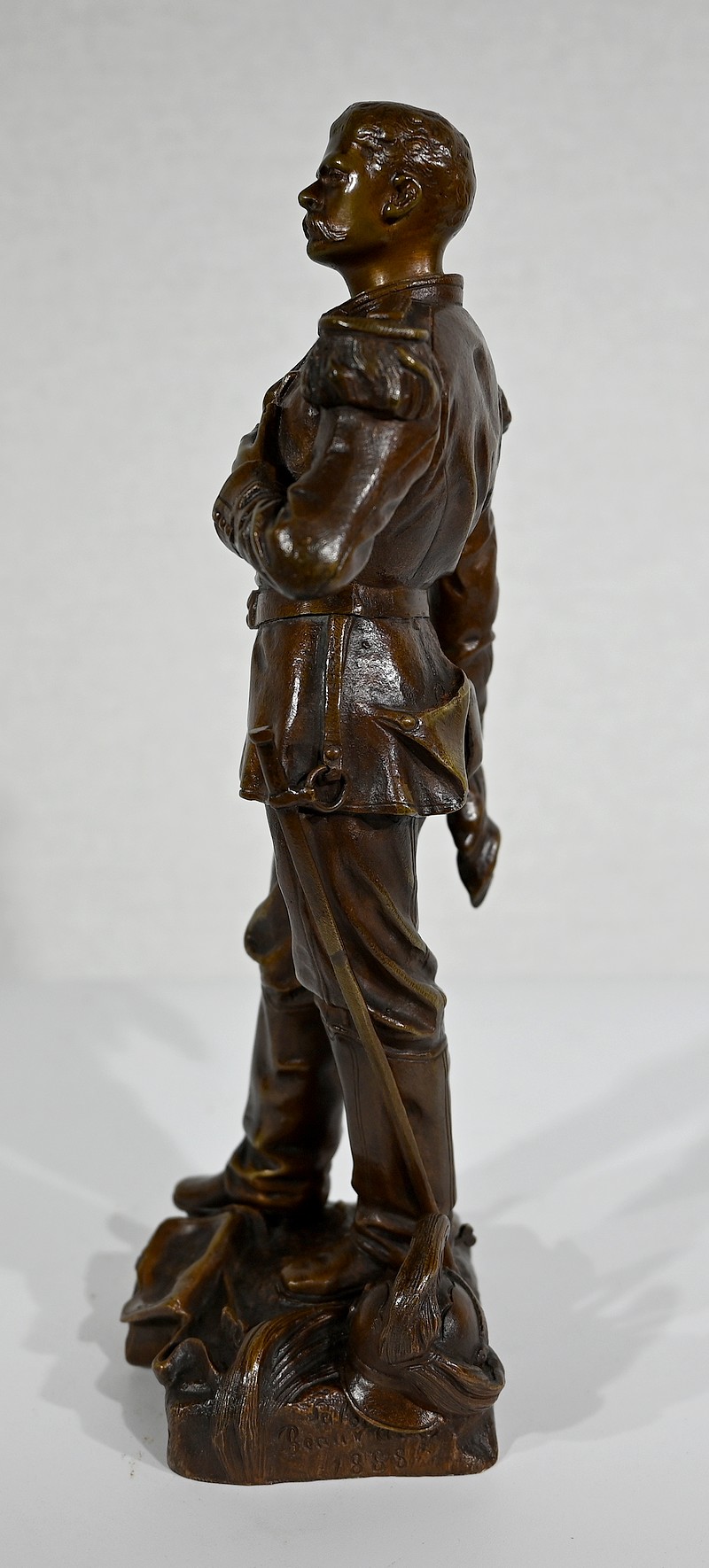 Sujet en bronze à patine médaille signé Charles Anfrie (1833-1905), figurant un militaire chargé de faire passer les messages durant la guerre franco-prussienne de 1870.