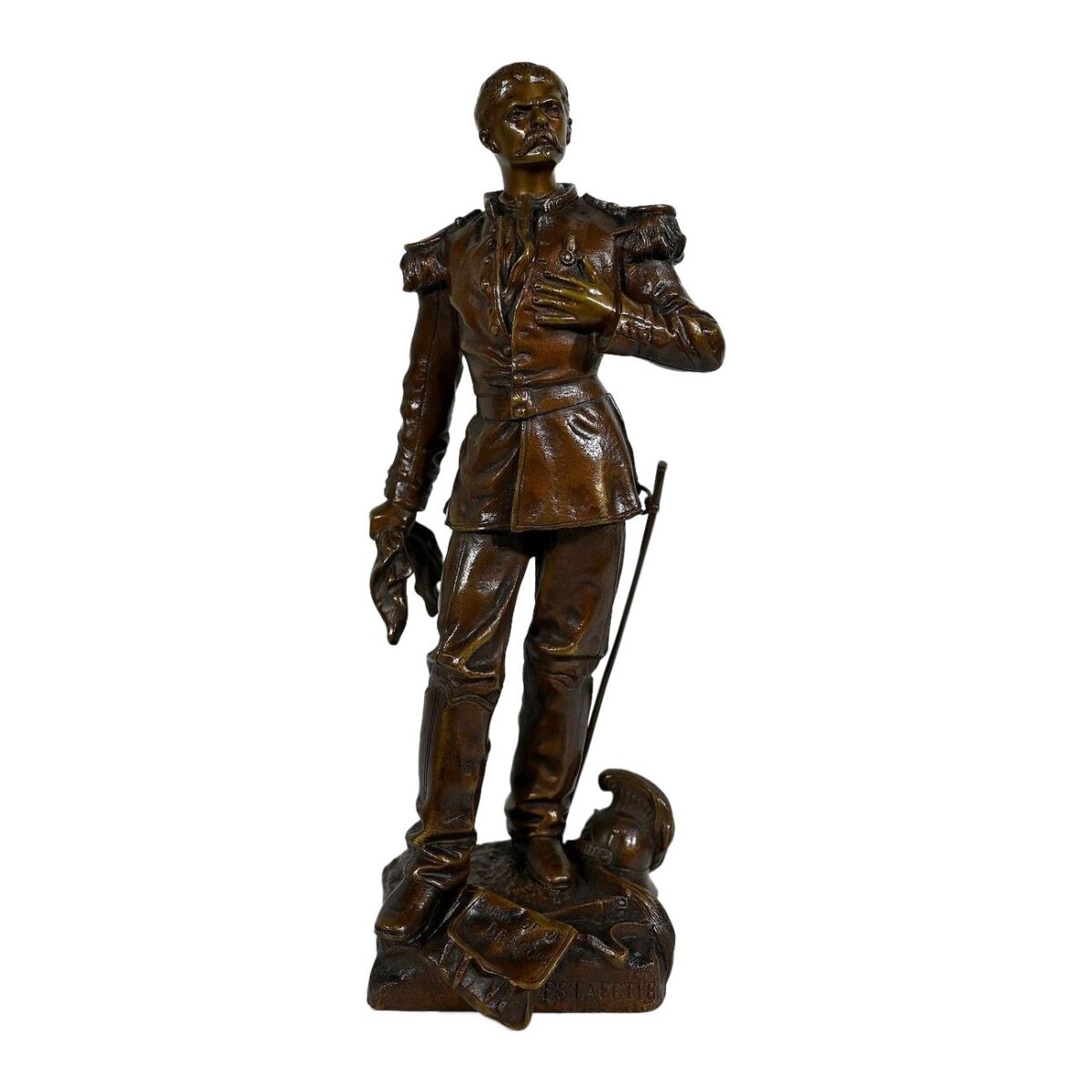 Titré « Estafette – 3. Brigade de Dragons » avec la mention « Salon des Beaux Arts 1888 », ce bronze représente un homme élégant, la tête haute et la main sur le cœur. Son casque et son havresac à ses pieds.
