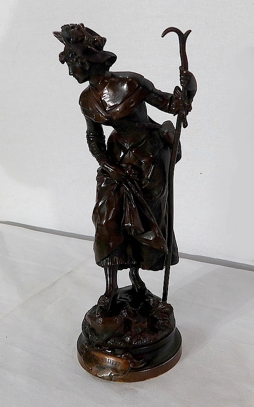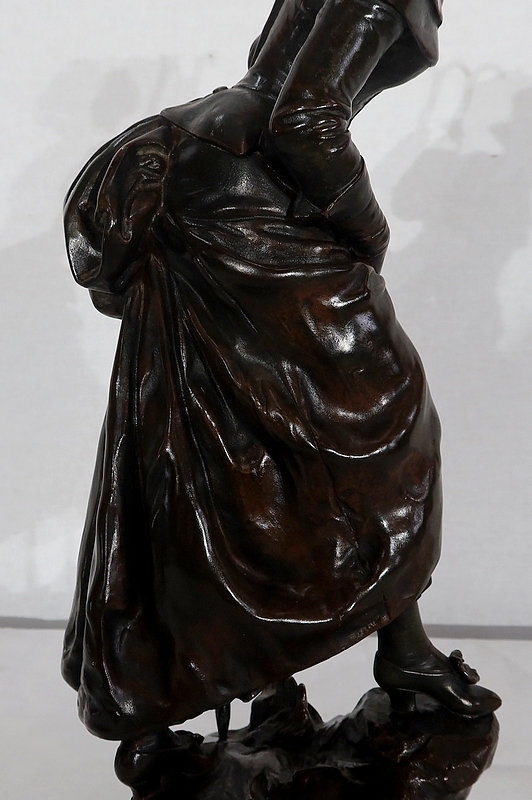 Belle et grande épreuve à patine brune d’Adrien Etienne Gaudez (1845-1902) représentant Miss Helyett parcourant un sentier de montagne.