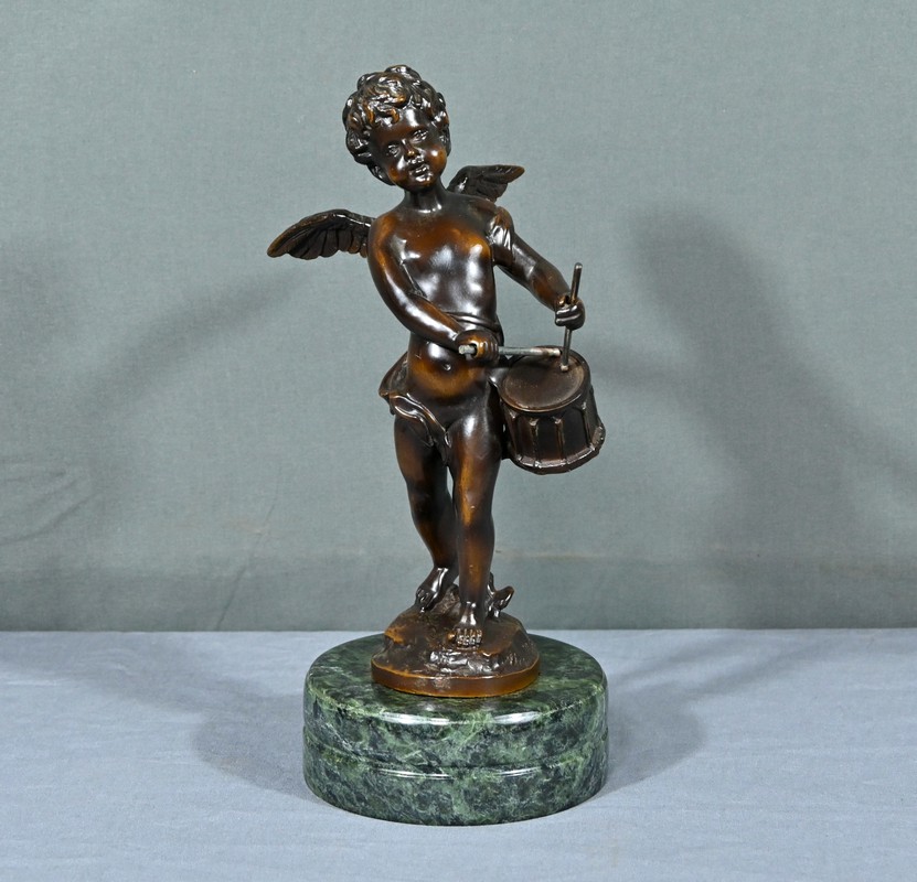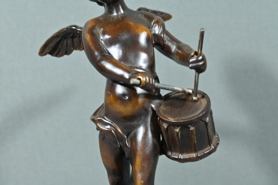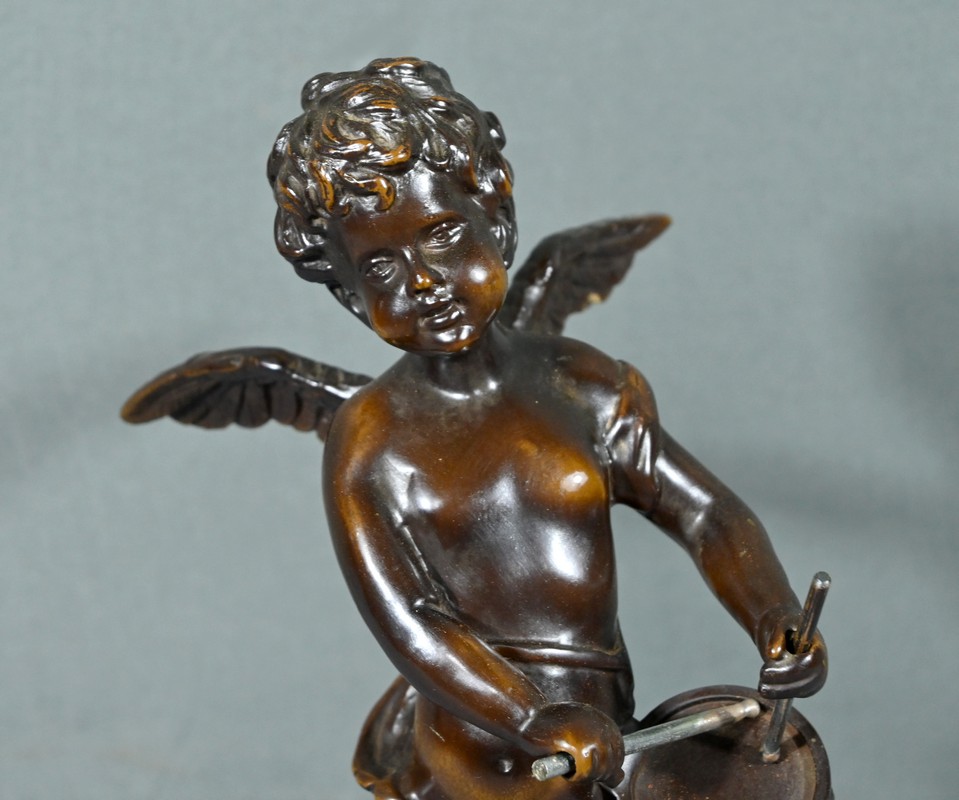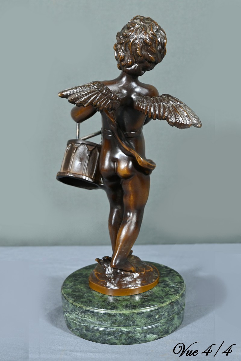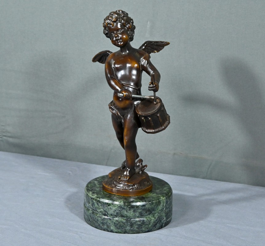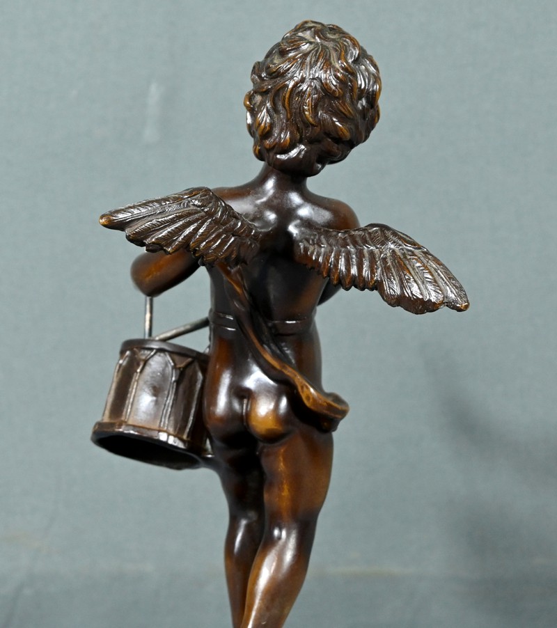 La sculpture en bronze signée Auguste Moreau (1834-1917) représente un putto au tambourin.