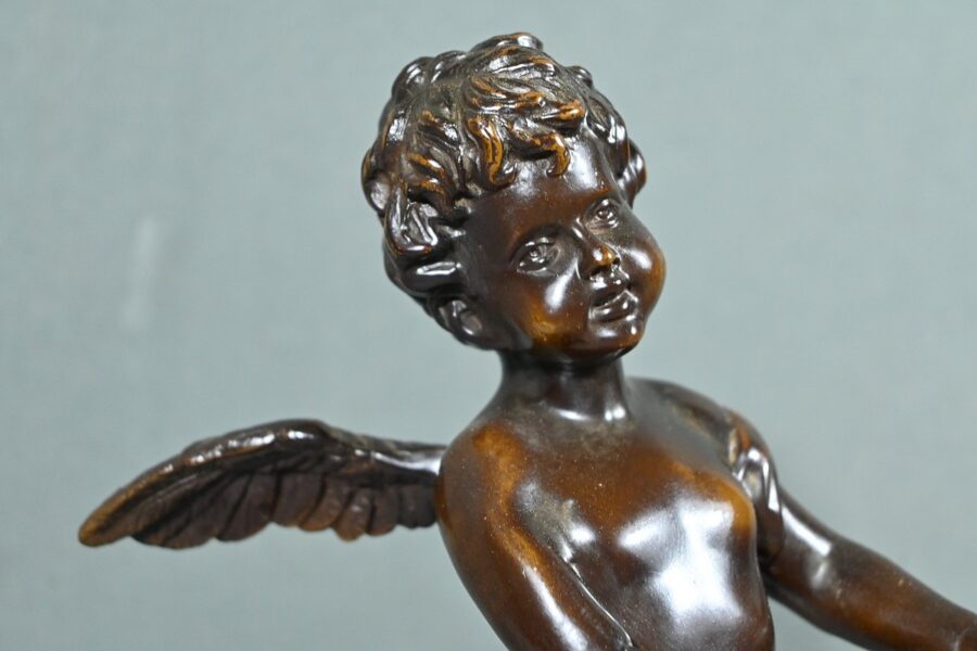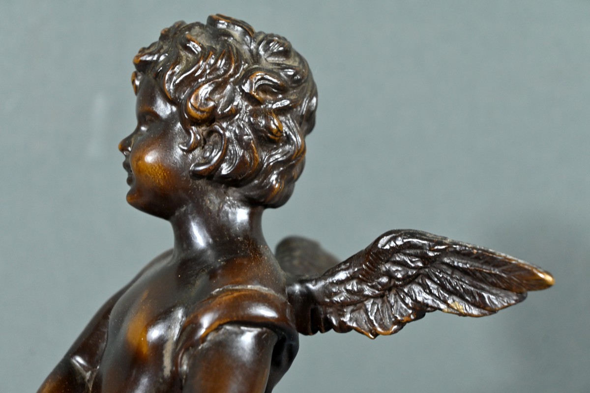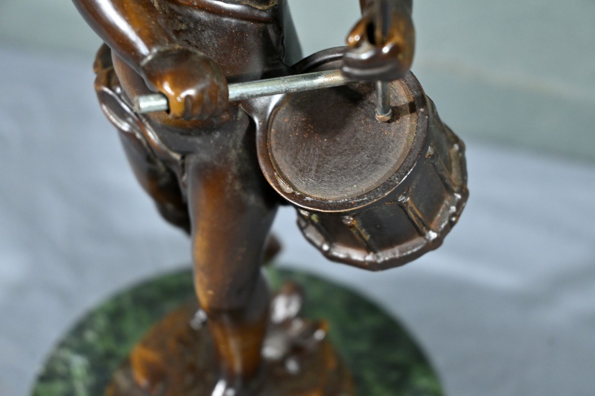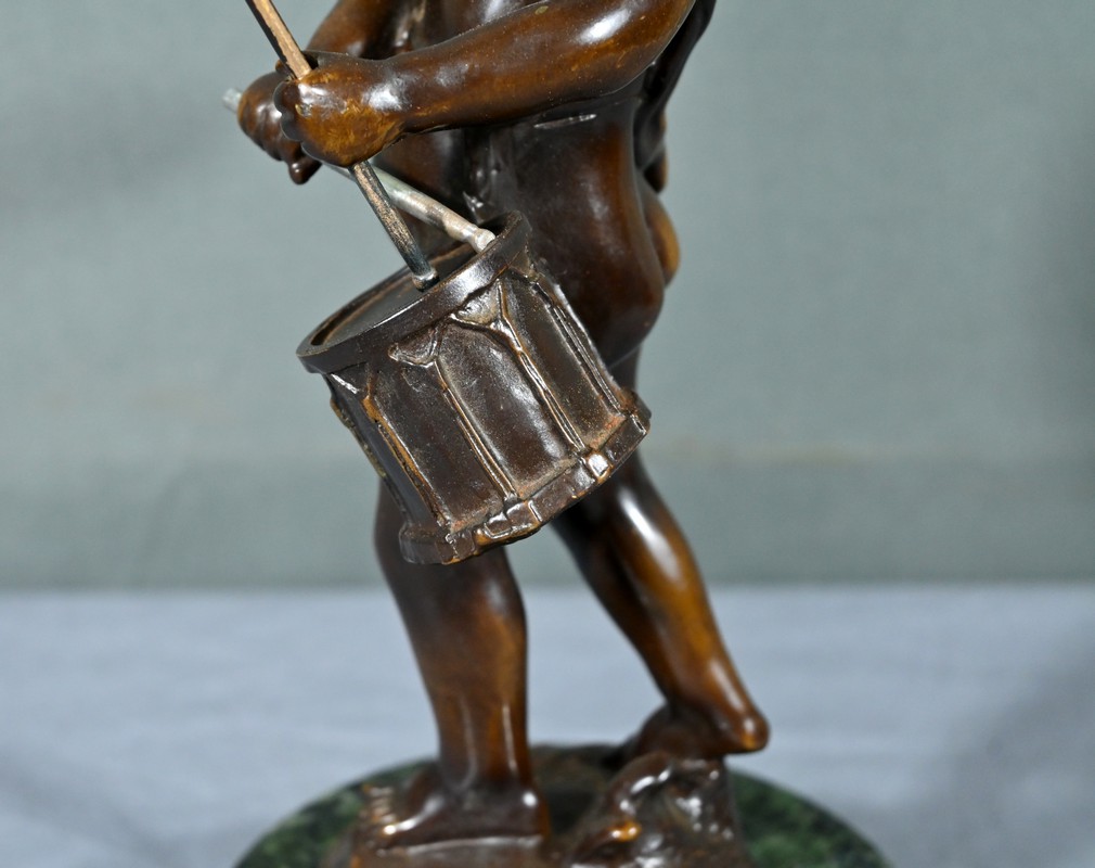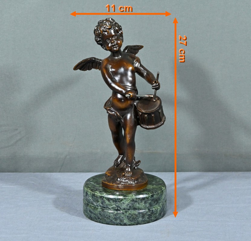 La sculpture en bronze signée Auguste Moreau (1834-1917) représente un putto au tambourin.