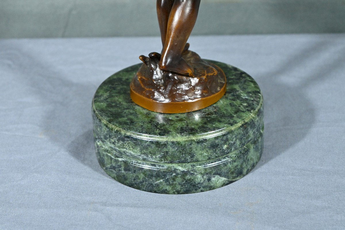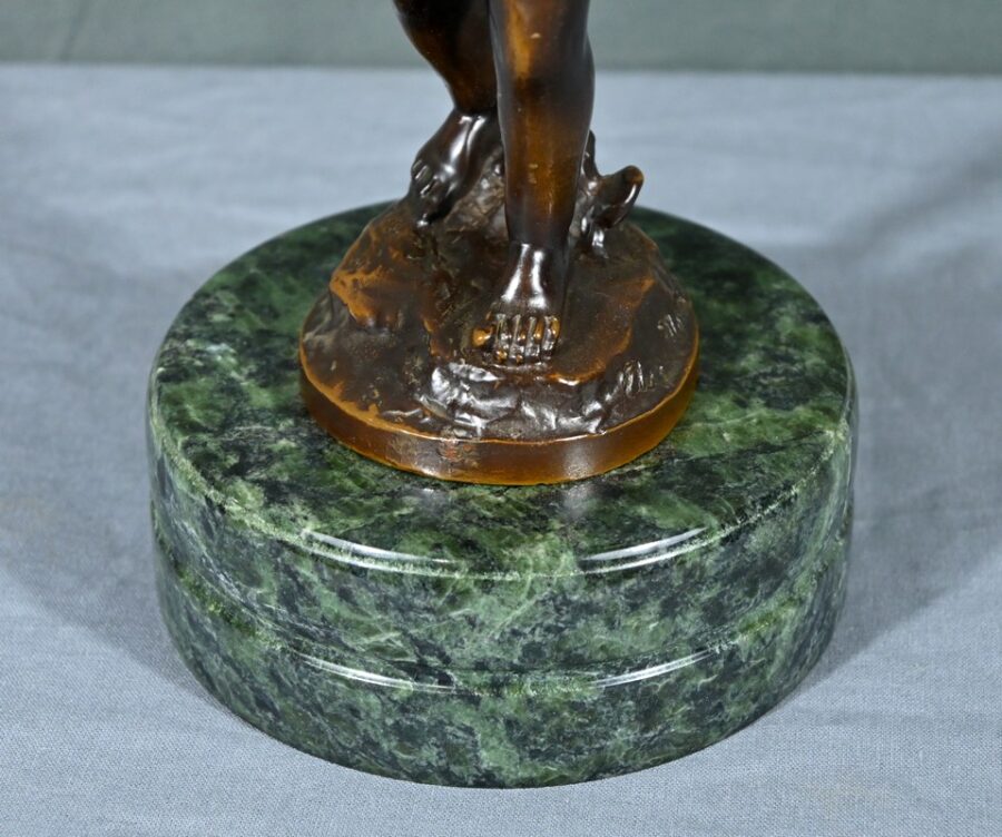 La sculpture repose sur un socle circulaire en marbre maurin, qui ajoute une touche d’élégance et de stabilité à l’œuvre.