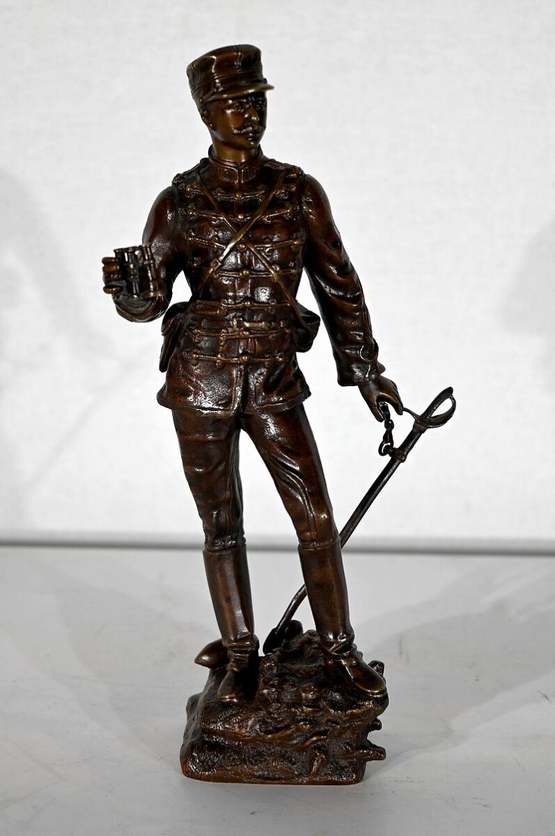 L’œuvre, titrée sur la terrasse ‘’Sur la Brèche’’, représente un lieutenant du 12e régiment de Hussards, bien reconnaissable à son uniforme orné de brandebourgs.