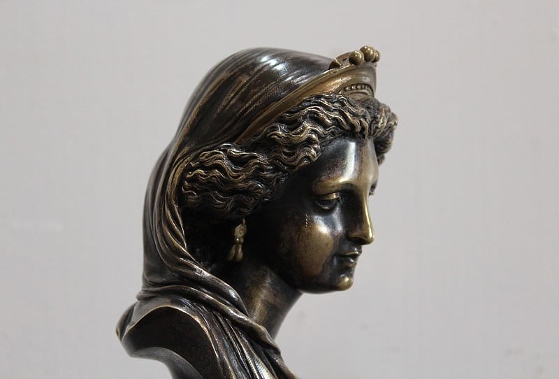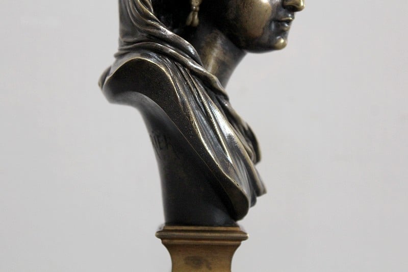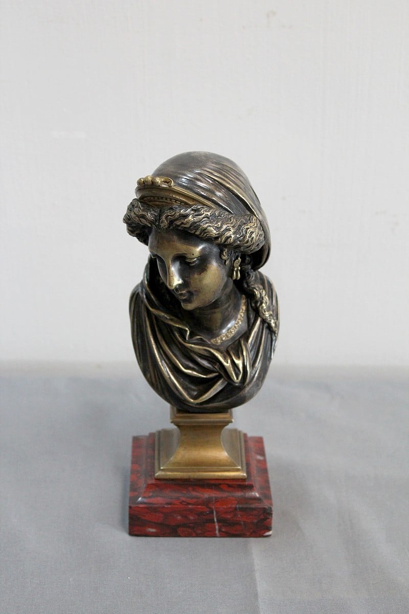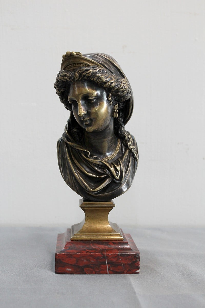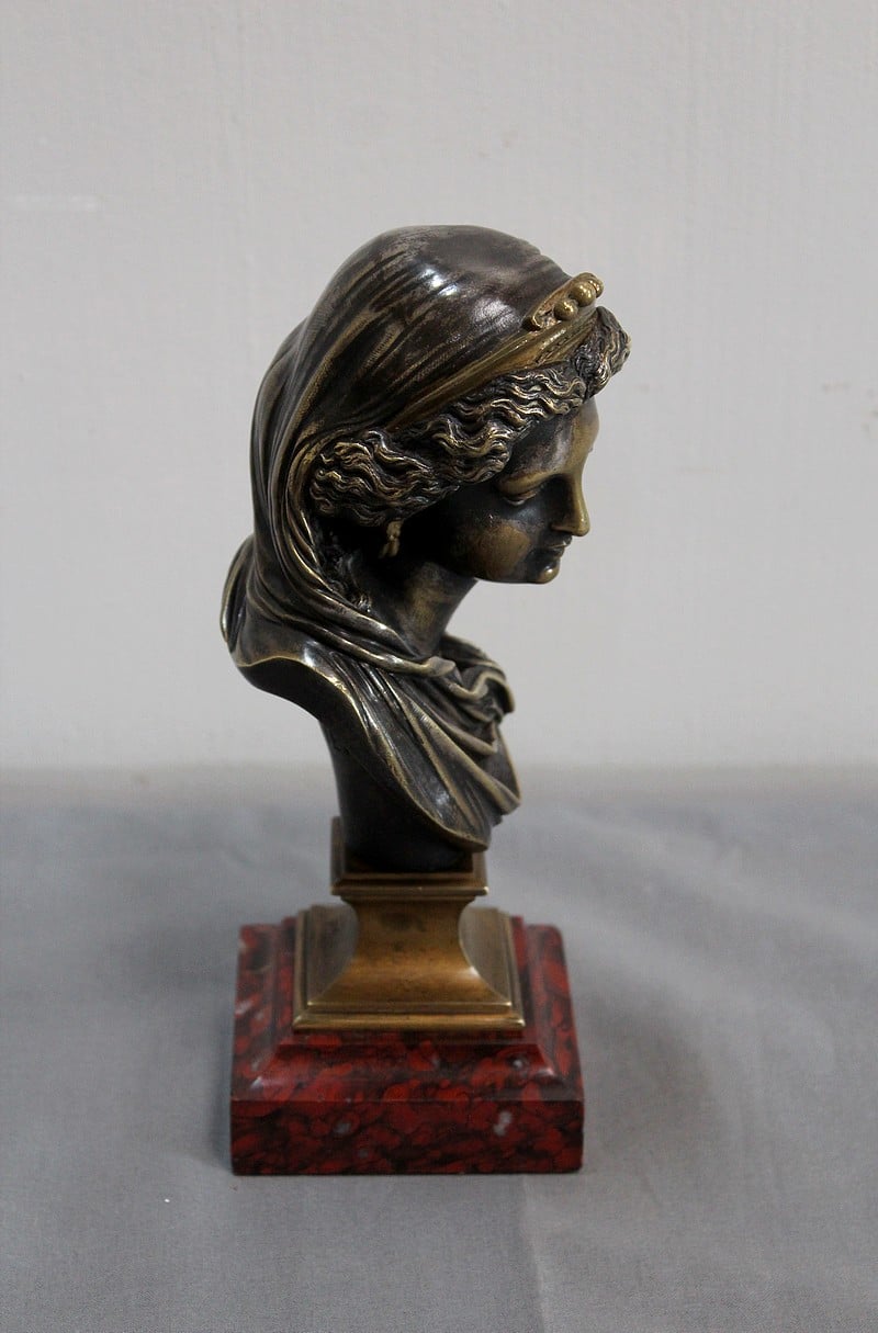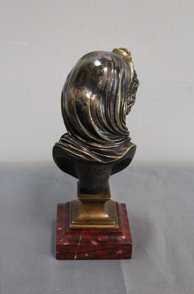 Il représente le buste d’une femme opulente couverte d’un fin voile et coiffée d’un diadème, dans un goût antique.