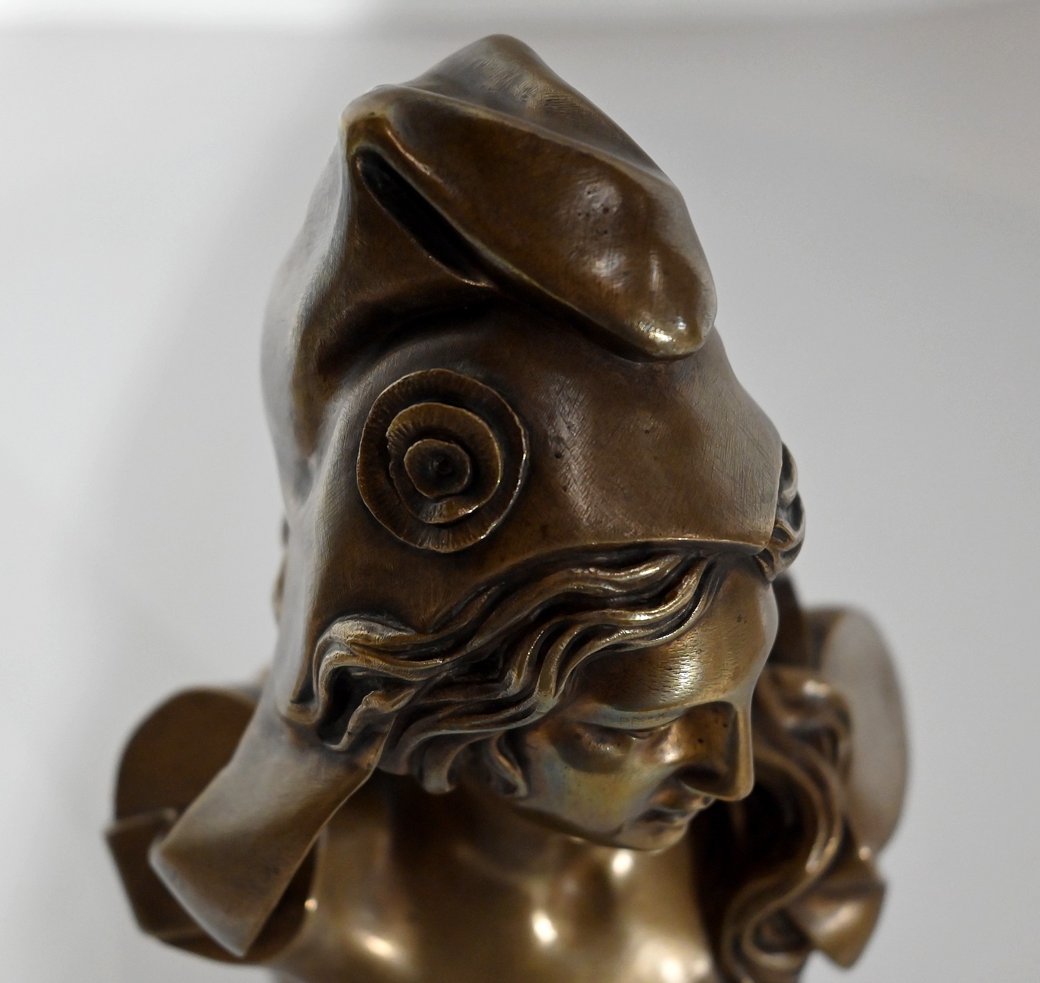 Buste à l’Antique de Marianne, en bronze doré, allégorie de la République Française, reposant sur un piédouche. Cette représentation est parée d’un bonnet phrygien aux longues oreilles, symbole de liberté, accessoire des esclaves affranchis.