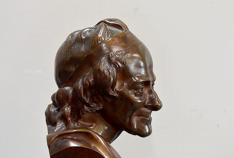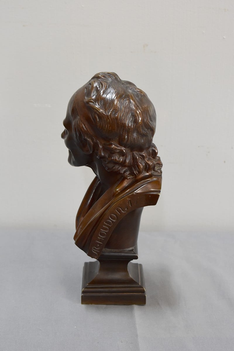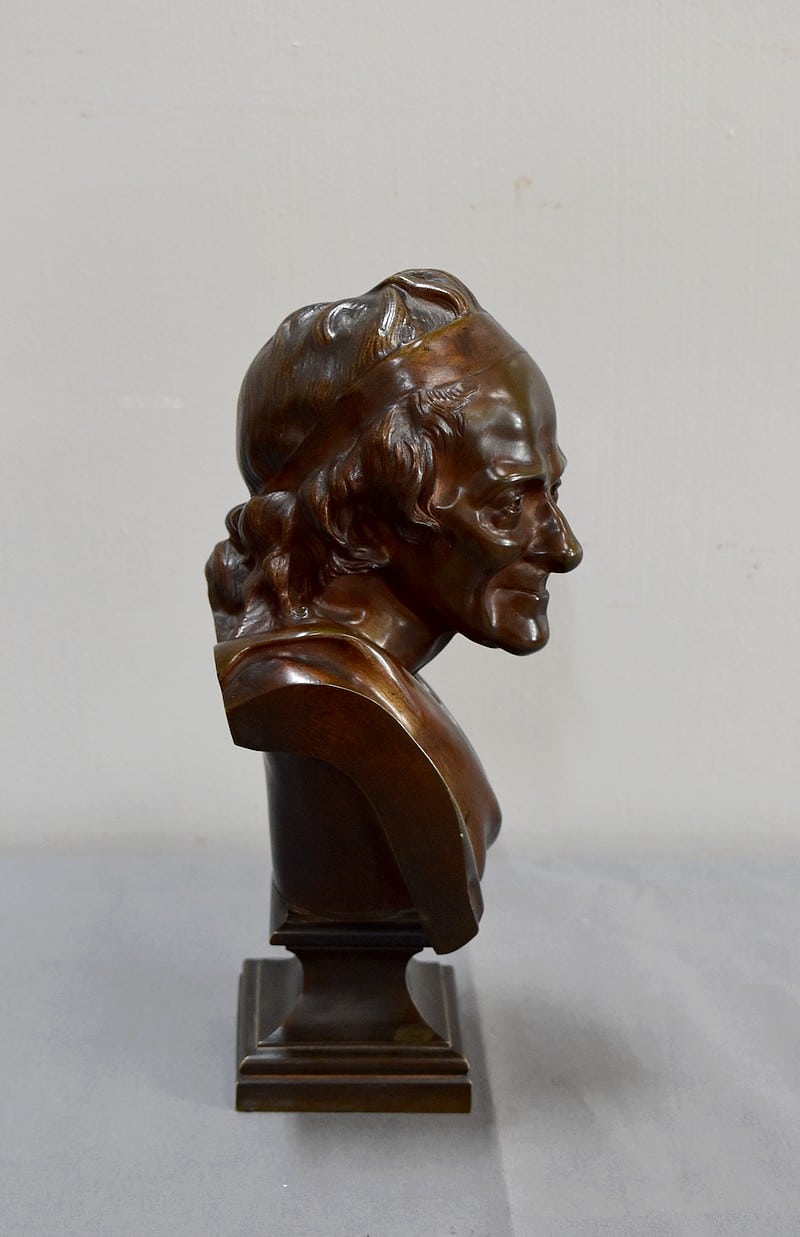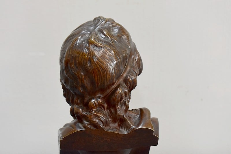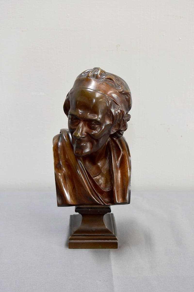 Buste de Voltaire d’après une sculpture de Jean-Antoine HOUDON (1741-1828) en bronze à patine brune.