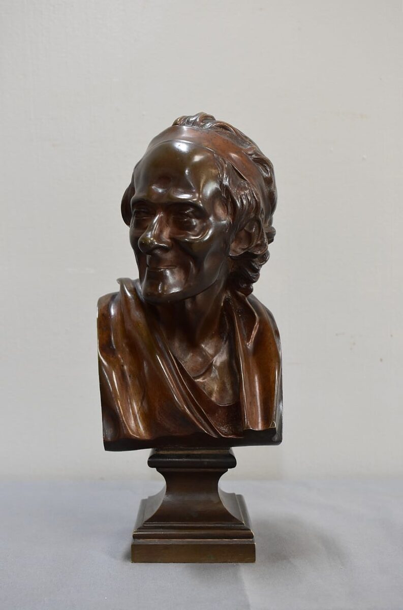Buste de Voltaire d’après une sculpture de Jean-Antoine HOUDON (1741-1828) en bronze à patine brune.