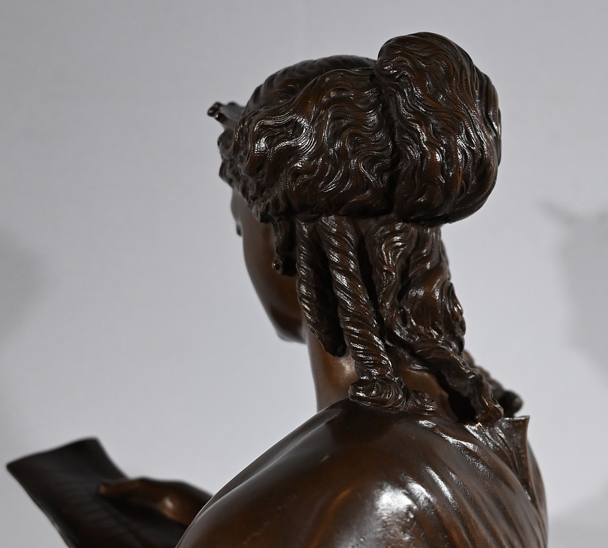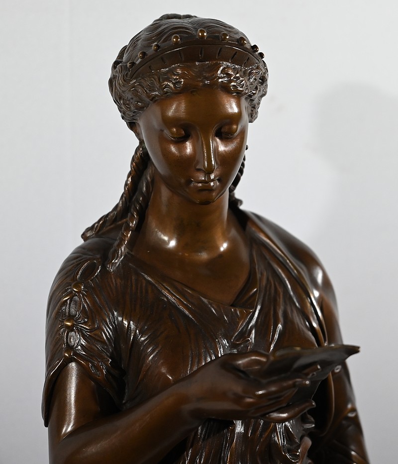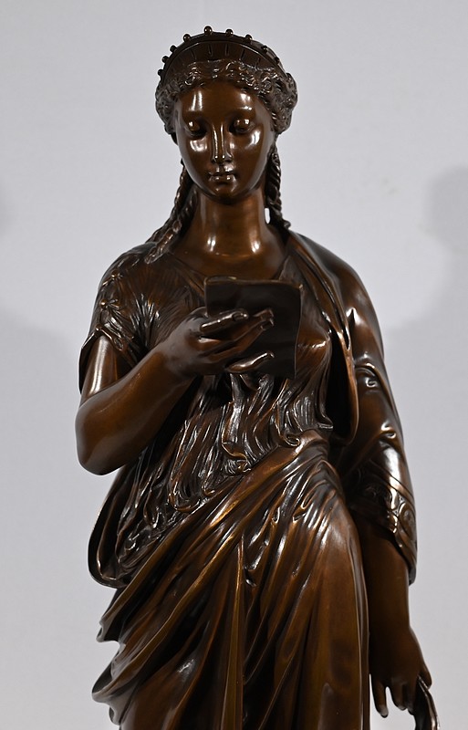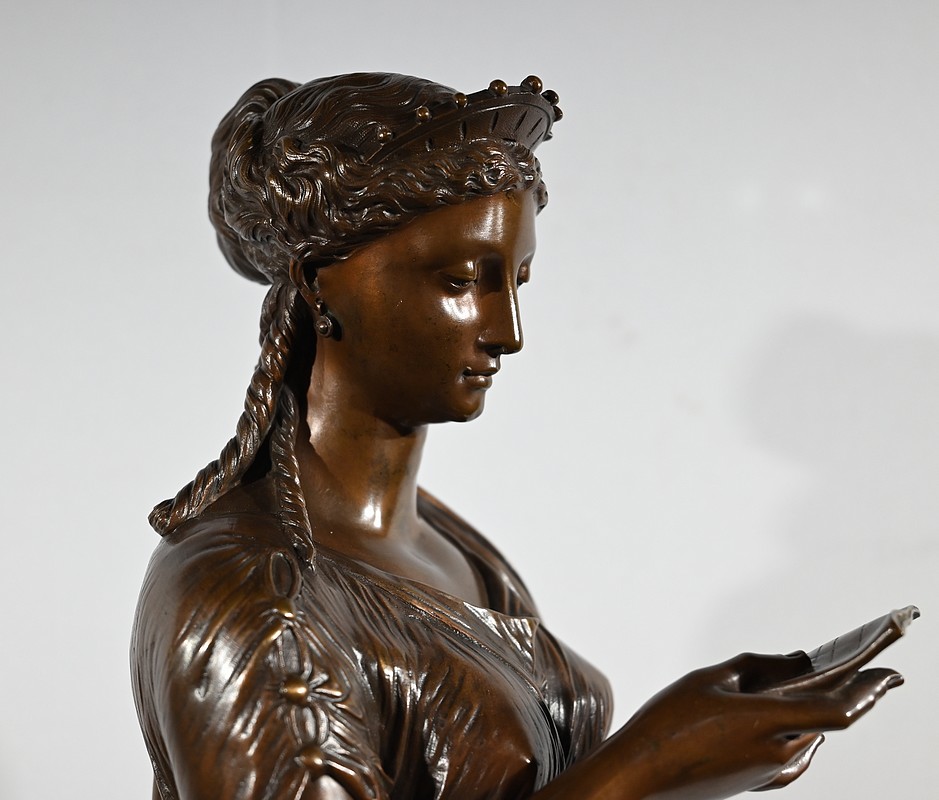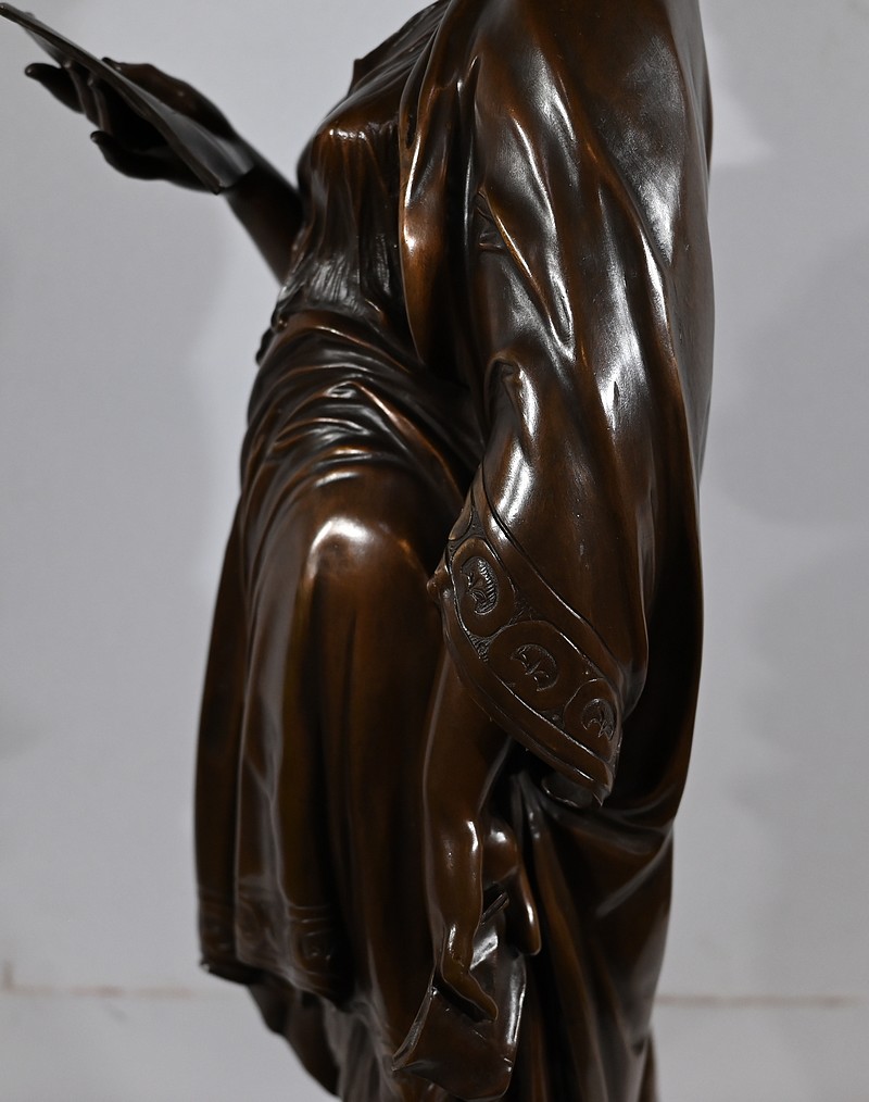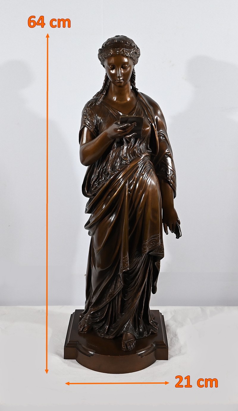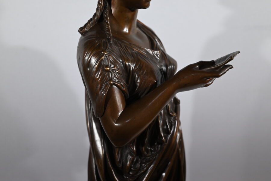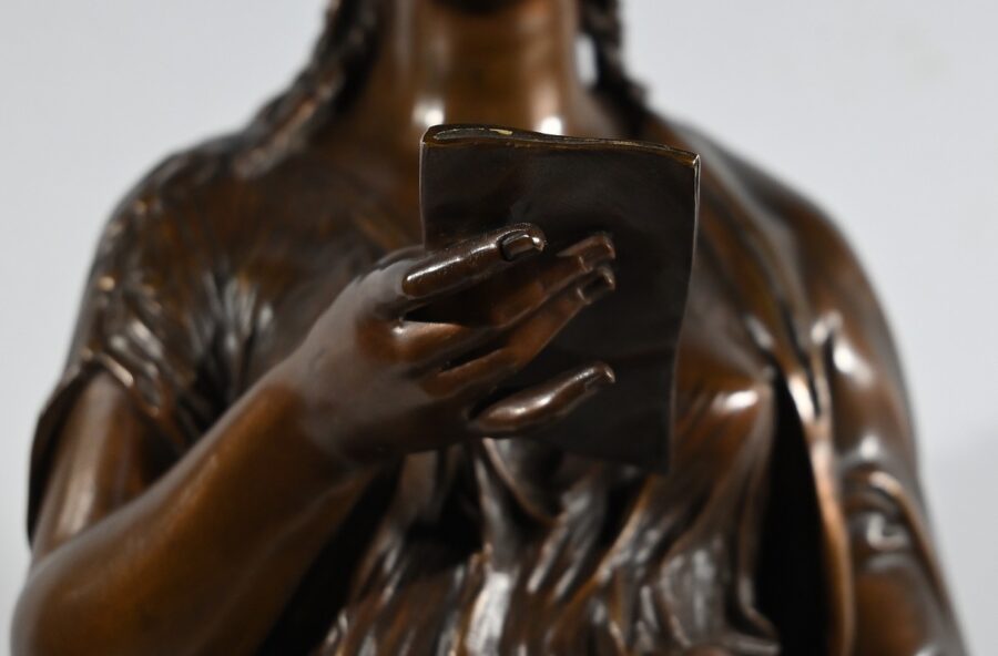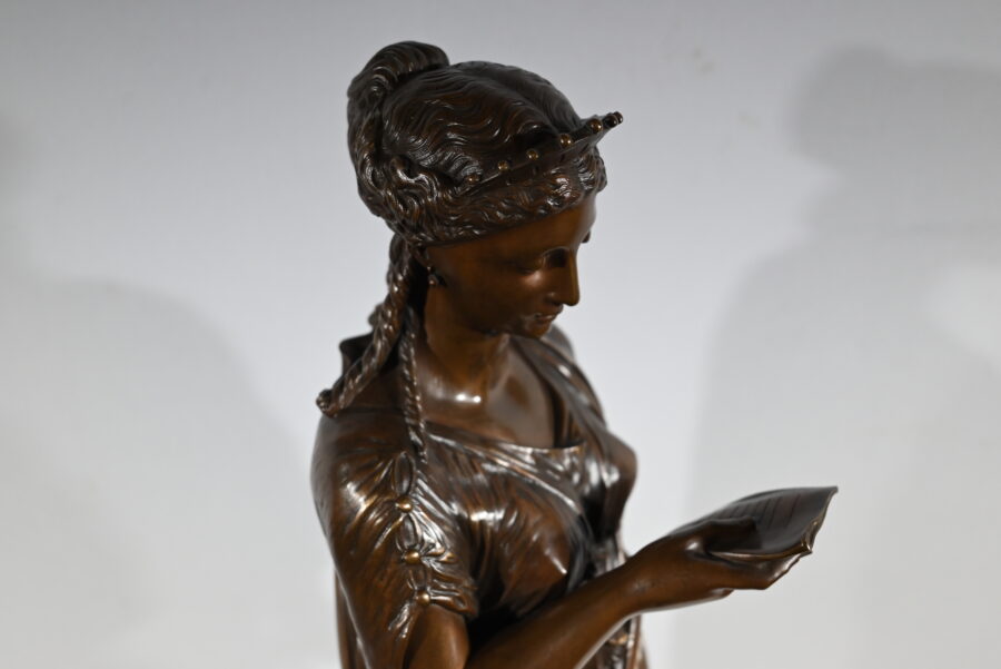 Grand Bronze à patine brune signé Jean-Louis Grégoire (1840-1890) représentant une jeune femme à l’antique lisant une lettre. De sa main droite la jeune femme, coiffée d’une couronne retenant ses cheveux bouclés, lit consciencieusement sa missive, son doux visage baissé. Habillée d’un toge au drapé léger et aux ornementations sculptées, elle laisse pendre son bras gauche tenant une autre feuille.