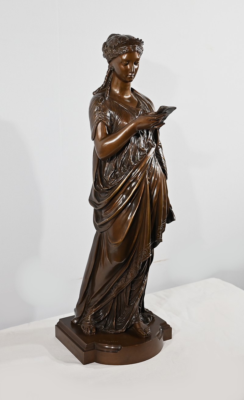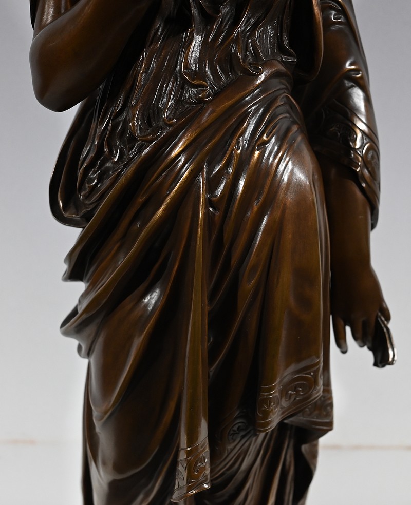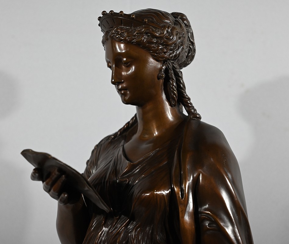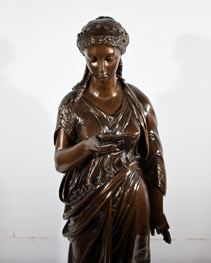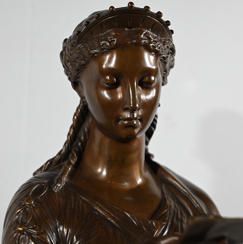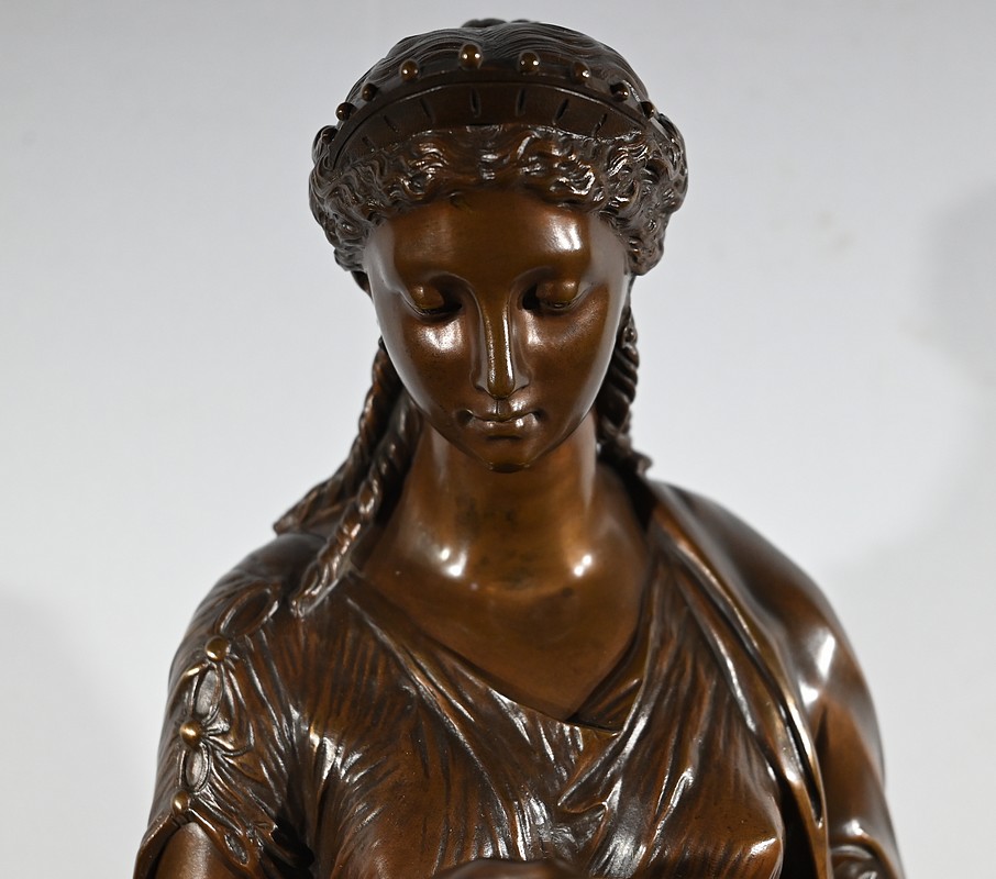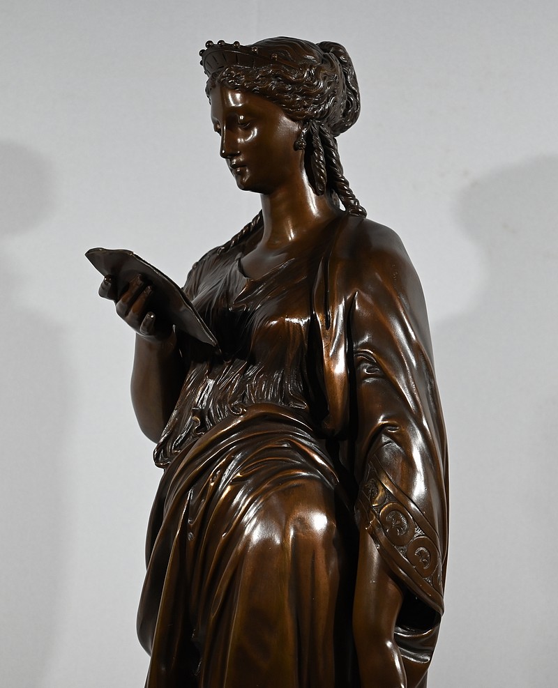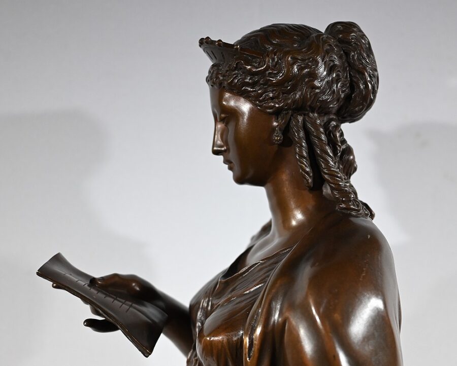 Grand Bronze à patine brune signé Jean-Louis Grégoire (1840-1890) représentant une jeune femme à l’antique lisant une lettre. De sa main droite la jeune femme, coiffée d’une couronne retenant ses cheveux bouclés, lit consciencieusement sa missive, son doux visage baissé. Habillée d’un toge au drapé léger et aux ornementations sculptées, elle laisse pendre son bras gauche tenant une autre feuille.