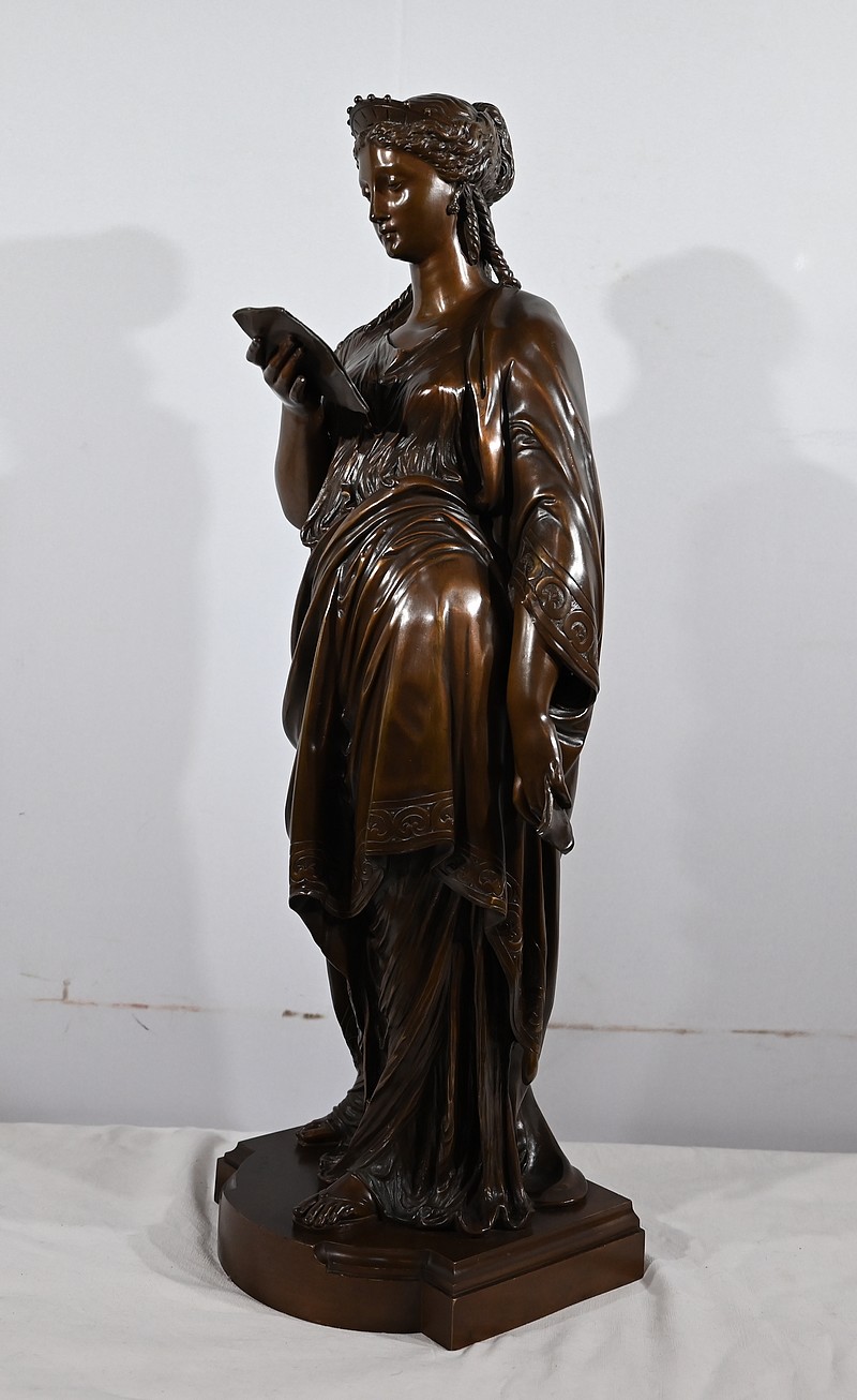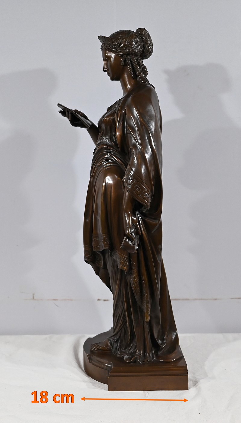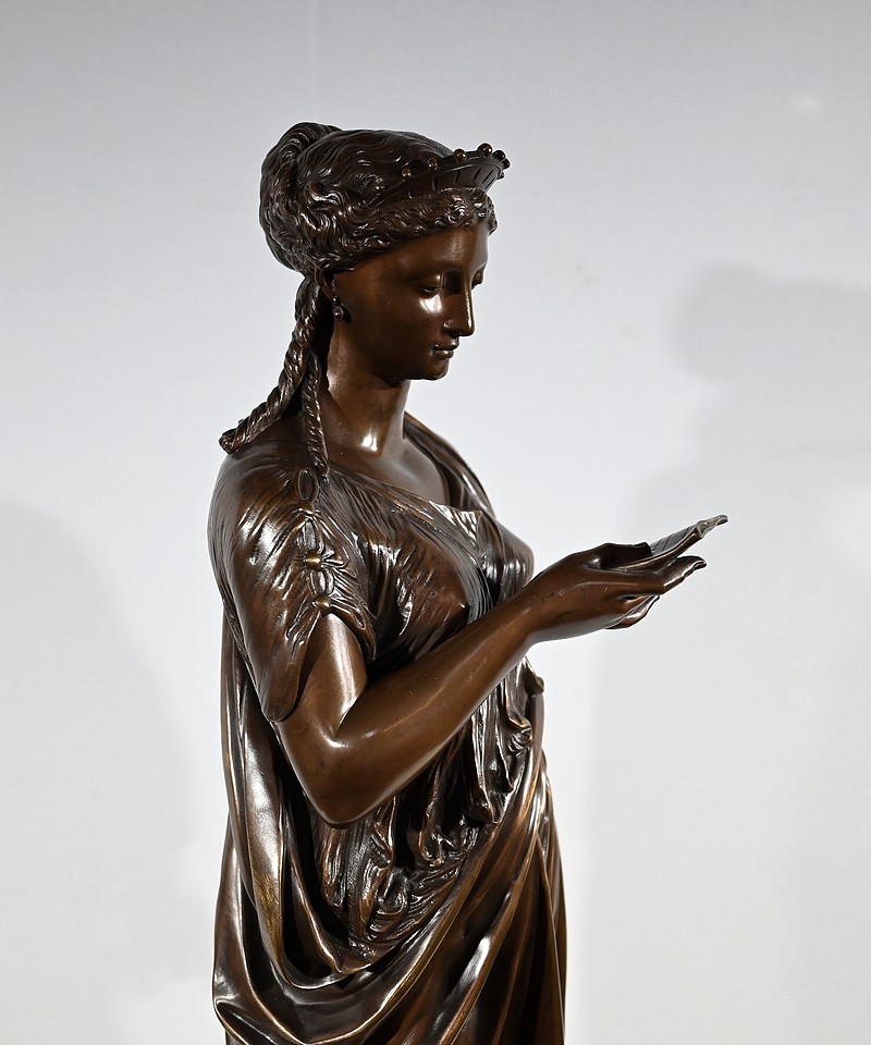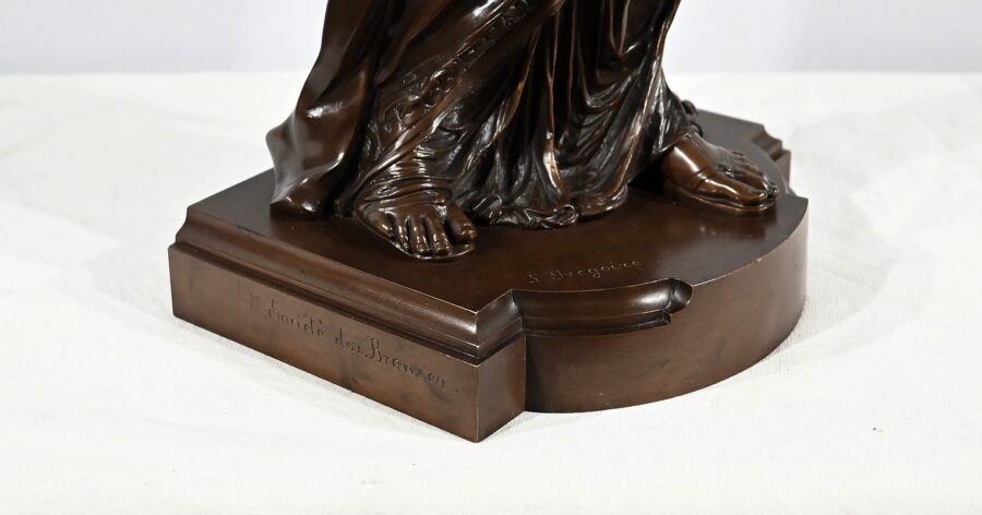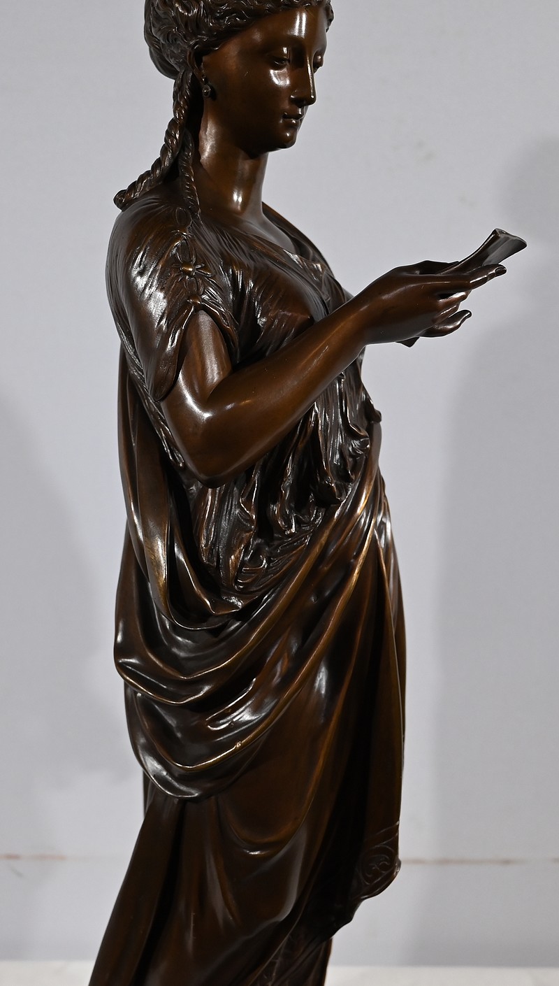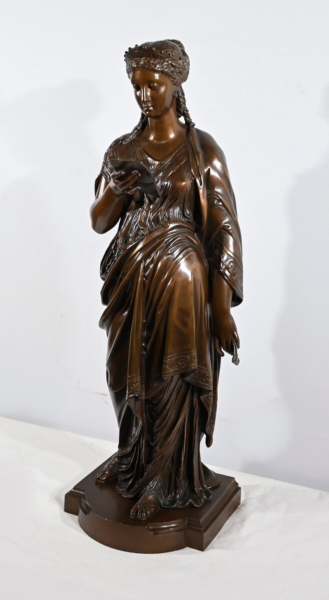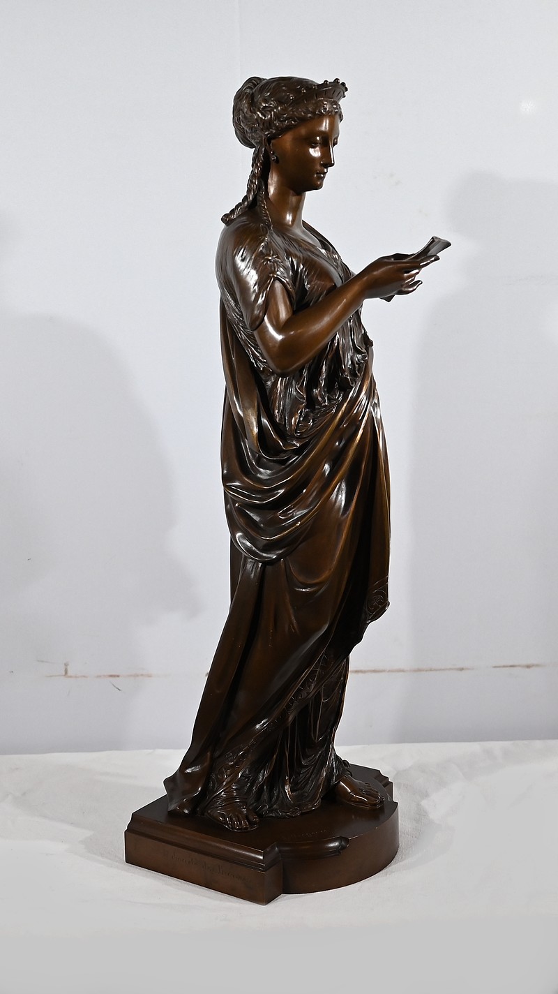 Grand Bronze à patine brune signé Jean-Louis Grégoire (1840-1890) représentant une jeune femme à l’antique lisant une lettre. De sa main droite la jeune femme, coiffée d’une couronne retenant ses cheveux bouclés, lit consciencieusement sa missive, son doux visage baissé. Habillée d’un toge au drapé léger et aux ornementations sculptées, elle laisse pendre son bras gauche tenant une autre feuille.