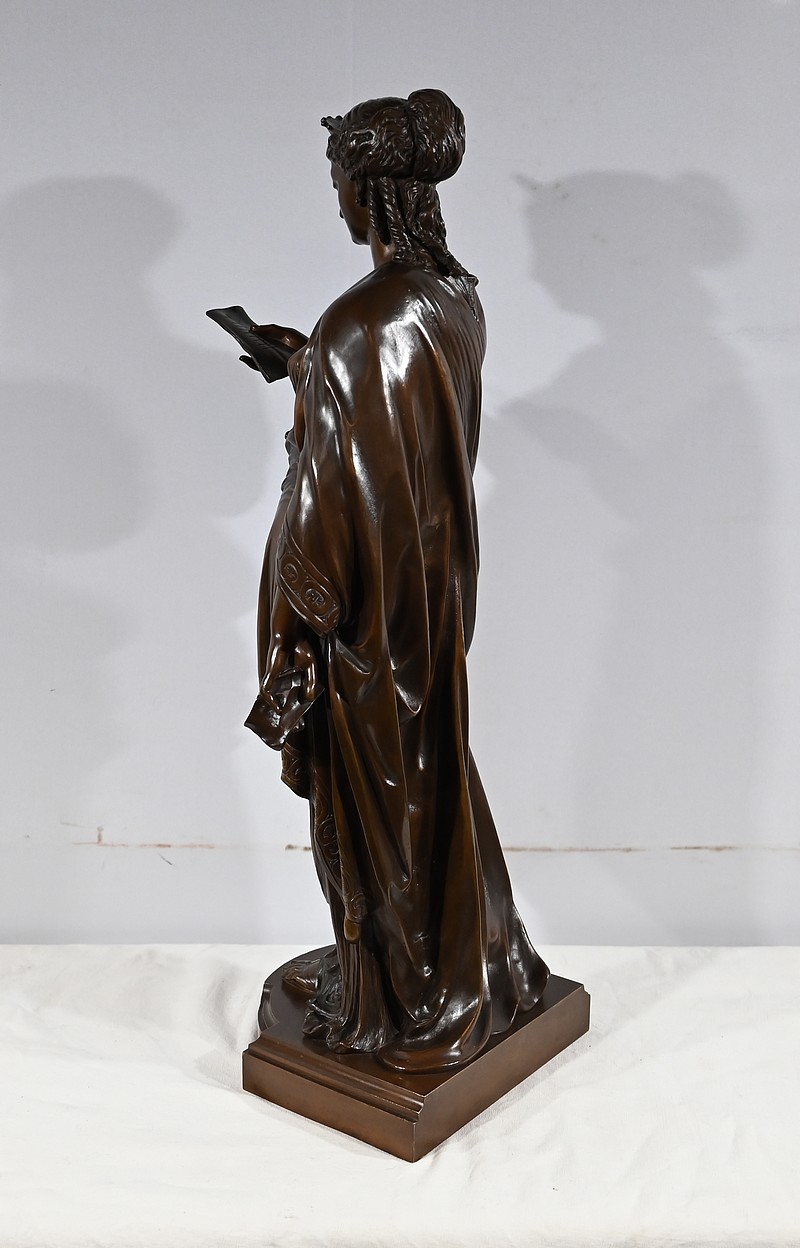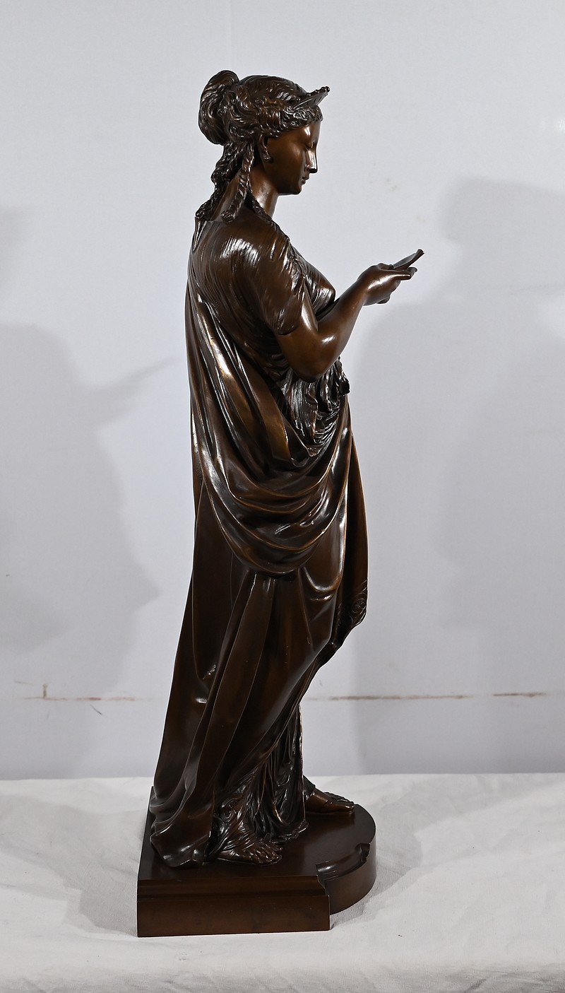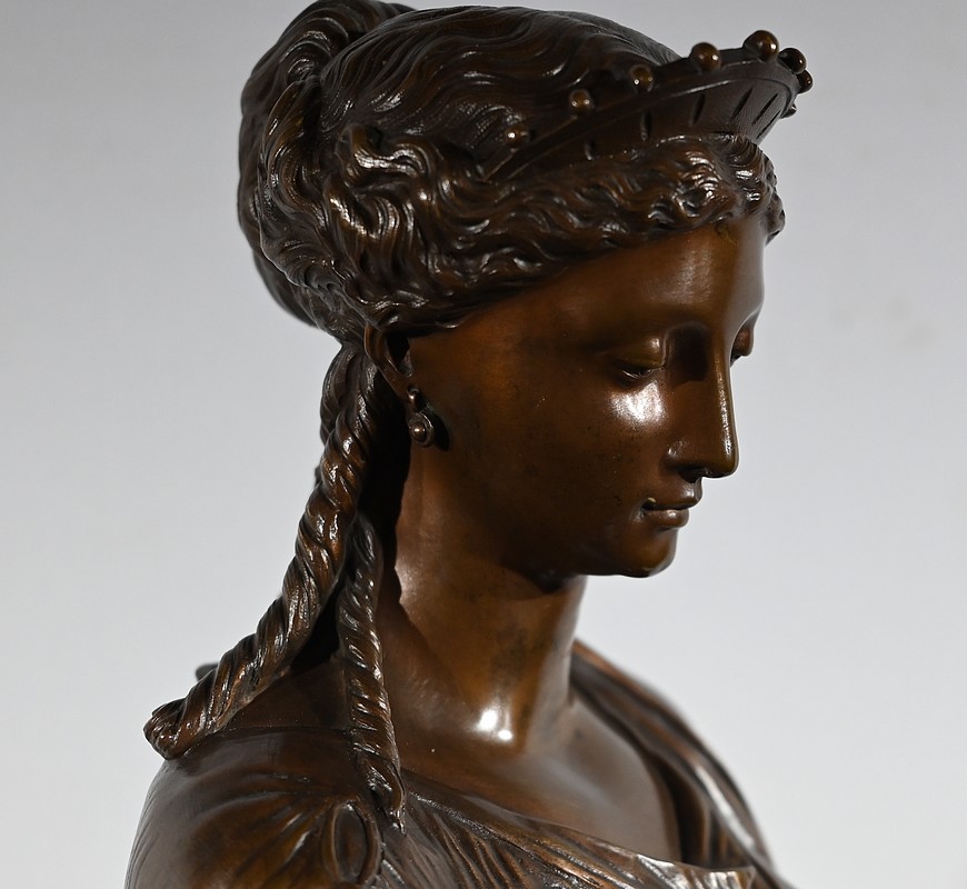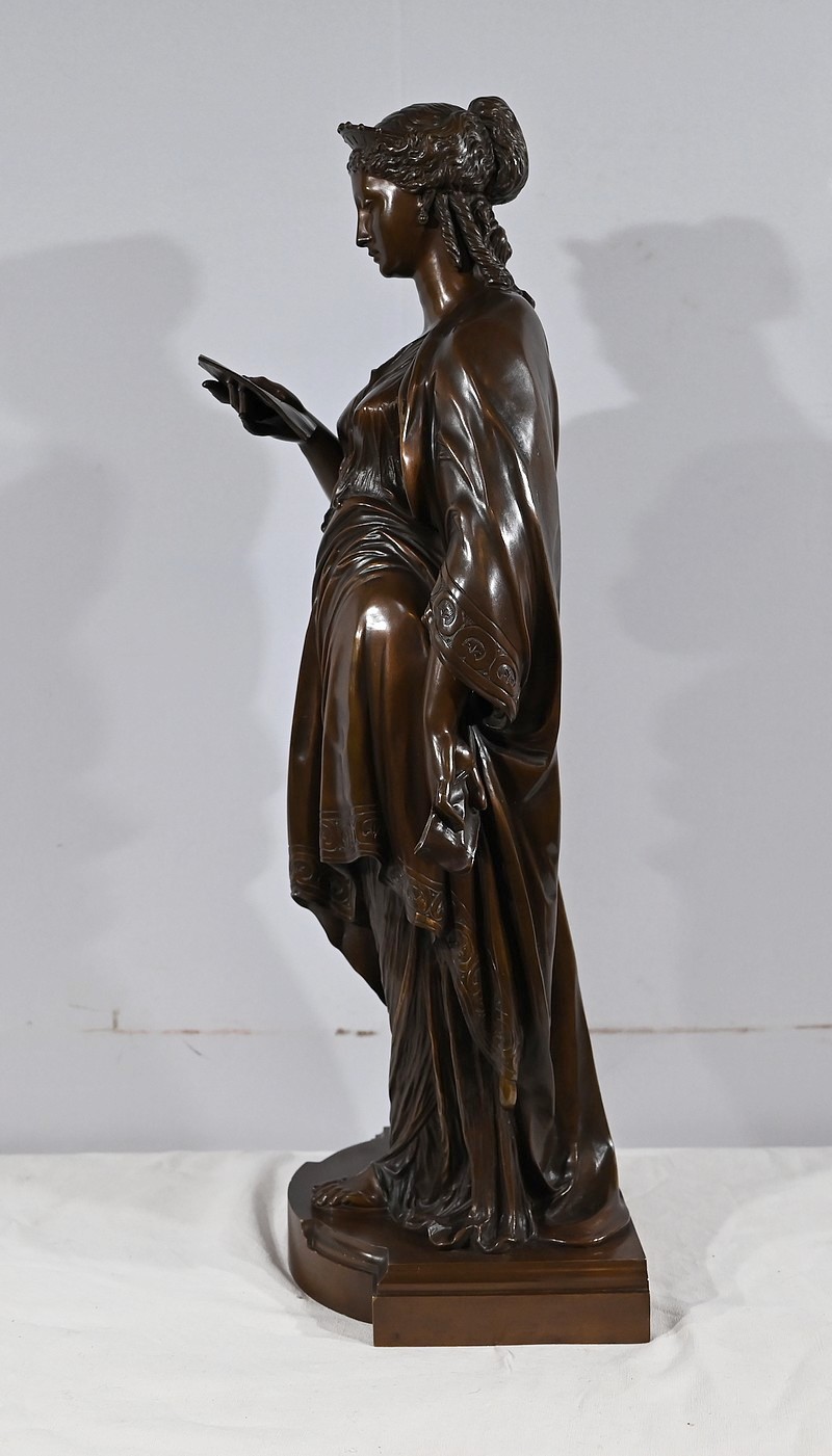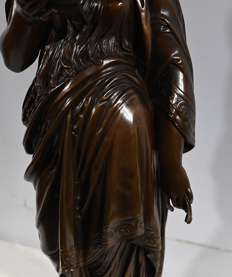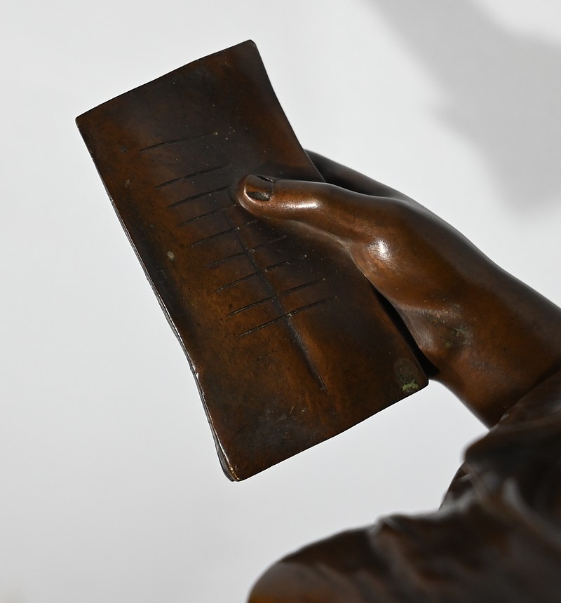 Grand Bronze à patine brune signé Jean-Louis Grégoire (1840-1890) représentant une jeune femme à l’antique lisant une lettre. De sa main droite la jeune femme, coiffée d’une couronne retenant ses cheveux bouclés, lit consciencieusement sa missive, son doux visage baissé. Habillée d’un toge au drapé léger et aux ornementations sculptées, elle laisse pendre son bras gauche tenant une autre feuille.