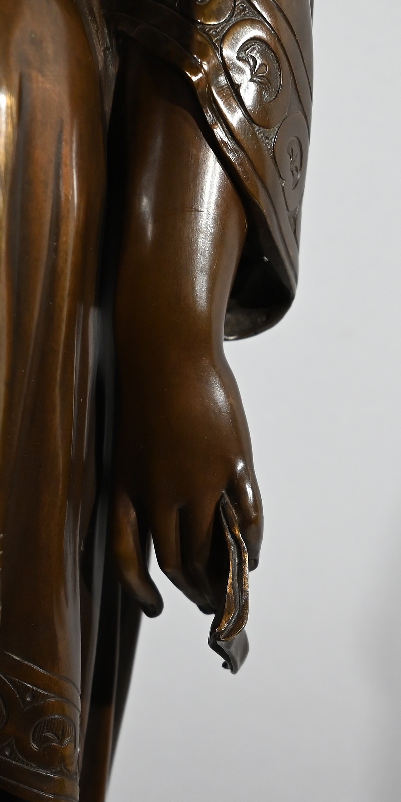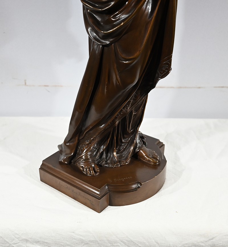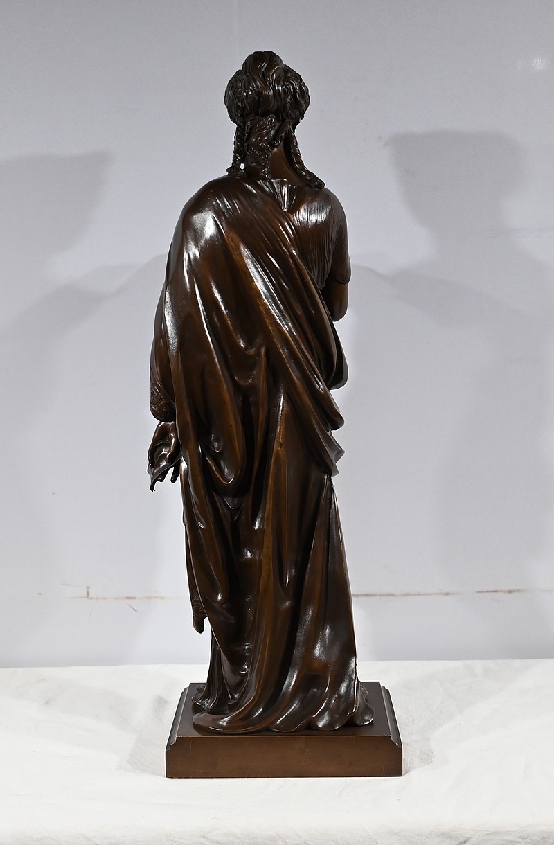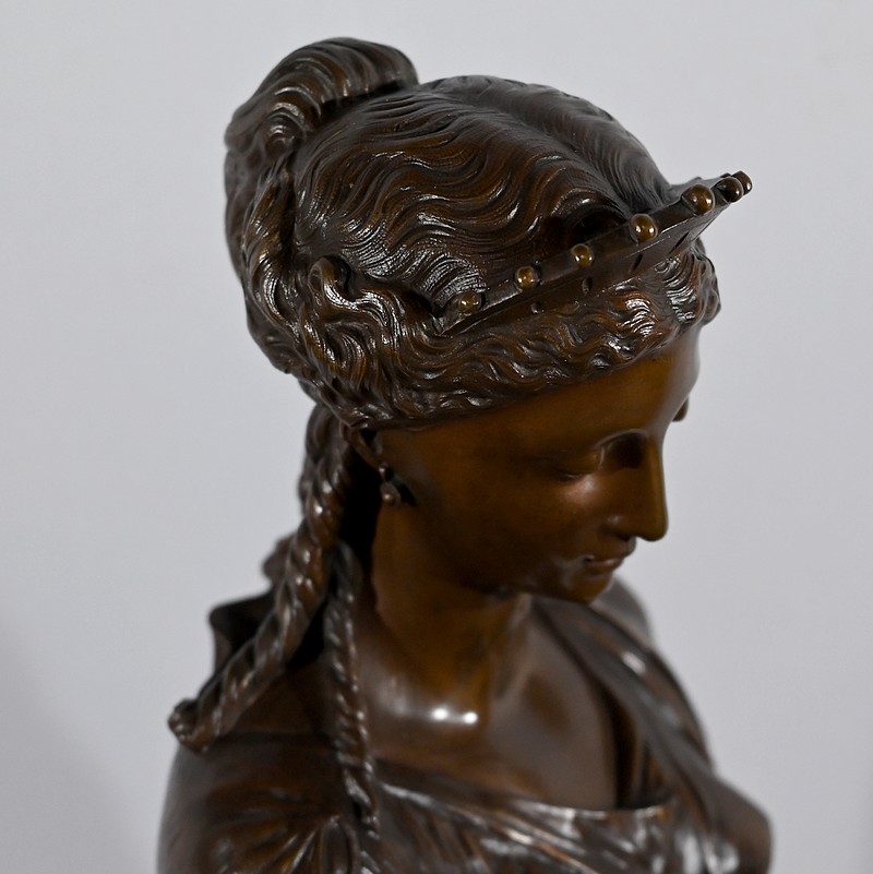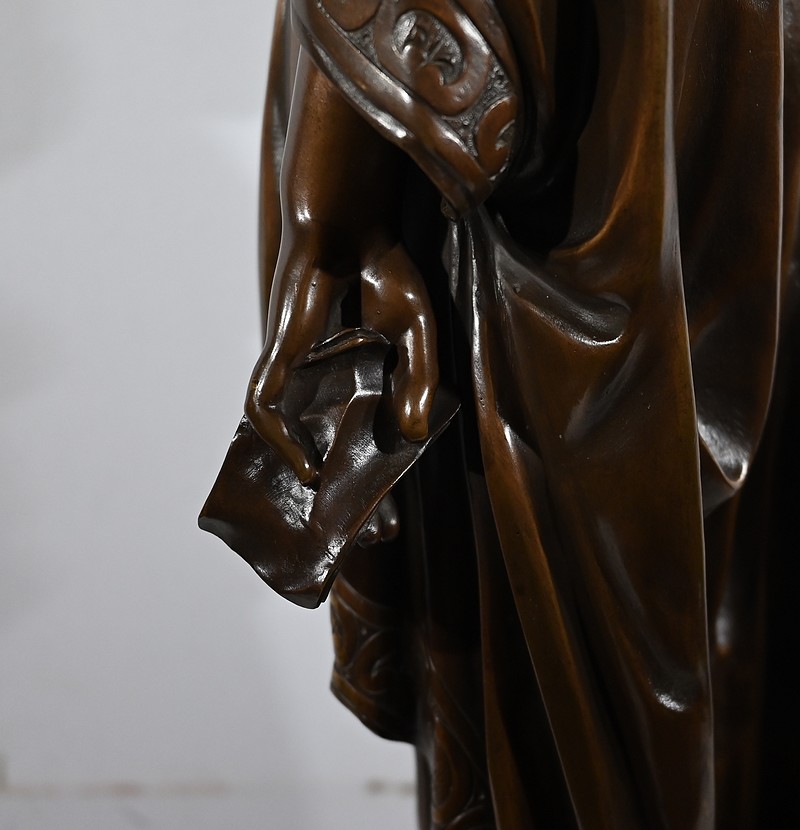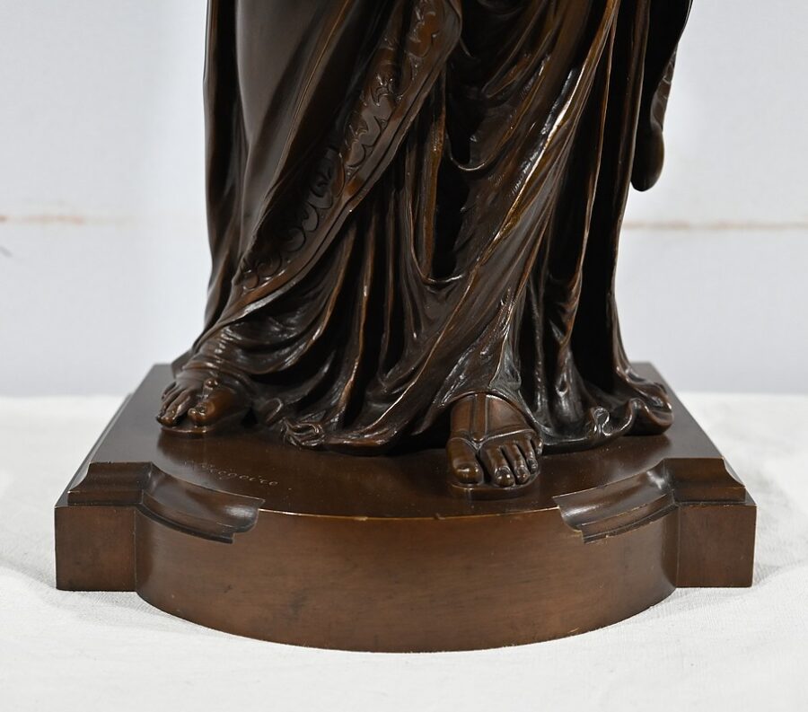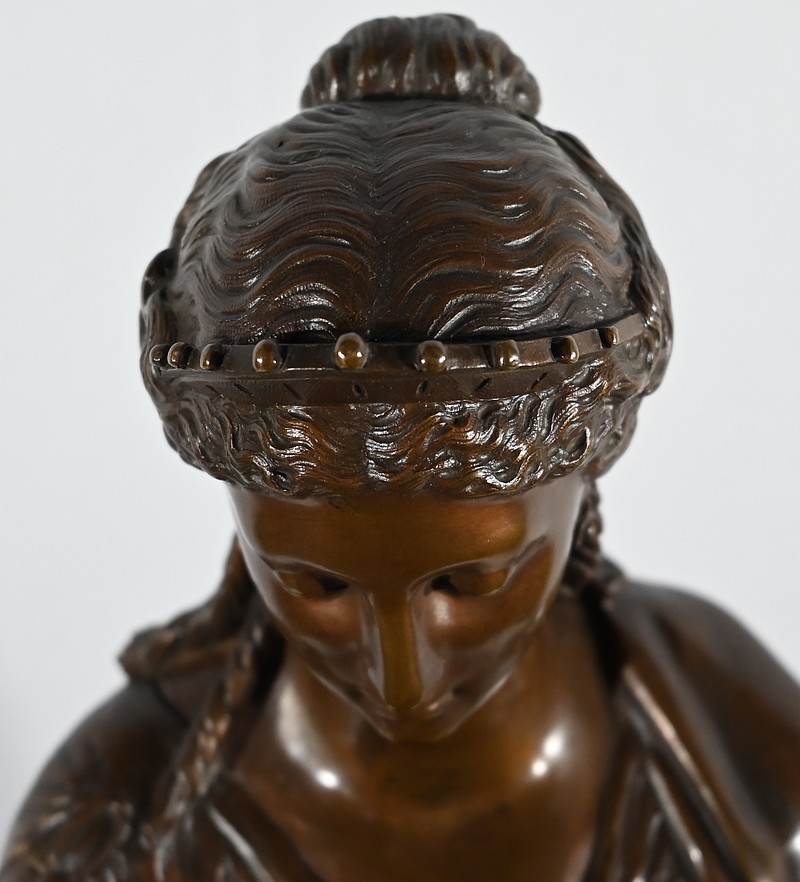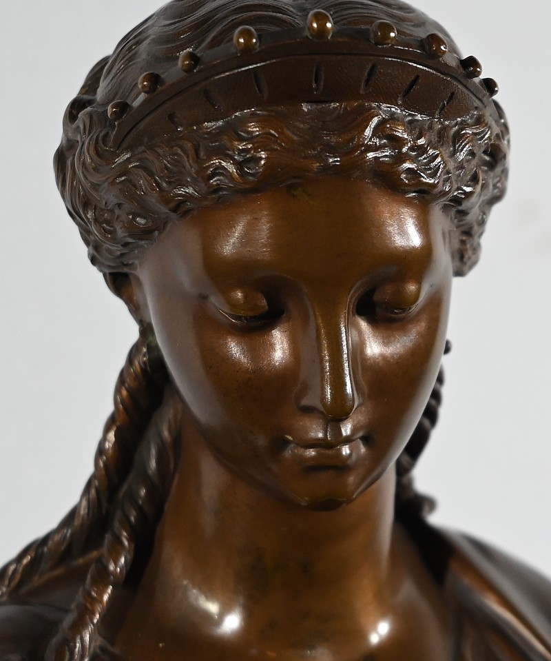 Grand Bronze à patine brune signé Jean-Louis Grégoire (1840-1890) représentant une jeune femme à l’antique lisant une lettre. De sa main droite la jeune femme, coiffée d’une couronne retenant ses cheveux bouclés, lit consciencieusement sa missive, son doux visage baissé. Habillée d’un toge au drapé léger et aux ornementations sculptées, elle laisse pendre son bras gauche tenant une autre feuille.