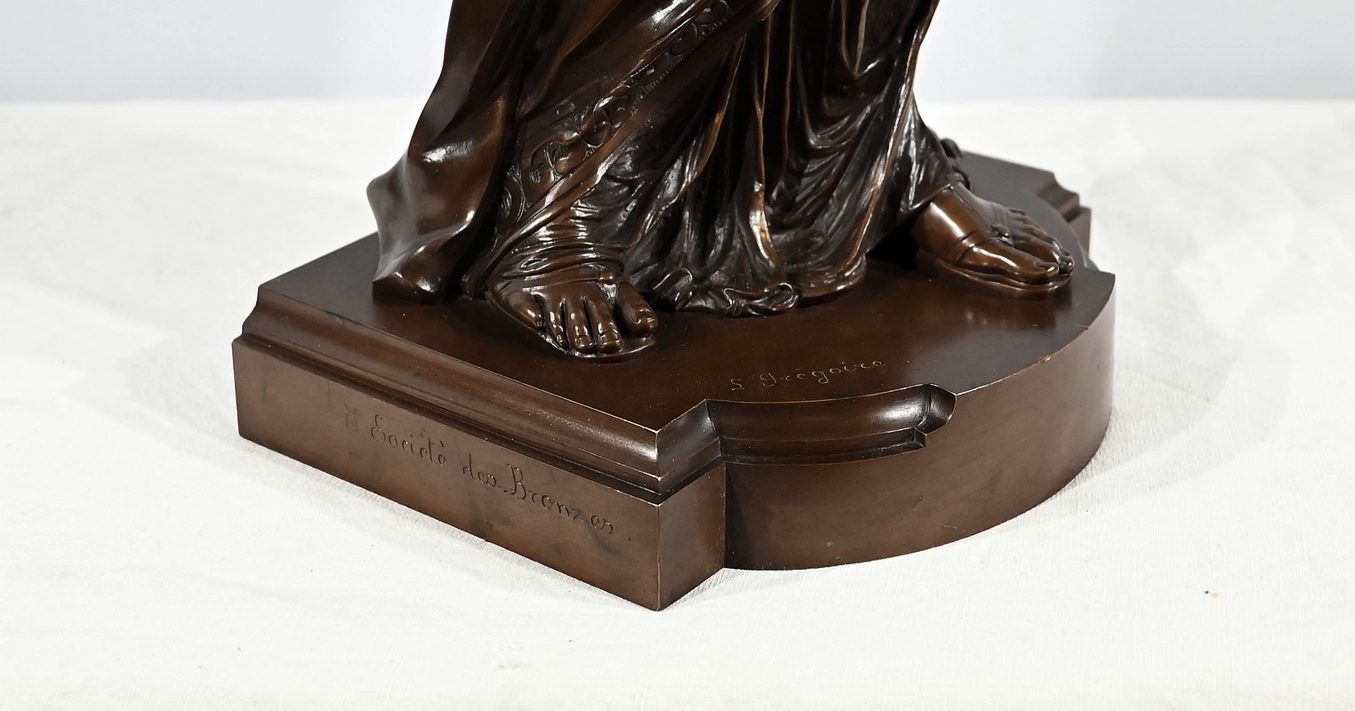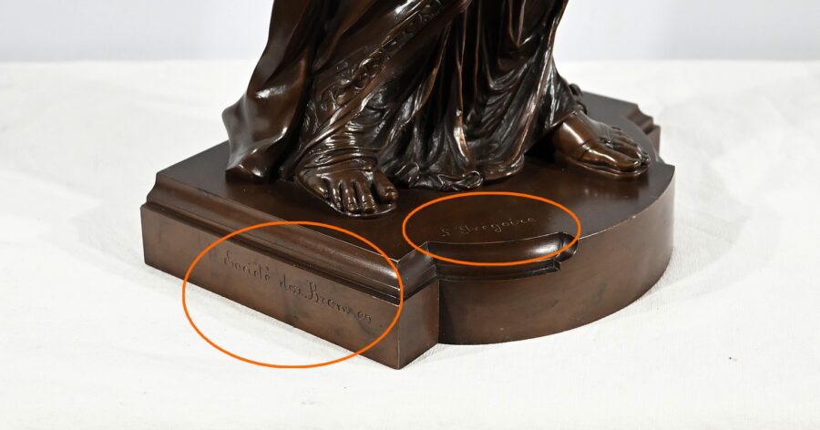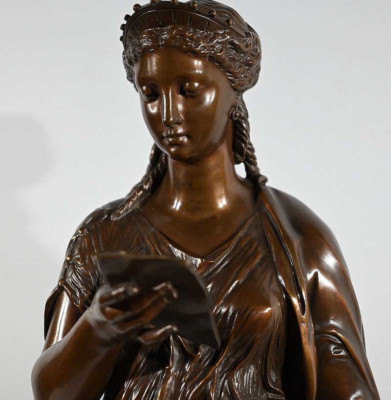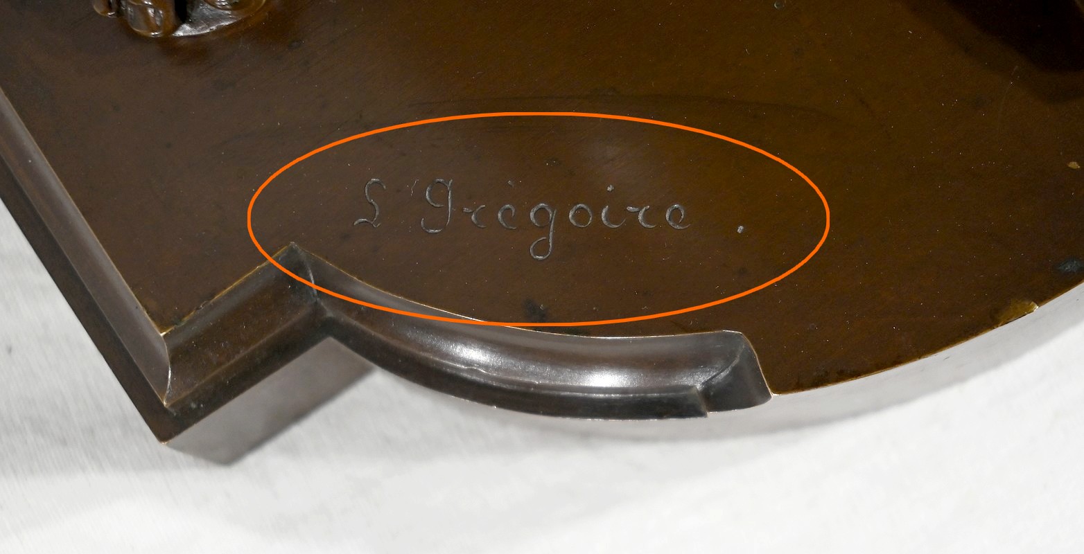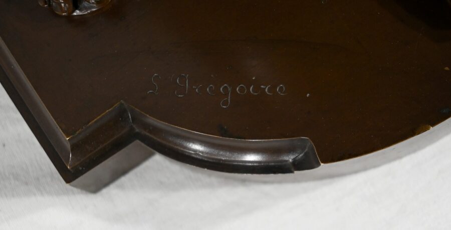 Allégorie de la littérature et de la poésie, cette œuvre est finement ciselée et signée sur sa terrasse « L. Grégoire » et « Société des bronzes ».