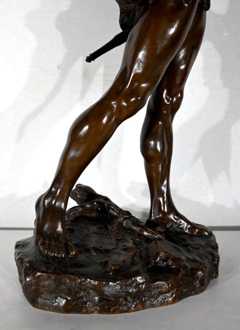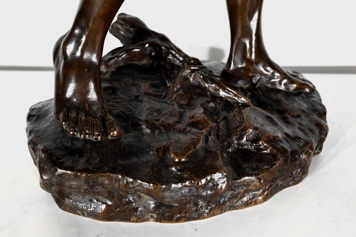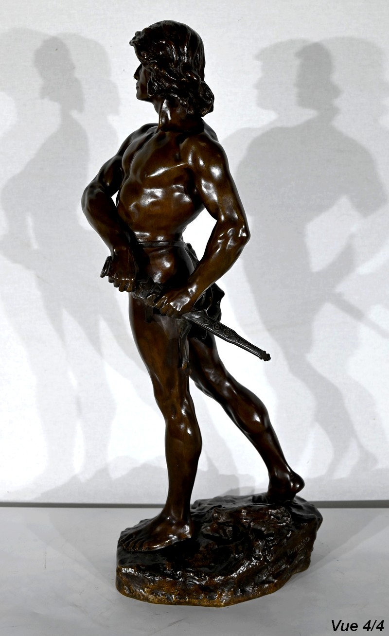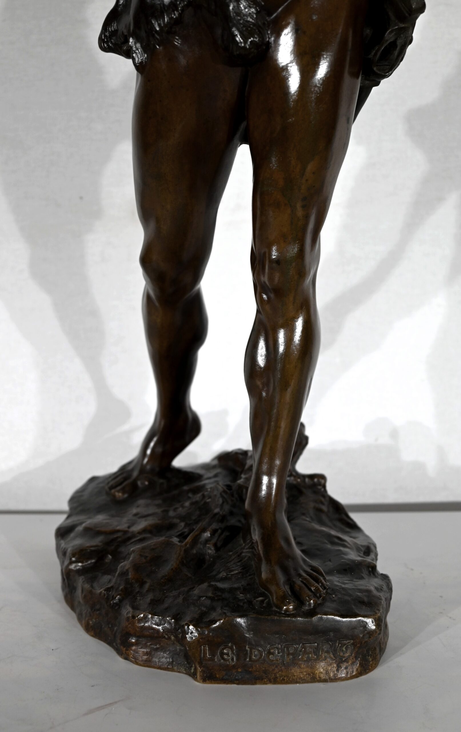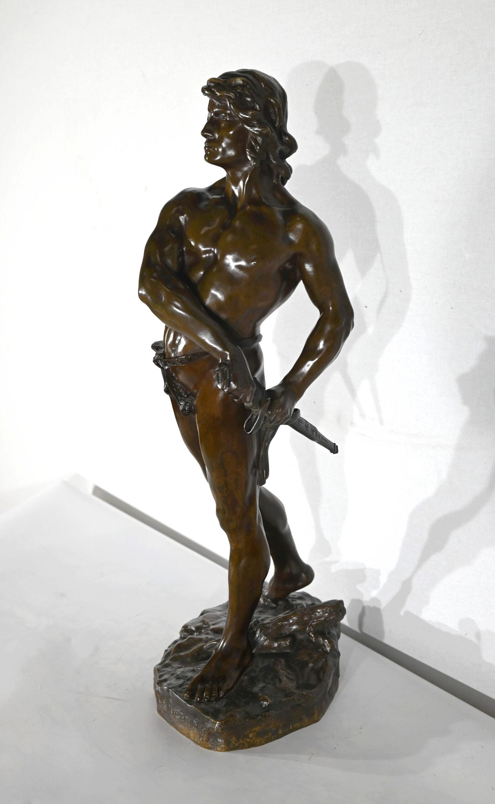 « Le Départ » représente un combattant antique, engageant la marche, pieds nus, sur un amas végétalisé.