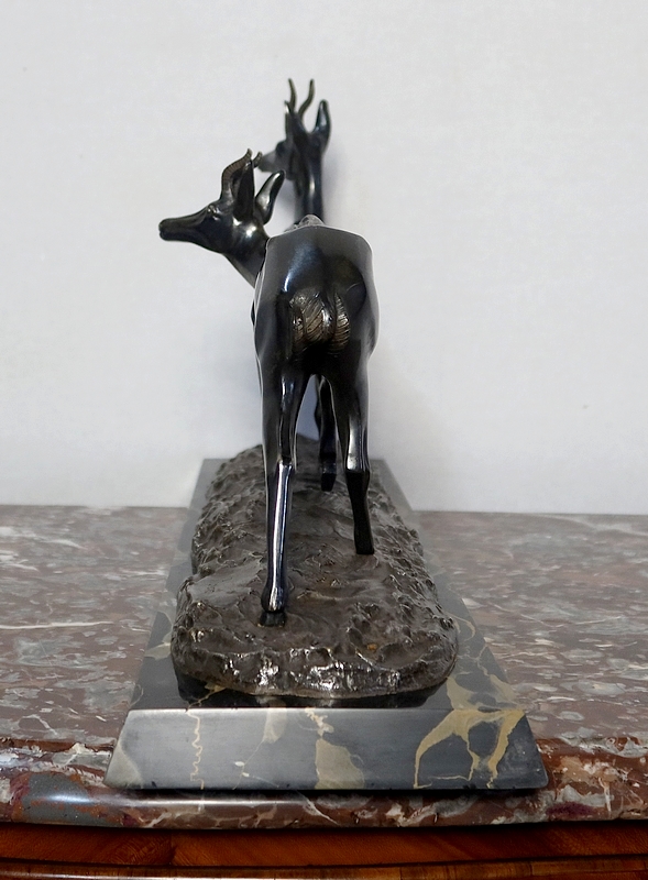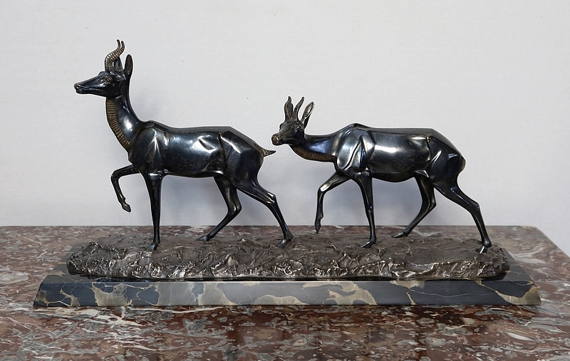 Épreuve en Bronze à patine brune représentant deux gazelles majestueuses, signé sur la terrasse « I. Rochard » et posé sur un socle en marbre portor légèrement biseauté.