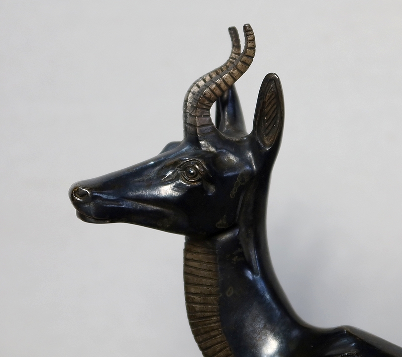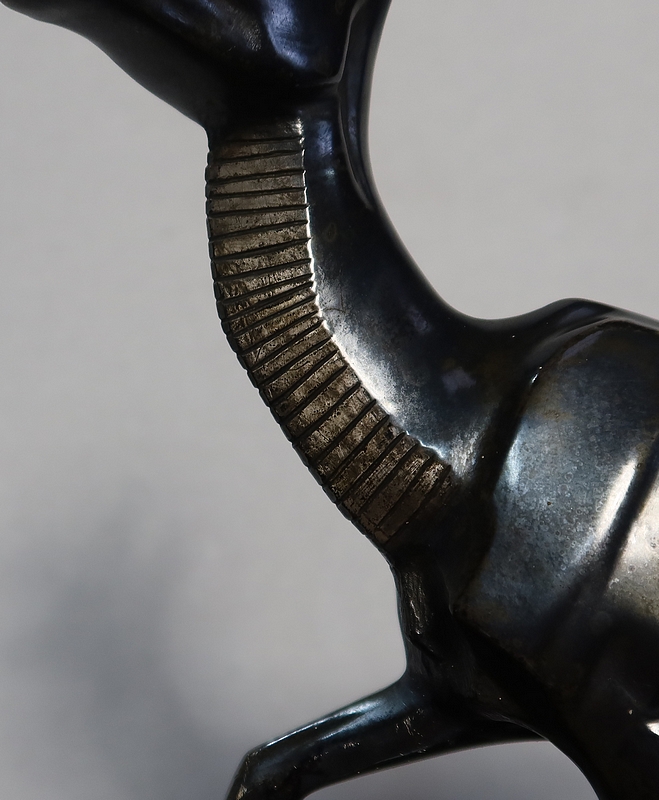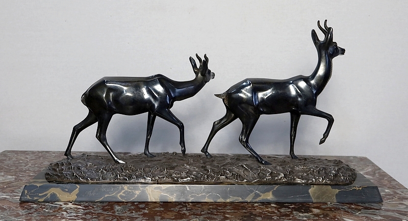 Ce bronze représente deux gazelles en mouvement, alertes, regardant dans la même direction. L’une, tête relevée paraît curieuse du monde qui l’entoure et semble attentive au moindre bruit. L’autre plus craintive suit de près sa semblable.