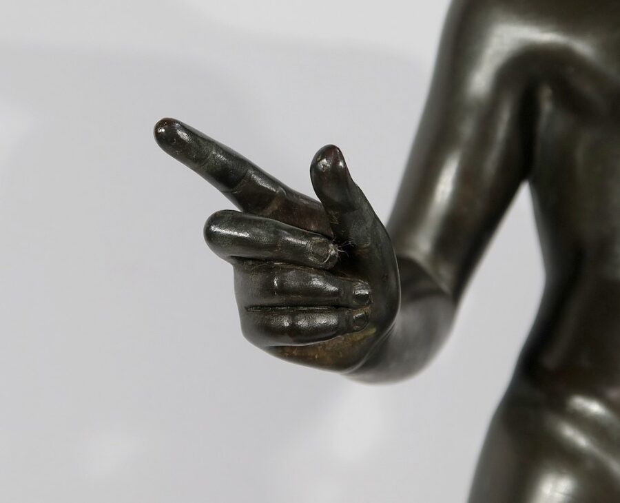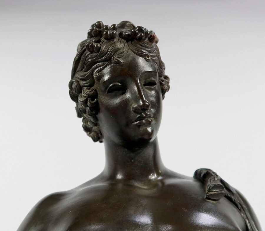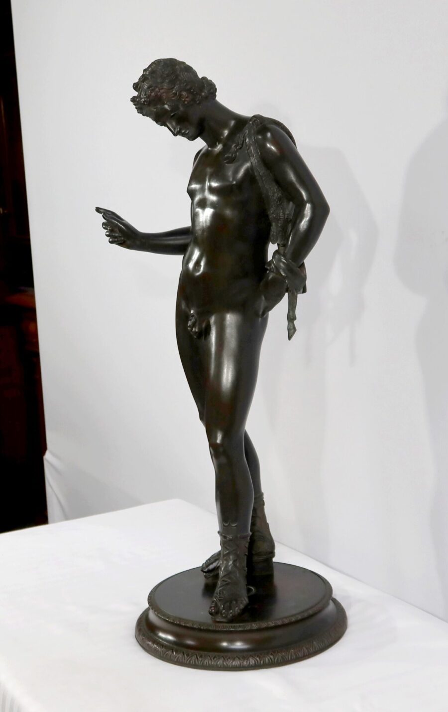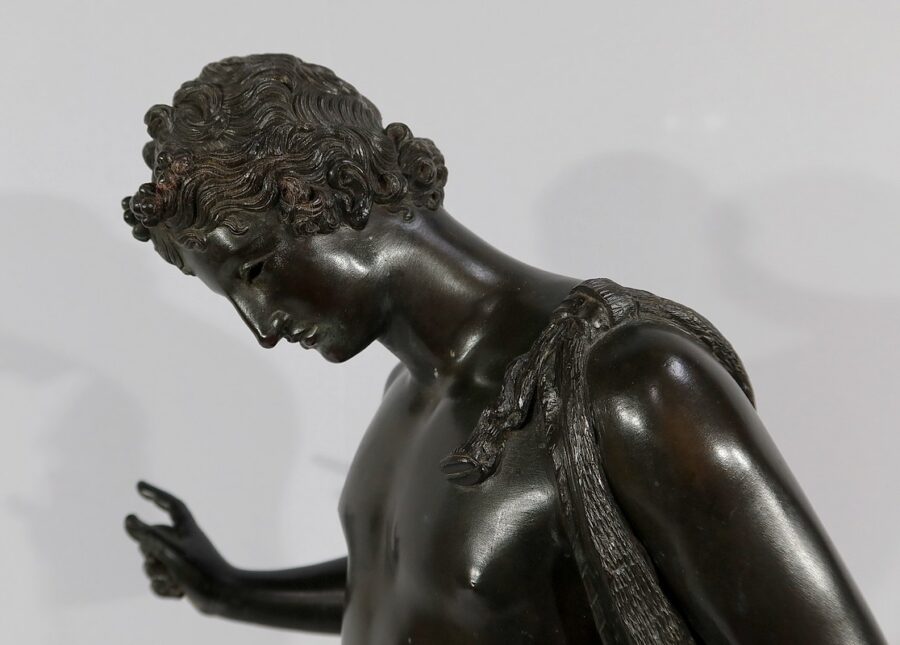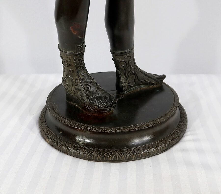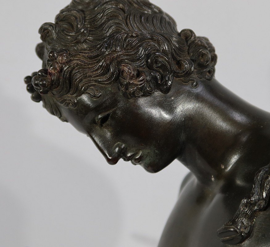 Grande sculpture en bronze patiné figurant Narcisse nu de Michele Amodio, d’après l’original antique découvert en 1862 à Pompéi dans la Maison de Narcisse et actuellement conservée à Naples.