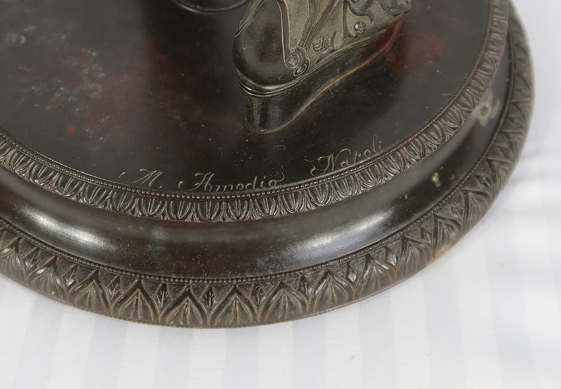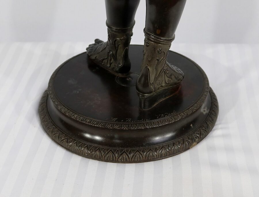L’éphèbe repose sur un socle rond à gradins orné de feuilles d’eau. L’œuvre est signée sur la terrasse : M. Amodio Napoli.