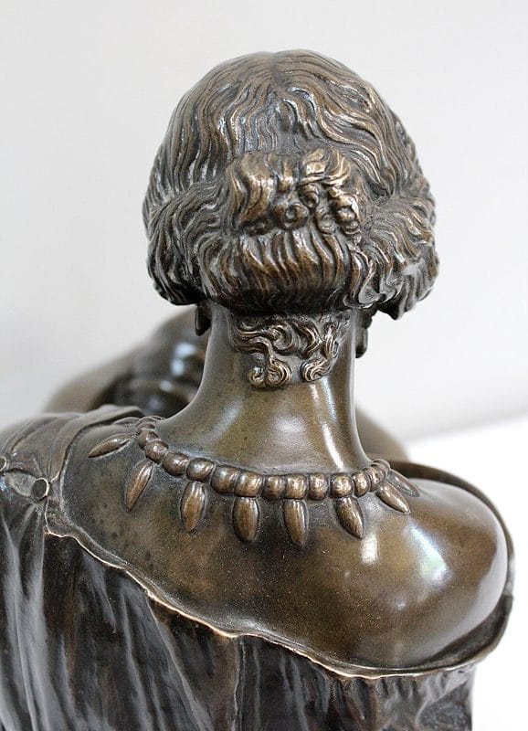 Ici, Sapho, Poétesse Grecque aux origines Aristocratiques, est représentée assise sur un siège à pieds d’équidés. Ses jambes sont croisées, ses mains aux longs doigts fins sont réunies sur sa cheville gauche. La Courtisane tourmentée a le visage baissé, accentuant cette attitude de repli. Ses cheveux crépus sont remontés en chignon et son corps est couvert d’un grand drapé à larges plis. Son cou et ses bras dénudés sont parés de bijoux, ses pieds chaussés de spartiates.