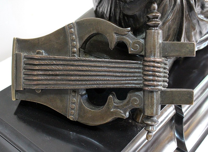 Dans son dos repose une Lyre, délaissée par la musicienne plongée dans ses pensées : Sapho, amoureuse éperdue, songe au suicide. On raconte que dans un acte de désespoir, elle sautera d’une falaise pour se jeter dans la mer.