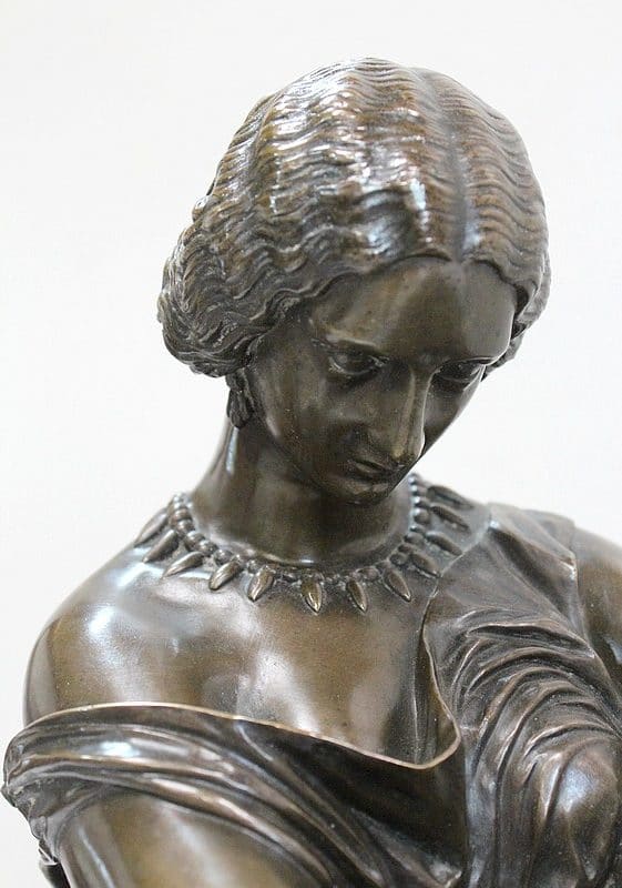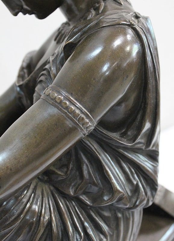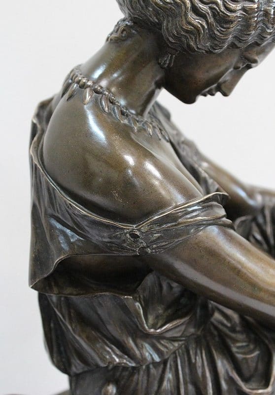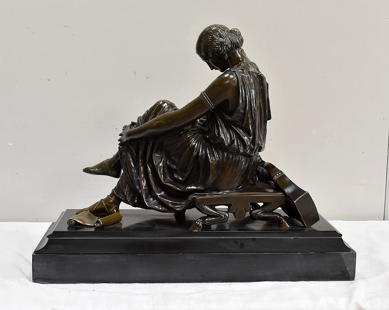 Ce Bronze est une réplique de « Sapho assise », Œuvre médaillée d’Honneur à titre posthume, exposée au Musée d’Orsay, et que l’on doit à Jean Claude – dit James – Pradier (1790 – 1852). L’Artiste français, né à Genève et élève de Lemot, est un Sculpteur Néoclassique Ambivalent. Le Corps Humain en général et la figure Féminine en particulier sont au cœur de son Art.