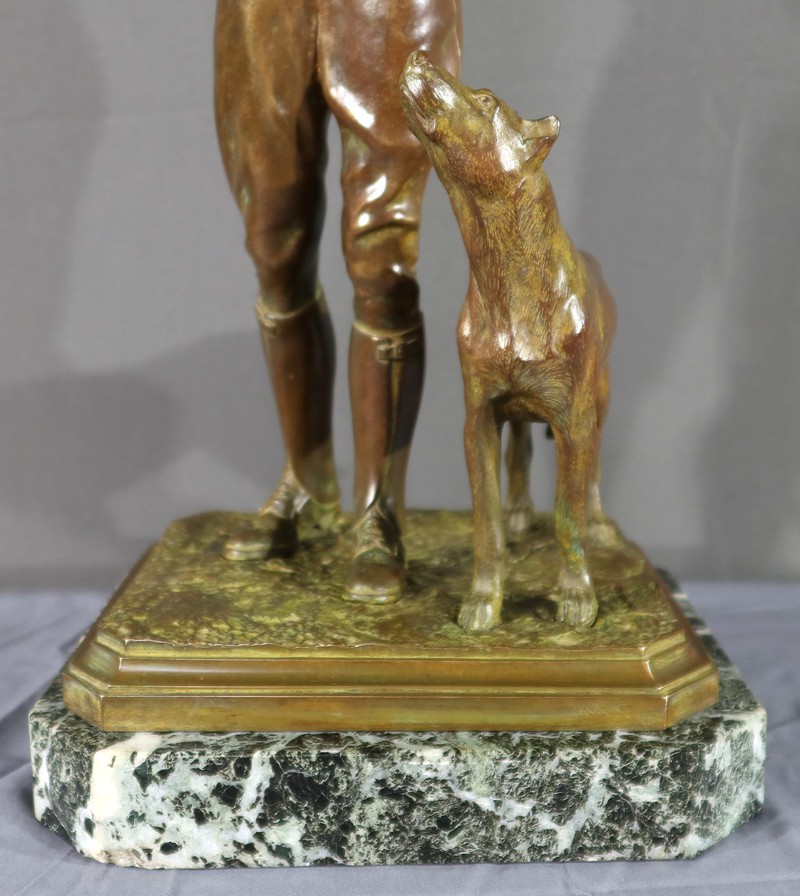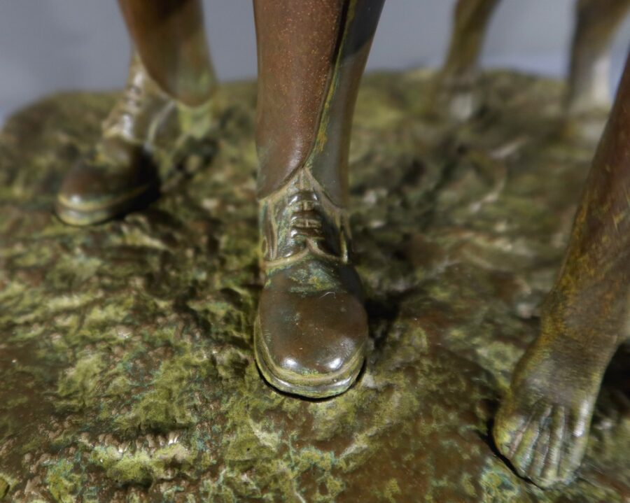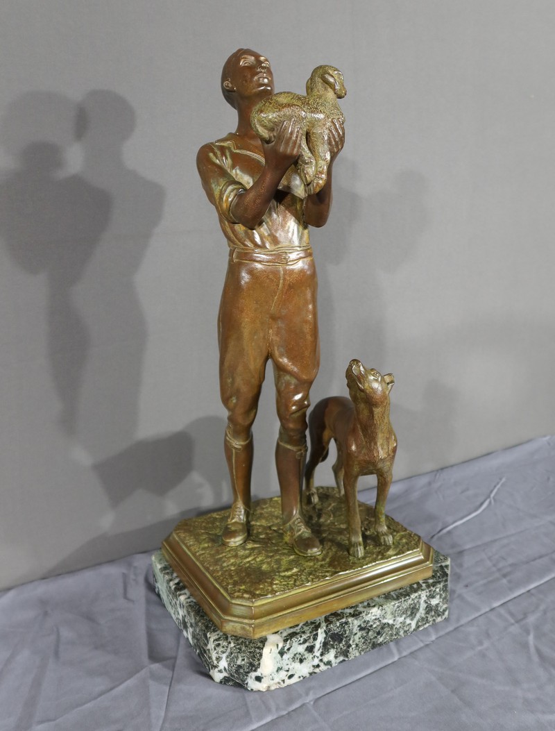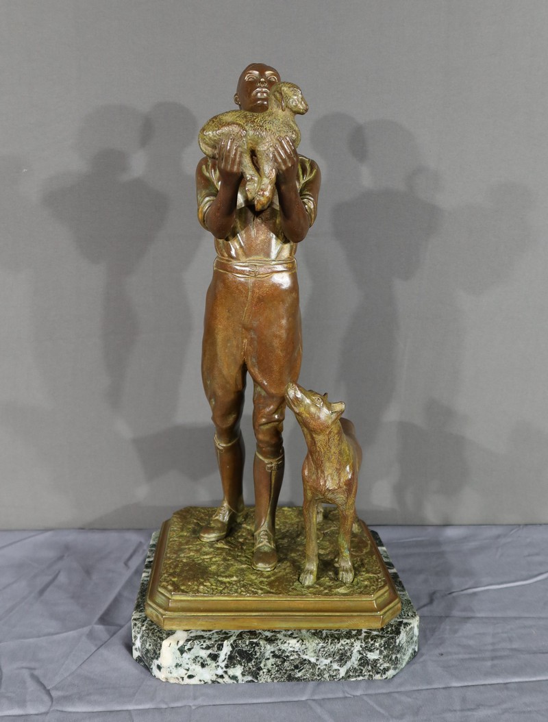 Cette sculpture en bronze représente un homme debout, tenant un agnelet dans ses bras, accompagné de son chien à ses côtés.