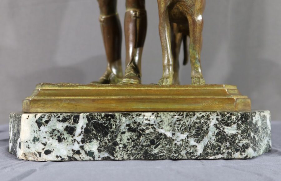 La double patine, verte et brune, ajoute de la profondeur et du contraste à l’œuvre, tandis que le socle en marbre noir, ressemblant au veinage du marbre vert de mer, offre une base solide et élégante.
