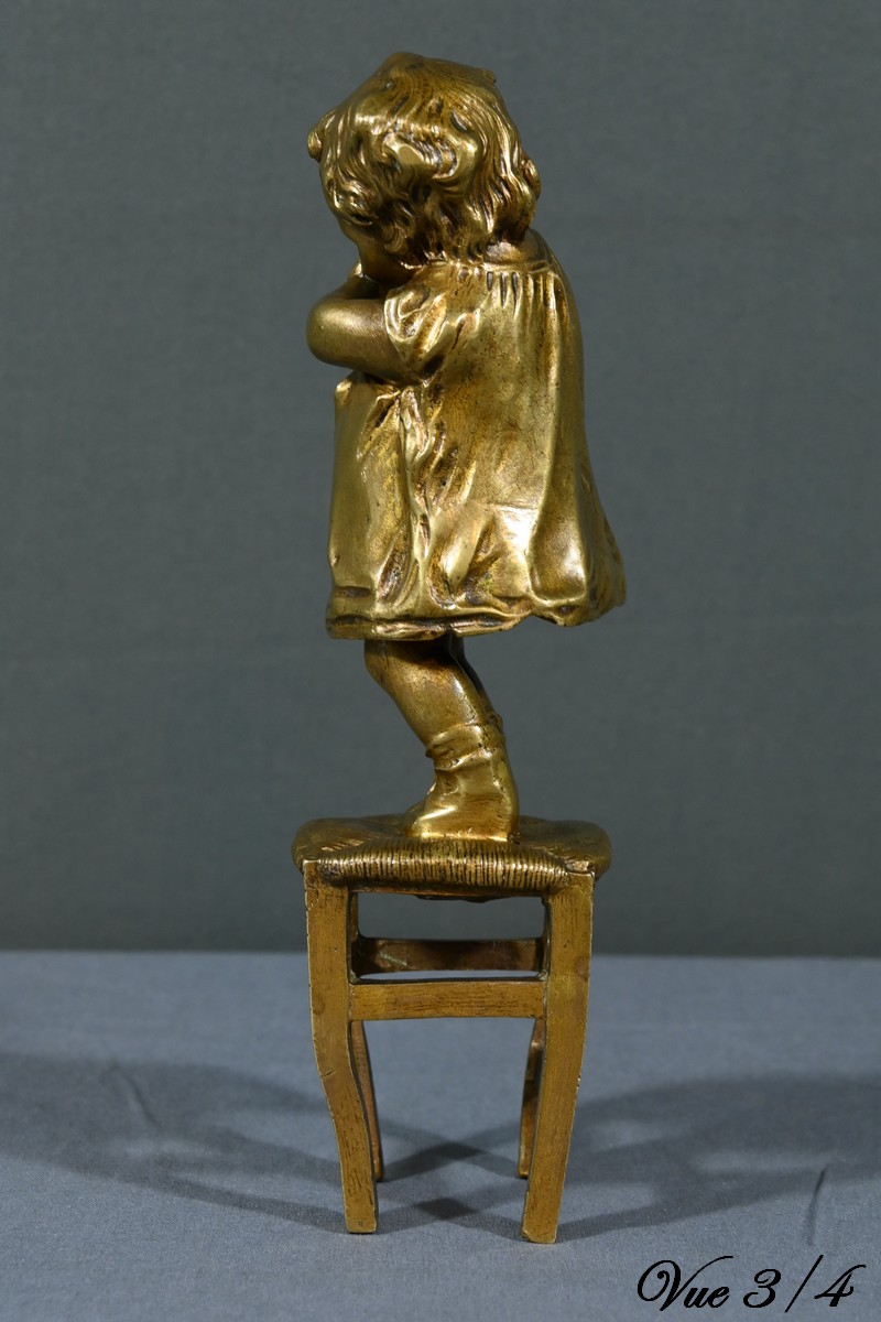 L’œuvre représente une jeune fille debout sur un tabouret, se cachant légèrement derrière ses mains.