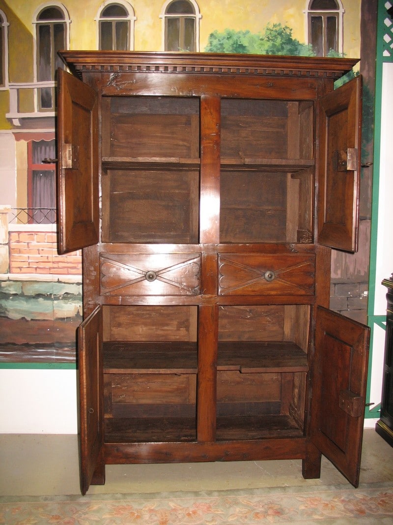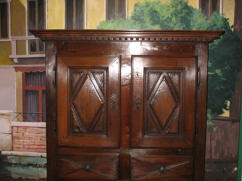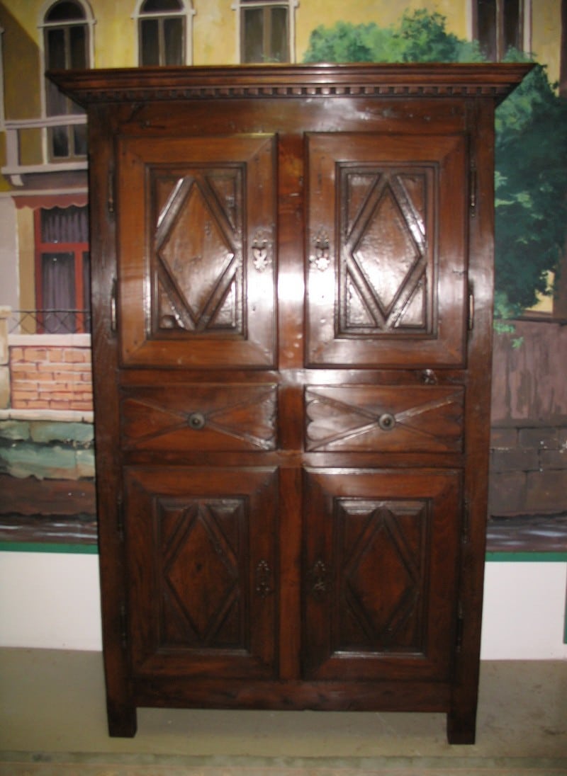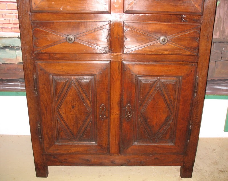 Petit Quatre Volets Louis XIII en merisier roux (façade et côtés) et chêne pour les pieds avants et arrières. Il ouvre à 4 portes et 2 tiroirs.
