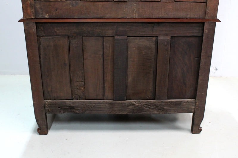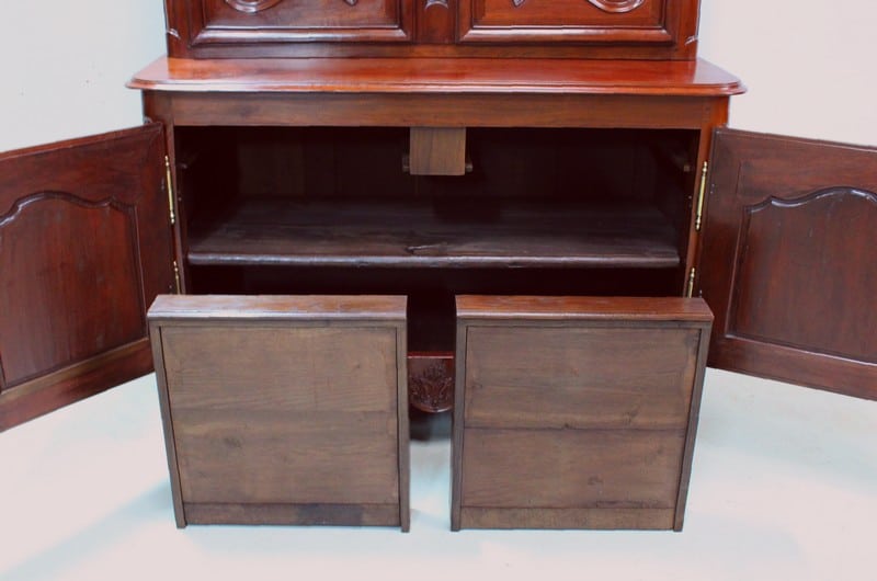 La partie basse ouvre également par 2 portes à panneaux sculptés et moulurés, fermant à clef avec serrure d’origine. L’intérieur est doté de 2 tiroirs ainsi que d’une étagère posée sur tasseaux fixes.