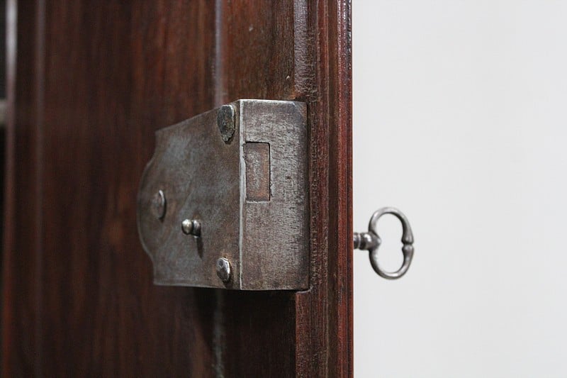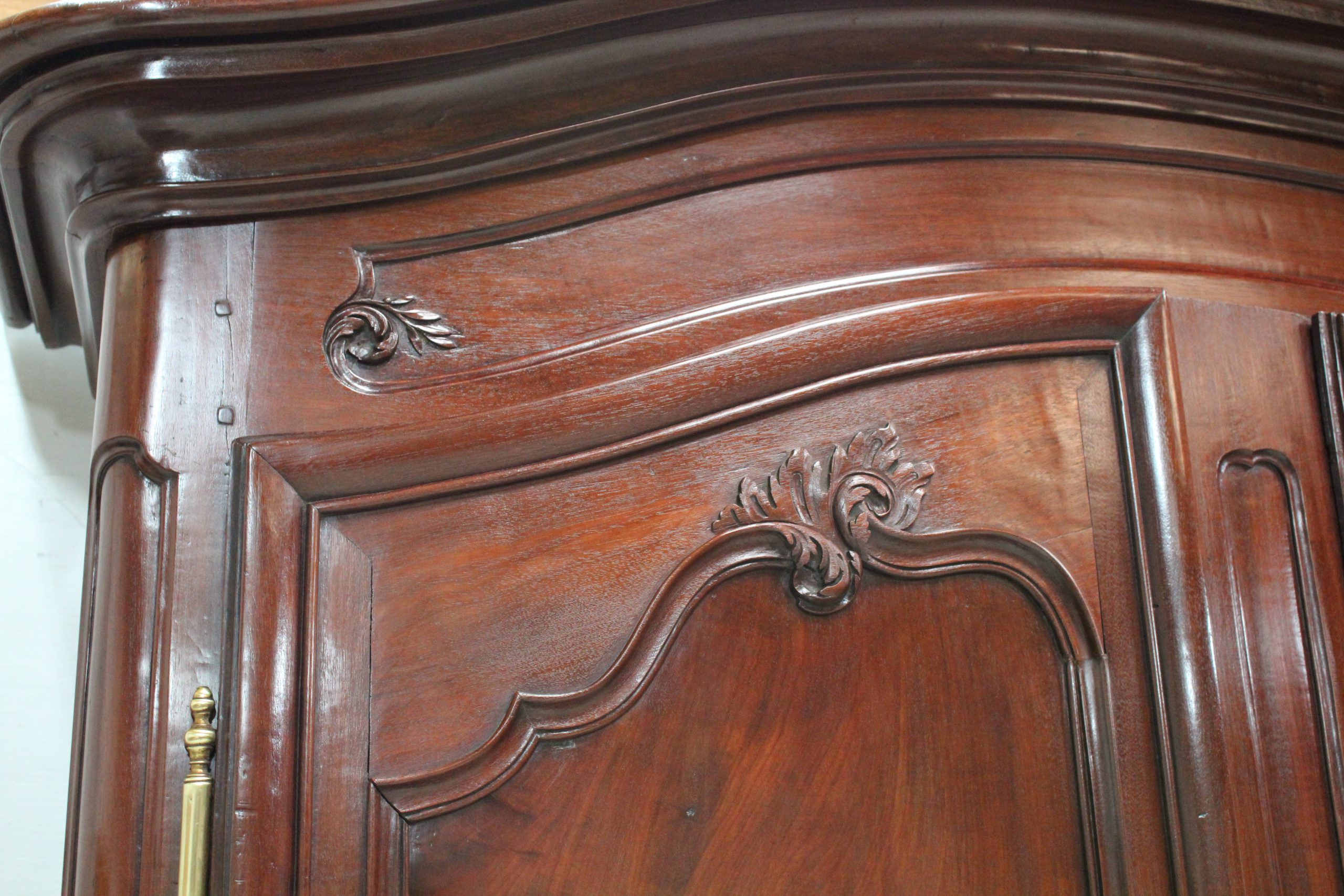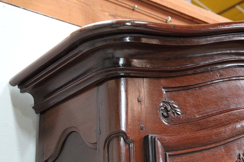 Sa partie haute est coiffée d’une corniche en chapeau de gendarme à multiple moulures. Elle ouvre par 2 grandes portes à panneaux sculptés et moulurés fermant à clef avec sa serrure d’origine.
