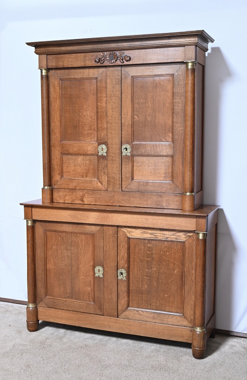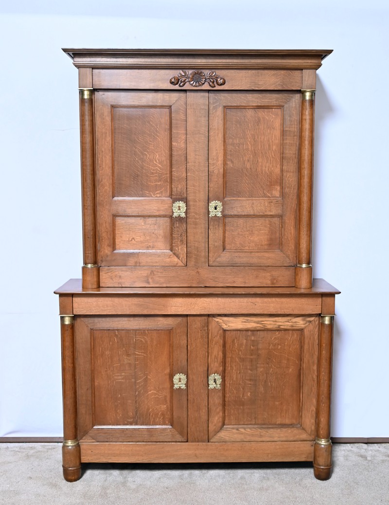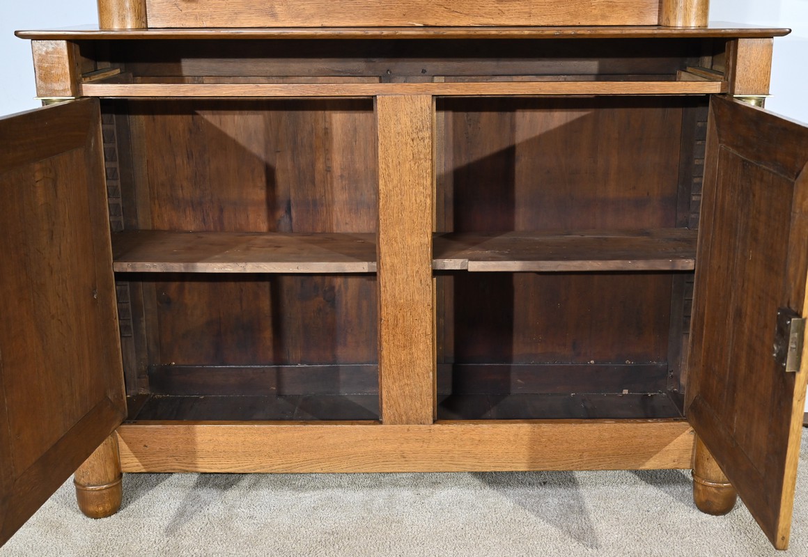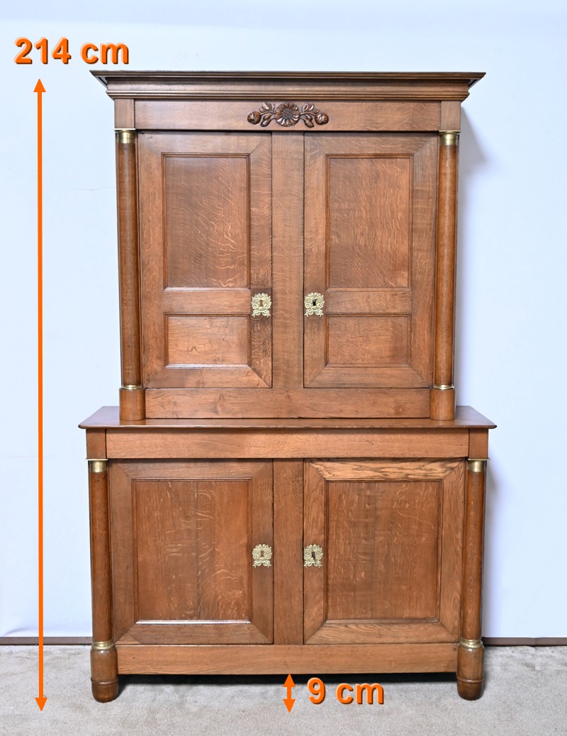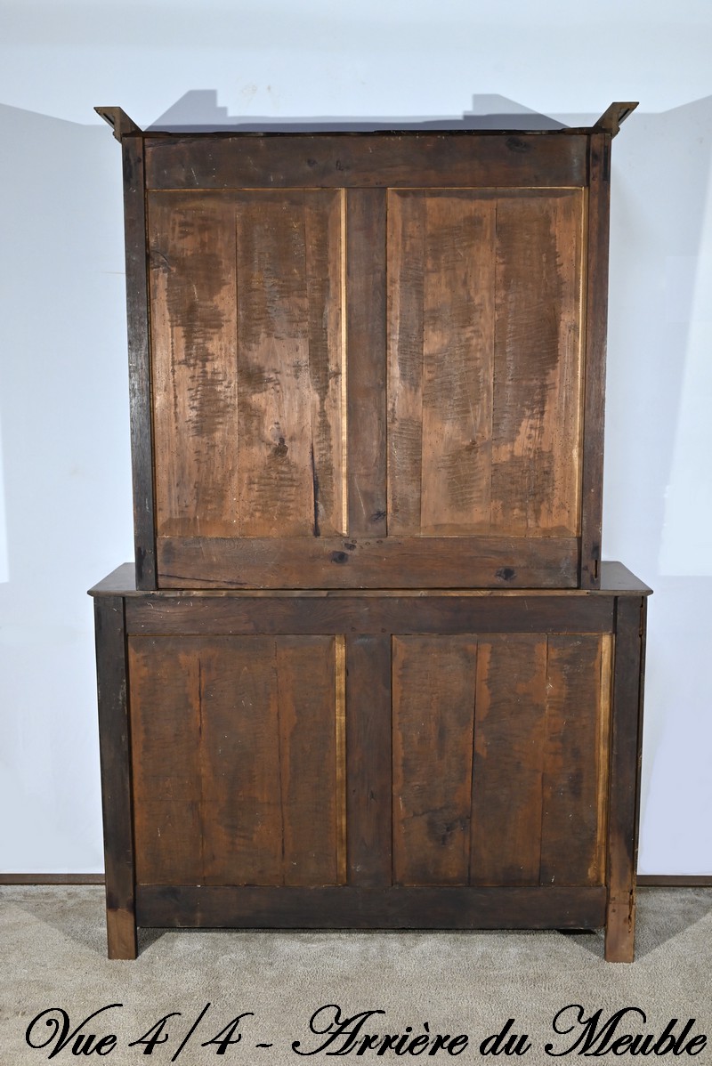 Ce buffet deux-corps ouvre en partie basse par une double porte panneaux à défoncement et à encadrement à coupe d’onglet avec moulure intérieur.