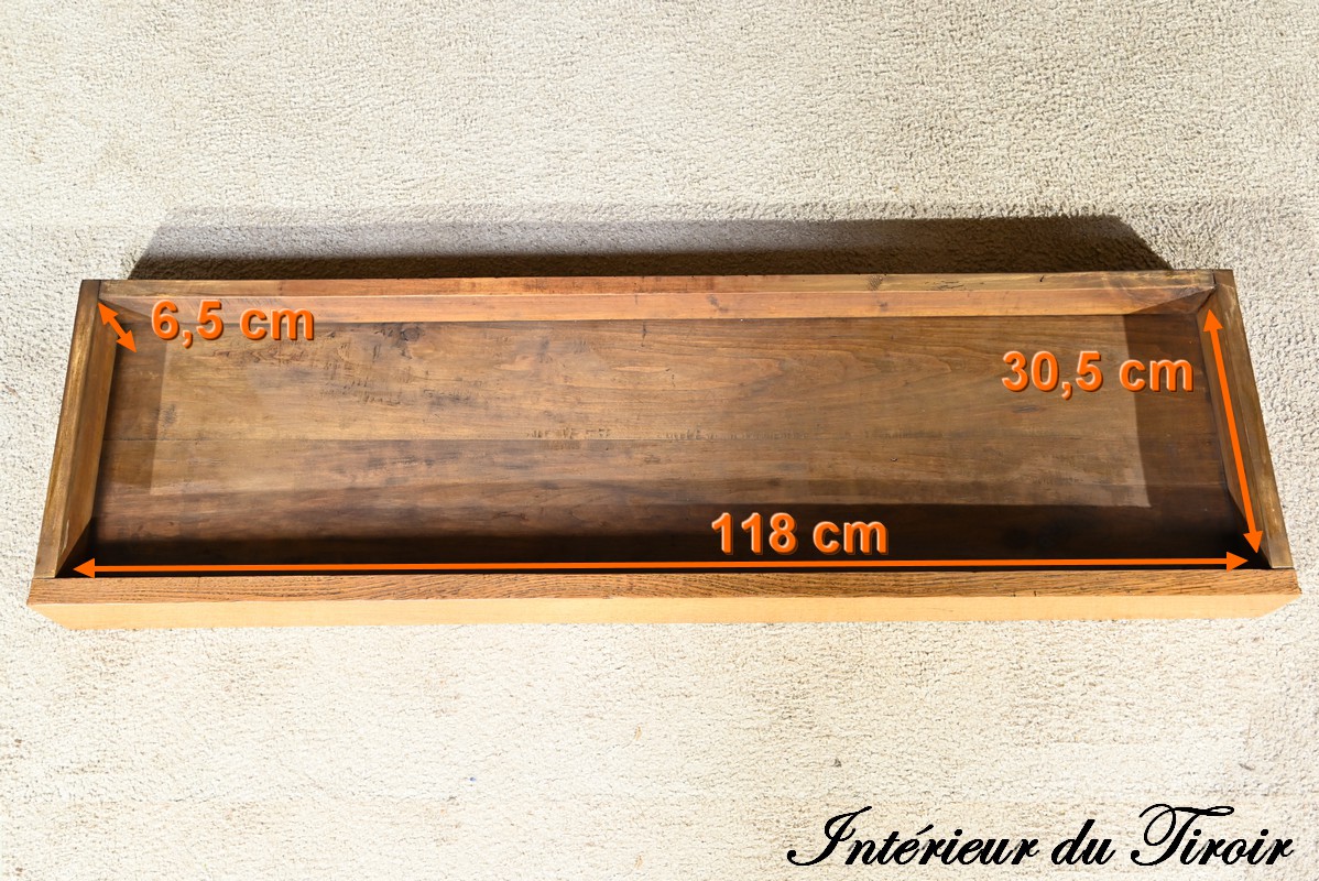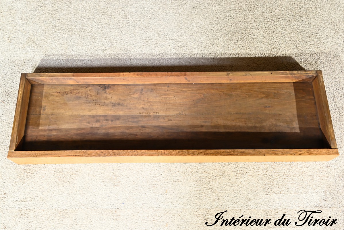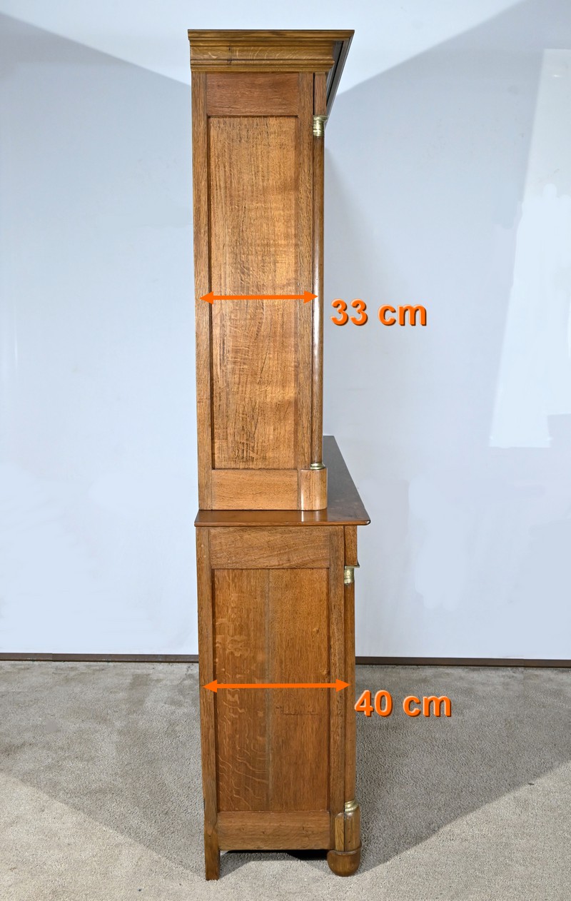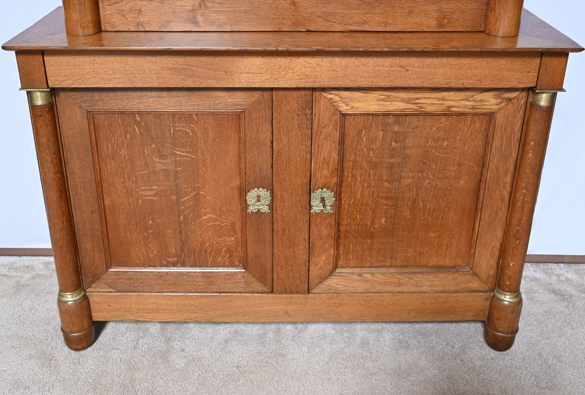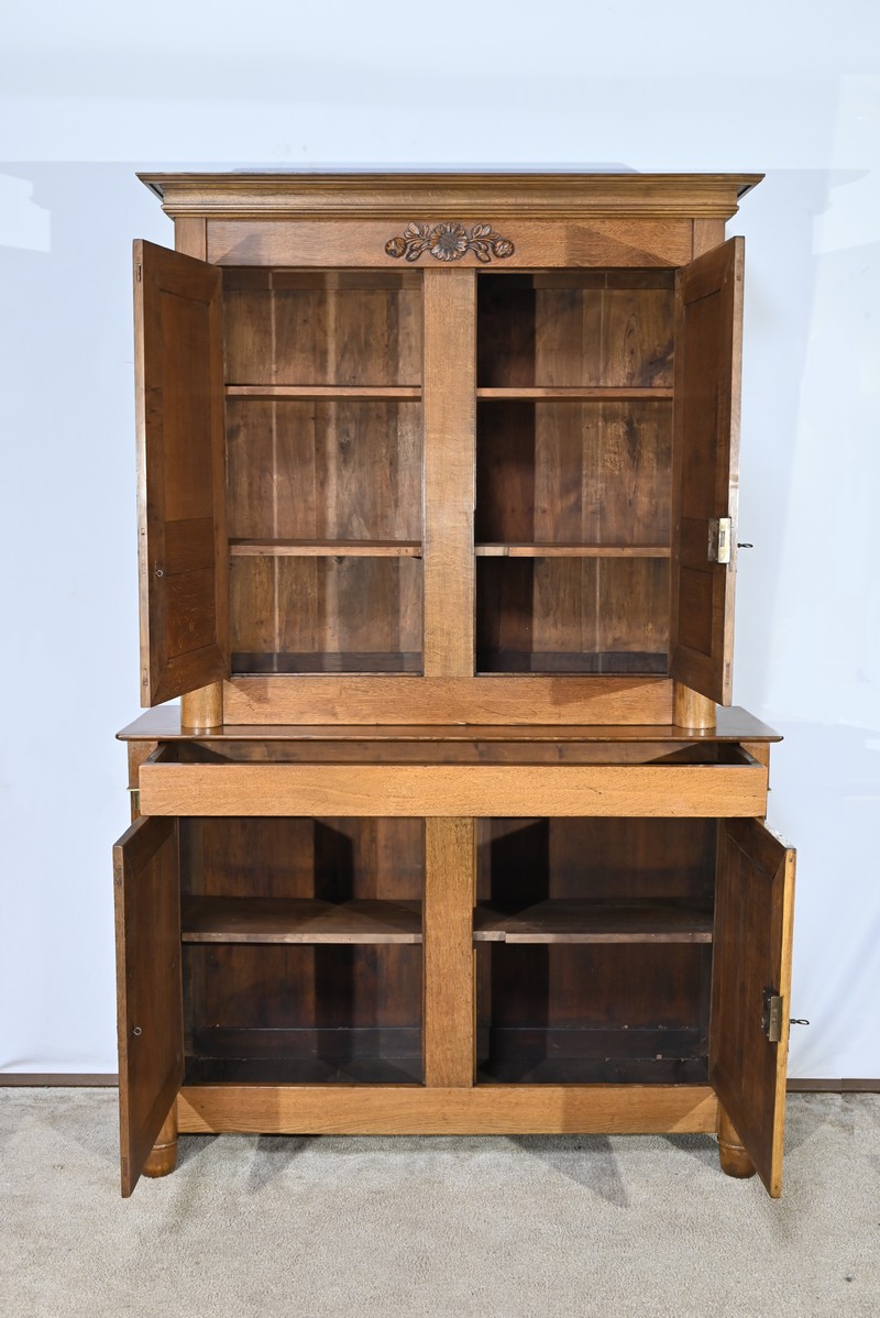 Ce buffet deux-corps ouvre en partie basse par une double porte panneaux à défoncement et à encadrement à coupe d’onglet avec moulure intérieur.