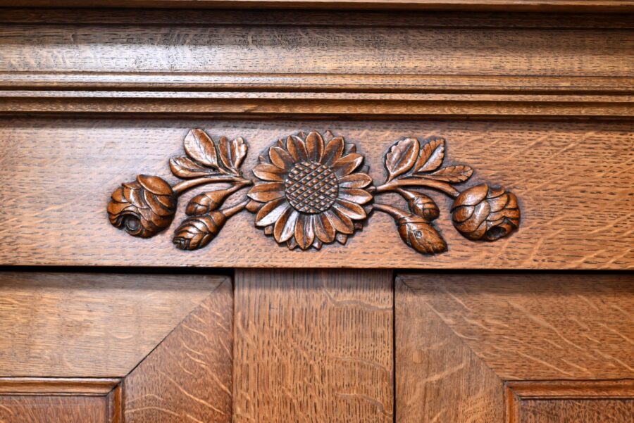 La traverse est agrémentée d’une sculpture en relief à décors de fleurs.