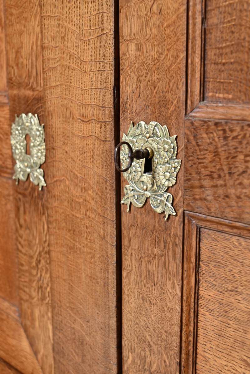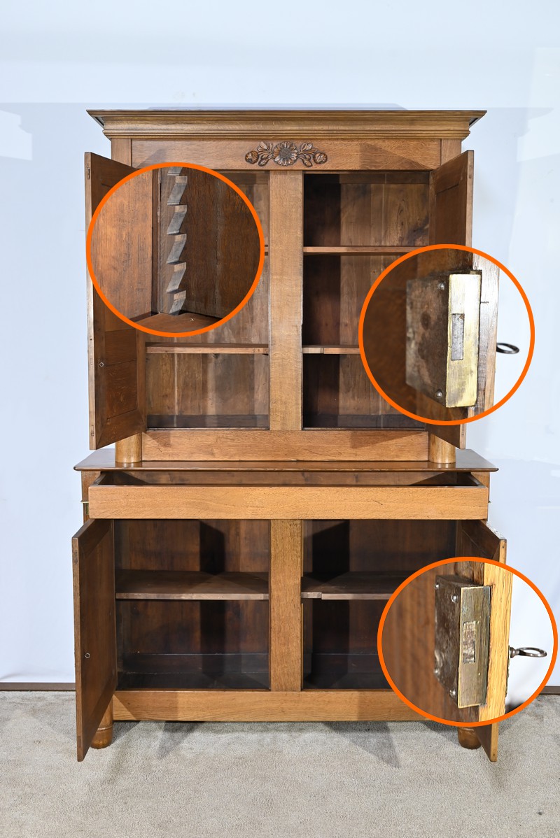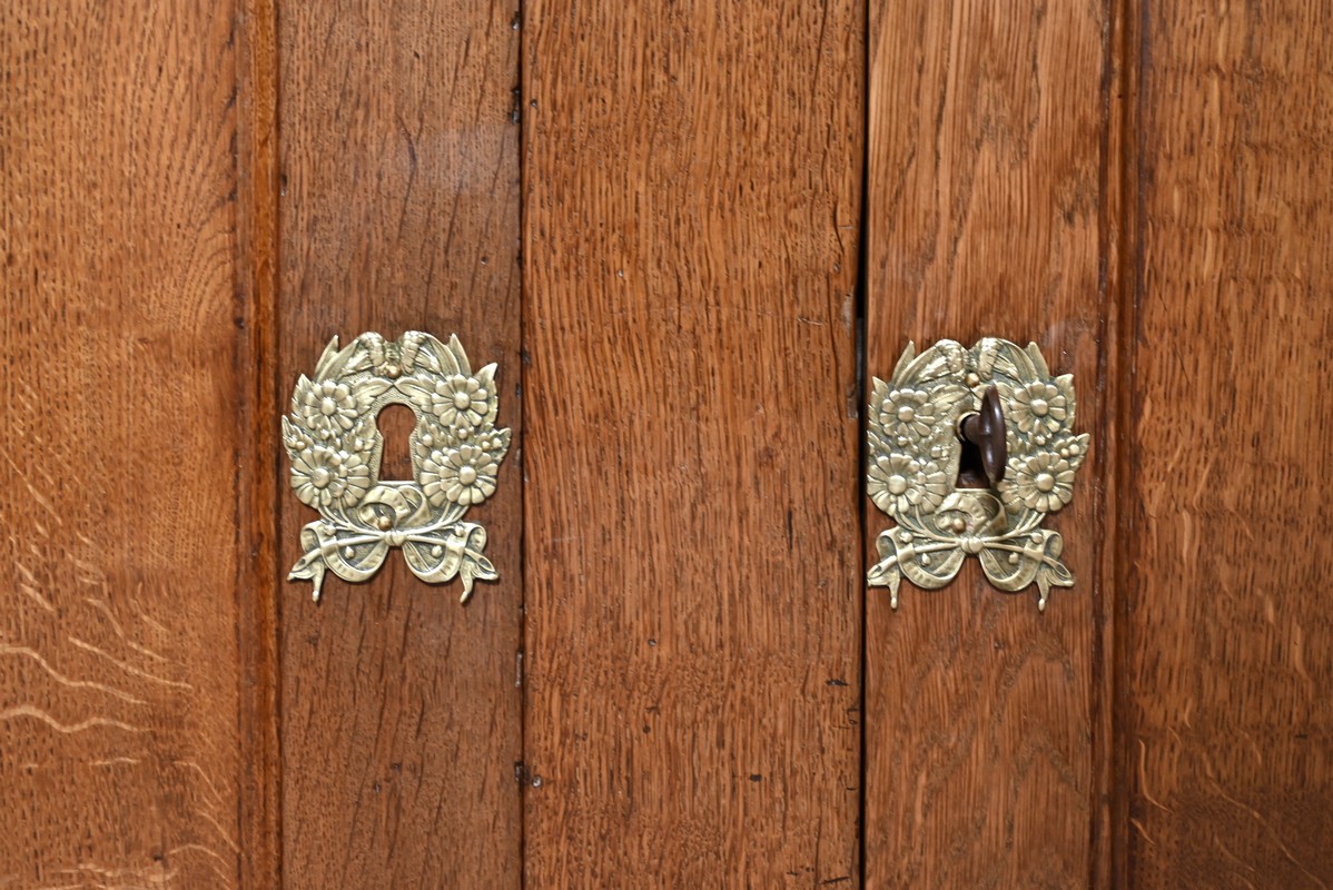 La partie haute de ce meuble en retrait présente également une double ouverture avec petits et grands panneaux moulurés en intérieur, accompagné d’une serrure et d’entrées similaires.
