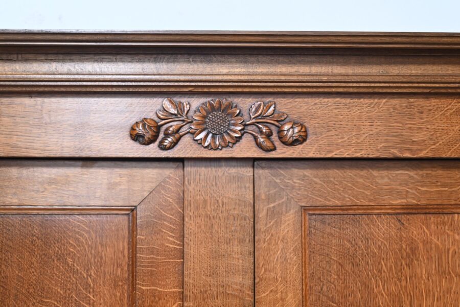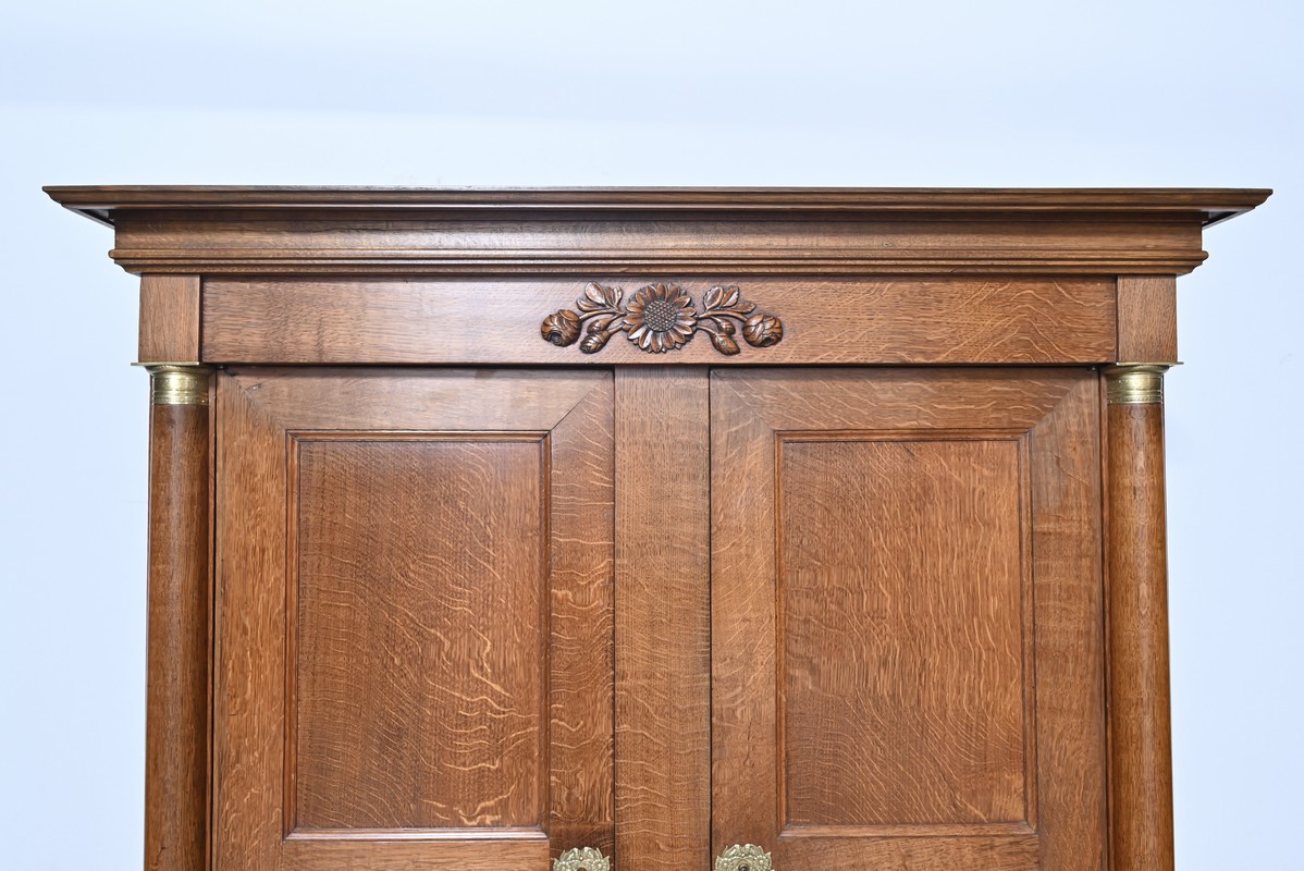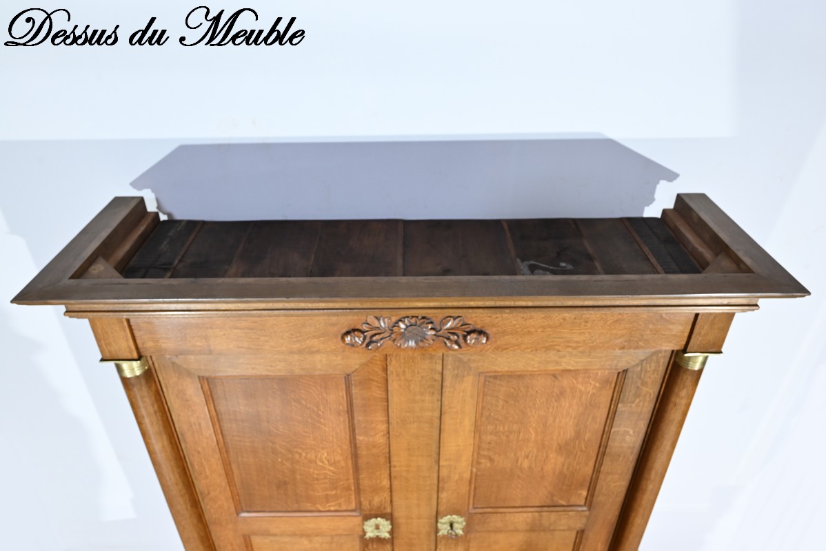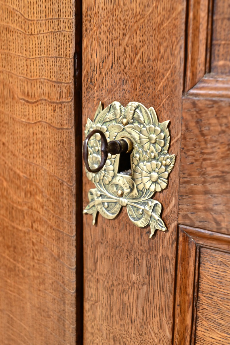 La partie haute de ce meuble en retrait présente également une double ouverture avec petits et grands panneaux moulurés en intérieur, accompagné d’une serrure et d’entrées similaires.