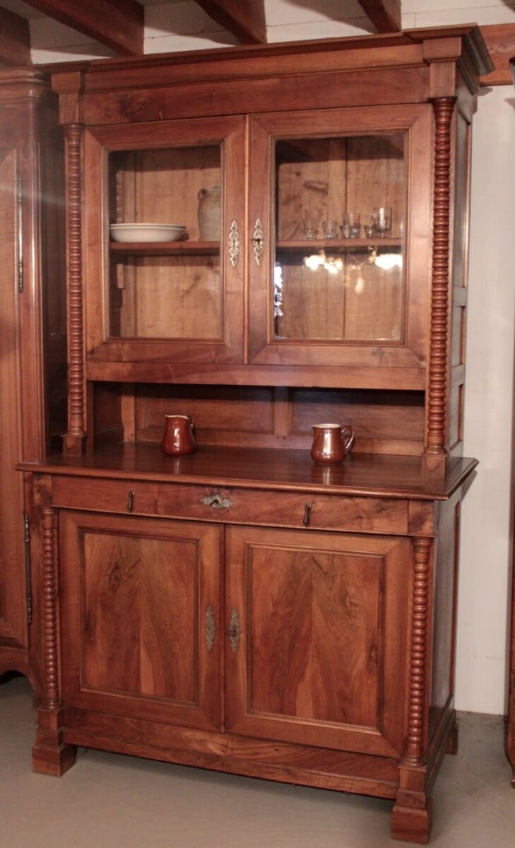 Buffet deux-corps en noyer avec niche au milieu. La partie haute ouvre par 2 portes vitrées , la partie basse par 2 portes pleines et un grand tiroir dans le bandeau. Il repose sur des pieds carrés dans le goût Directoire. Époque : fin XIXe