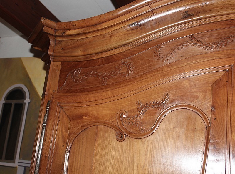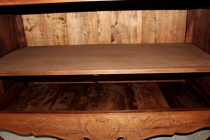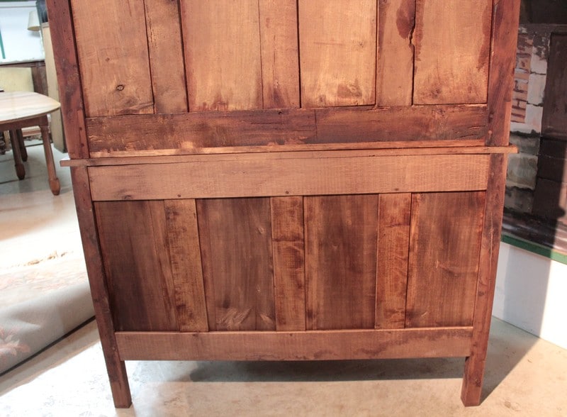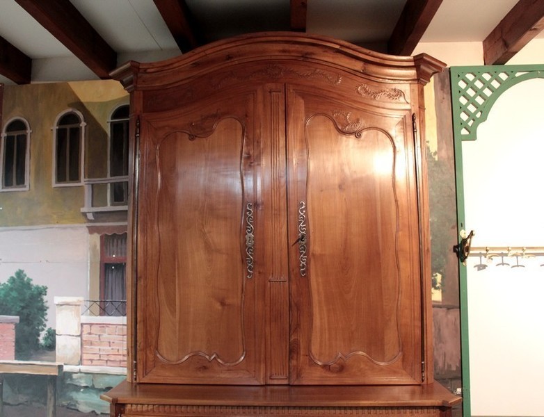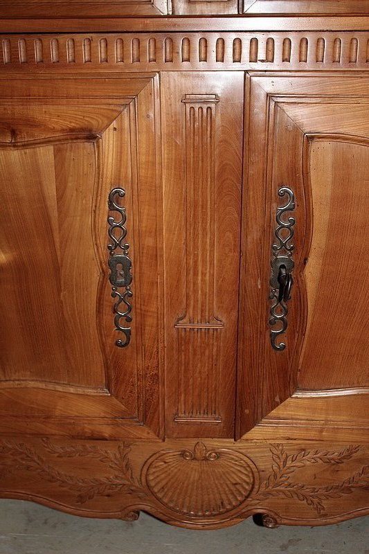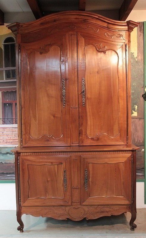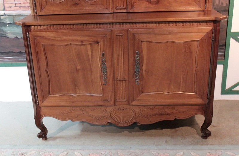 Buffet deux-corps Louis XV en merisier ouvrant par 2 portes en partie haute et 2 portes en partie basse. Sa corniche est en ‘chapeau de gendarme’ et il repose sur des pieds à enroulement à l’avant et droits à l’arrière. Grandes fiches et entrées de serrures en fer. Sculptures sur les traverses haute et basse ainsi que sur les portes. Montants à pans coupés. Majestueux, il a l’élégance des meubles du Val de Loire.