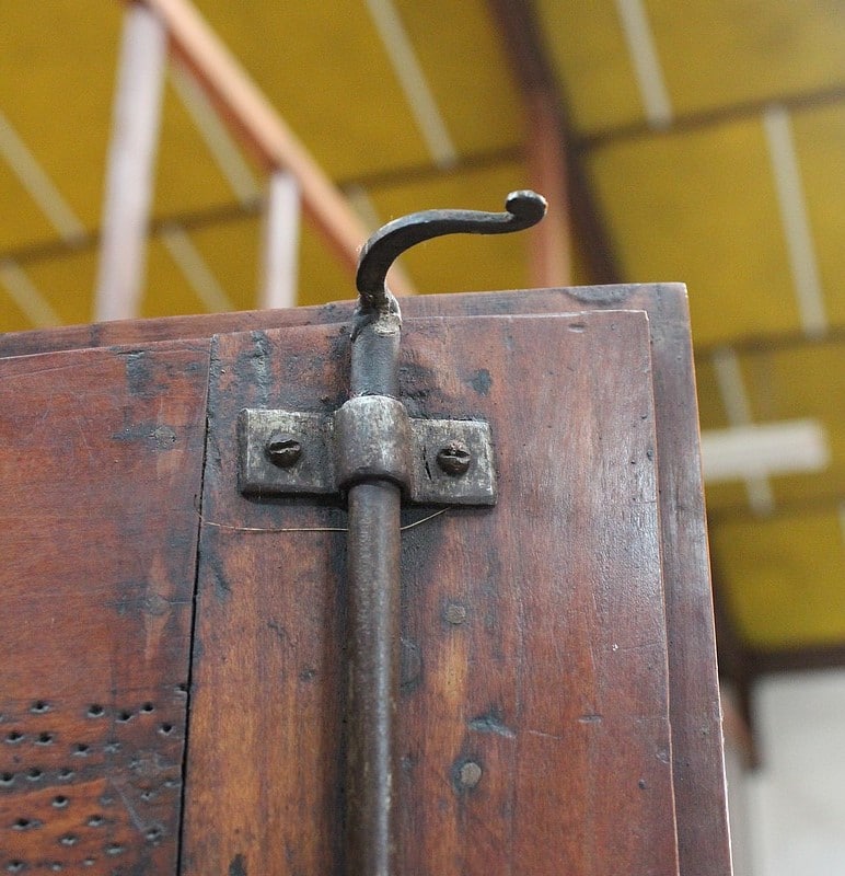 Les vantaux du premier Corps sont, en partie haute, légèrement galbés et présentent d’étonnants poinçonnages Décoratifs. Le dormant arbore en son centre un cercle sculpté, ornement que l’on retrouve également sur ses angles à pans coupés, caractéristiques du règne du Roi Soleil.