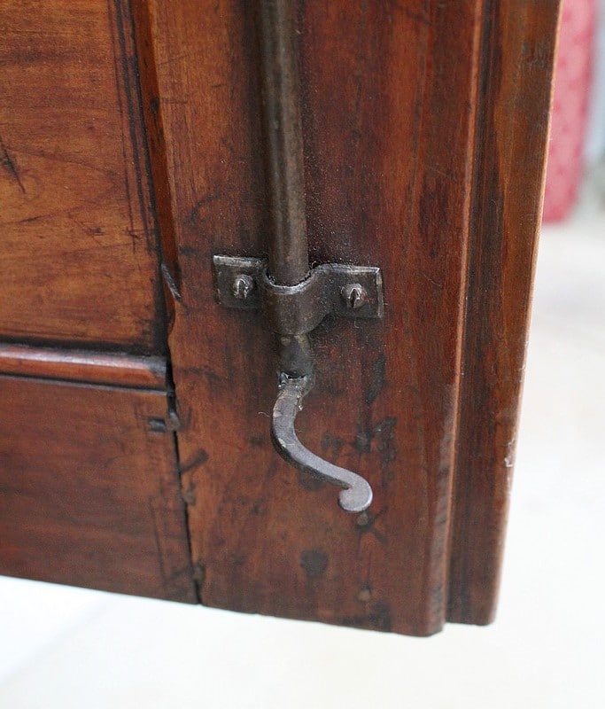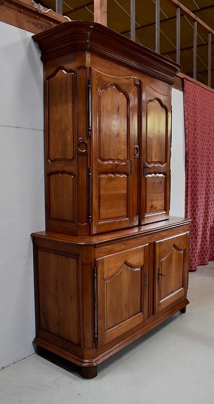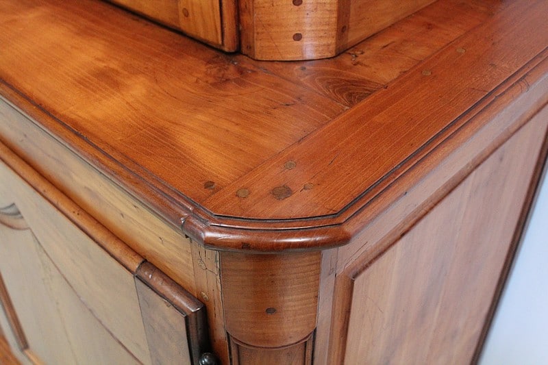 Chacun de ces éléments ouvre par deux portes, découpées avec moulures et plates bandes, tout comme les côtés du meuble. Elles sont dotées d’entrées de serrures et de fiches en fer d’époque. Elles se verrouillent et ce Buffet est fourni avec ses deux clés d’origine.