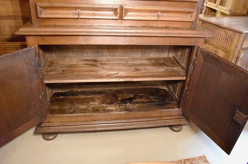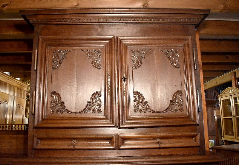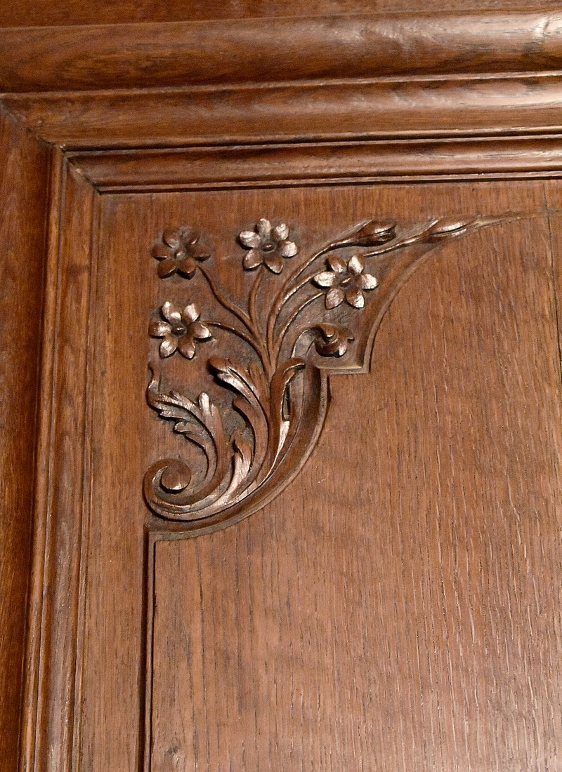 Il ouvre en partie haute par 2 portes avec leur serrure d’origine , celles-ci sont sculptées de rinceaux et de fleurs et moulurées. L’intérieur est garni d’une étagère posée sur tasseaux fixes.