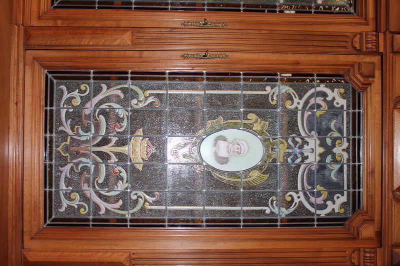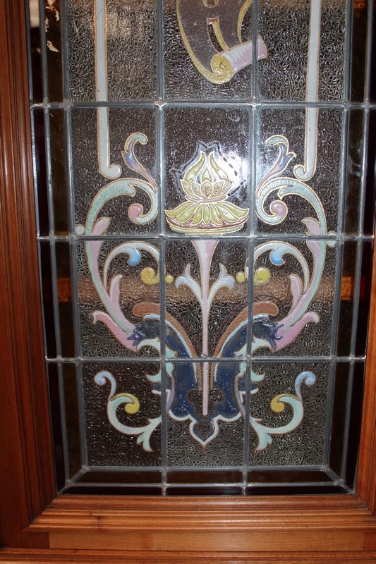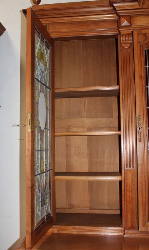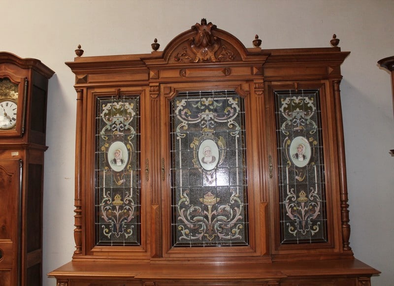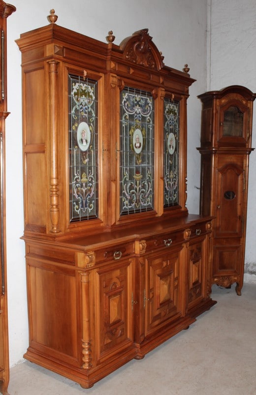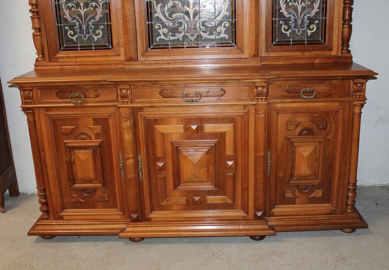 Important meuble deux-corps en noyer ouvrant par 3 portes garnies de vitraux ornés de médaillons en partie haute et 3 portes pleines surmontées de 3 tiroirs en partie basse.