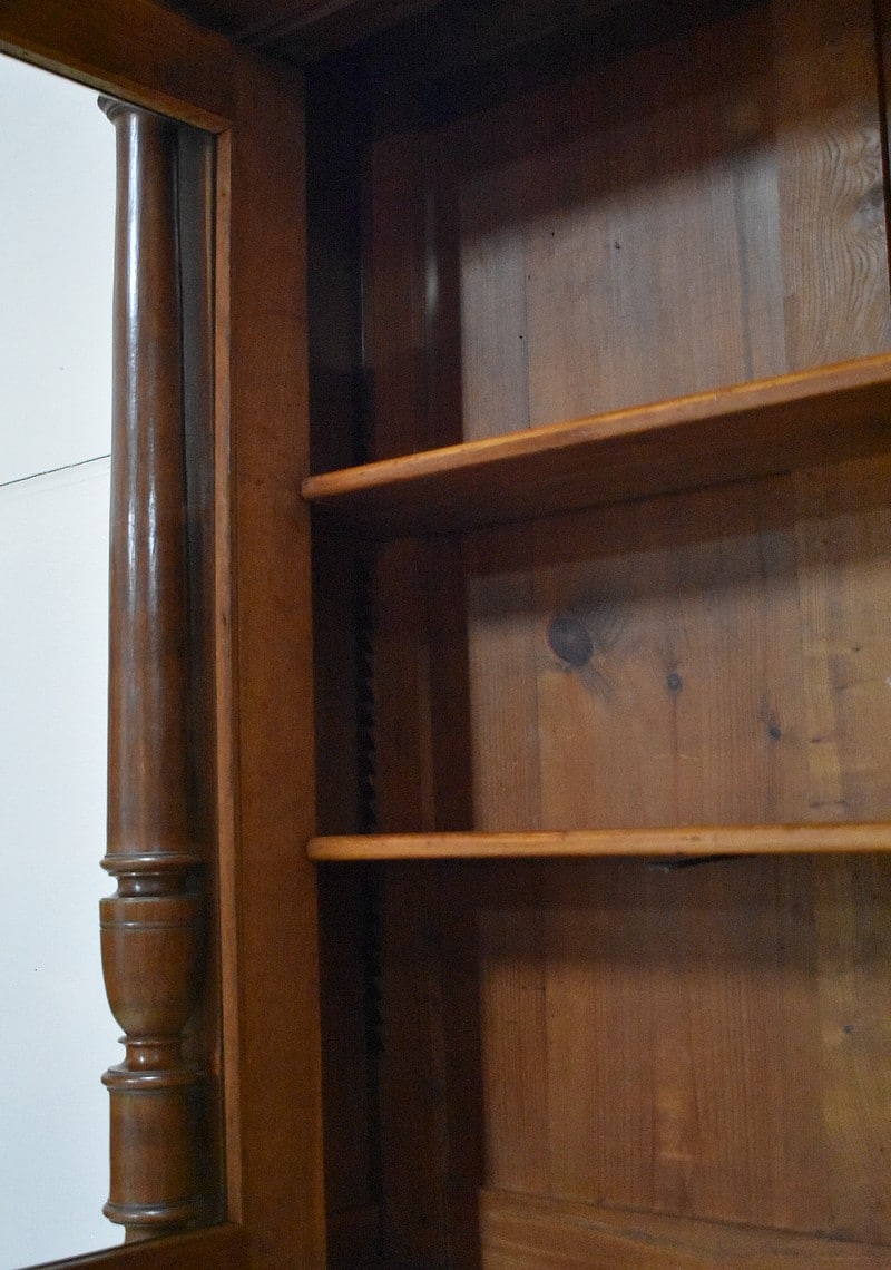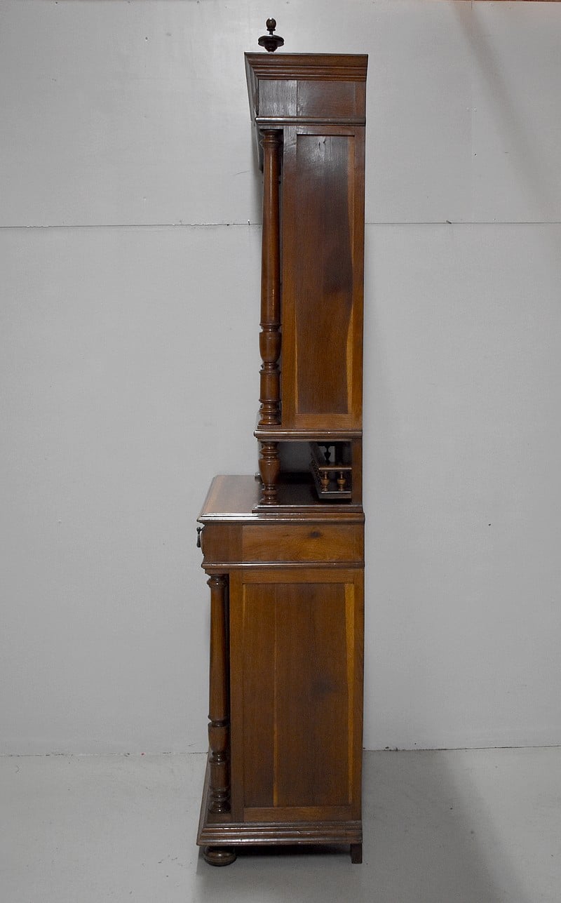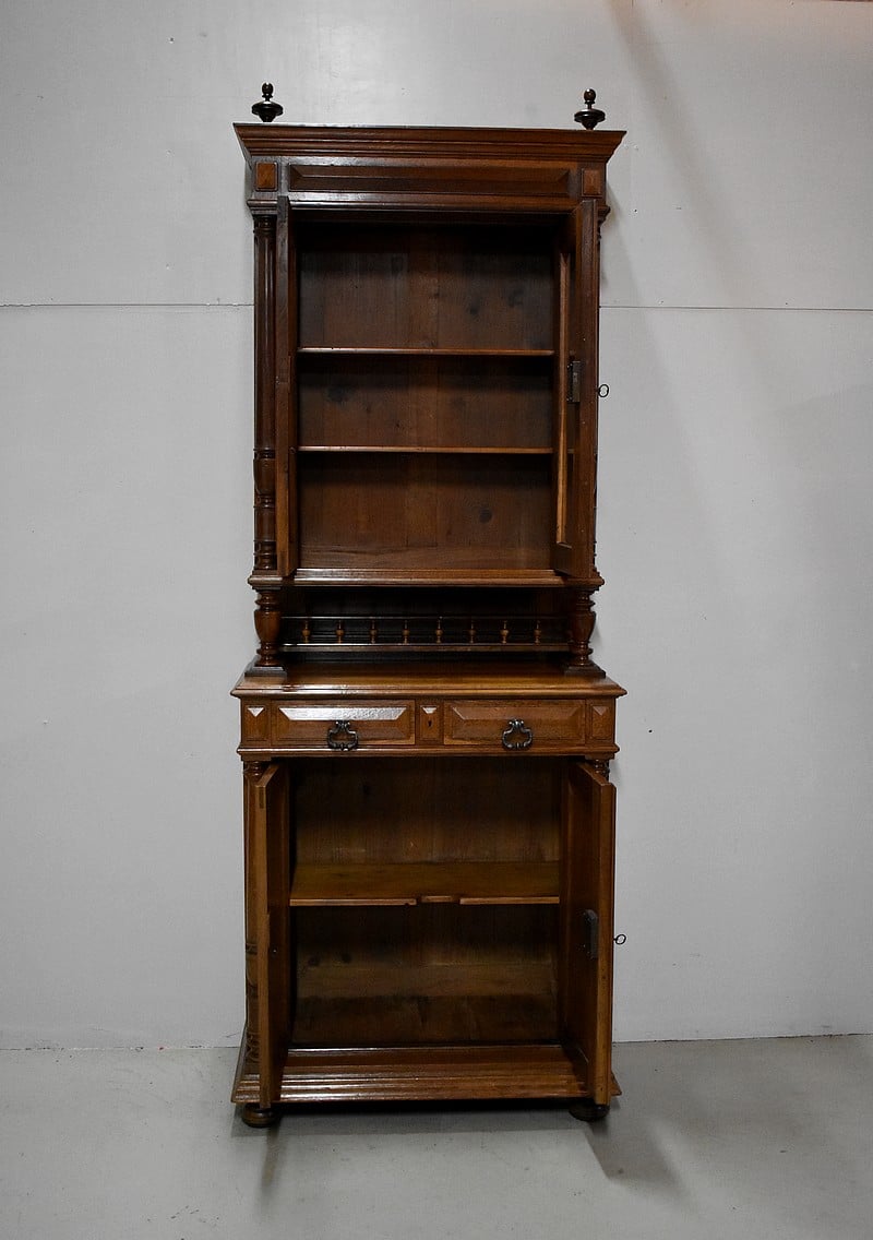 La partie haute à décors de toupies sur sa corniche, ouvre par deux portes vitrées d’origine et fermant à clef, donnant sur deux étagères amovibles posées sur crémaillères.